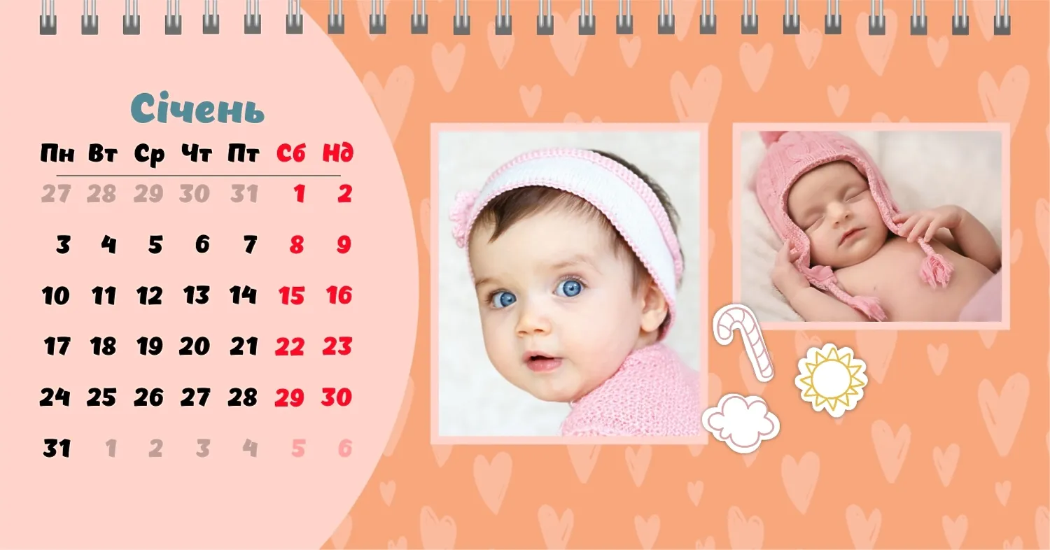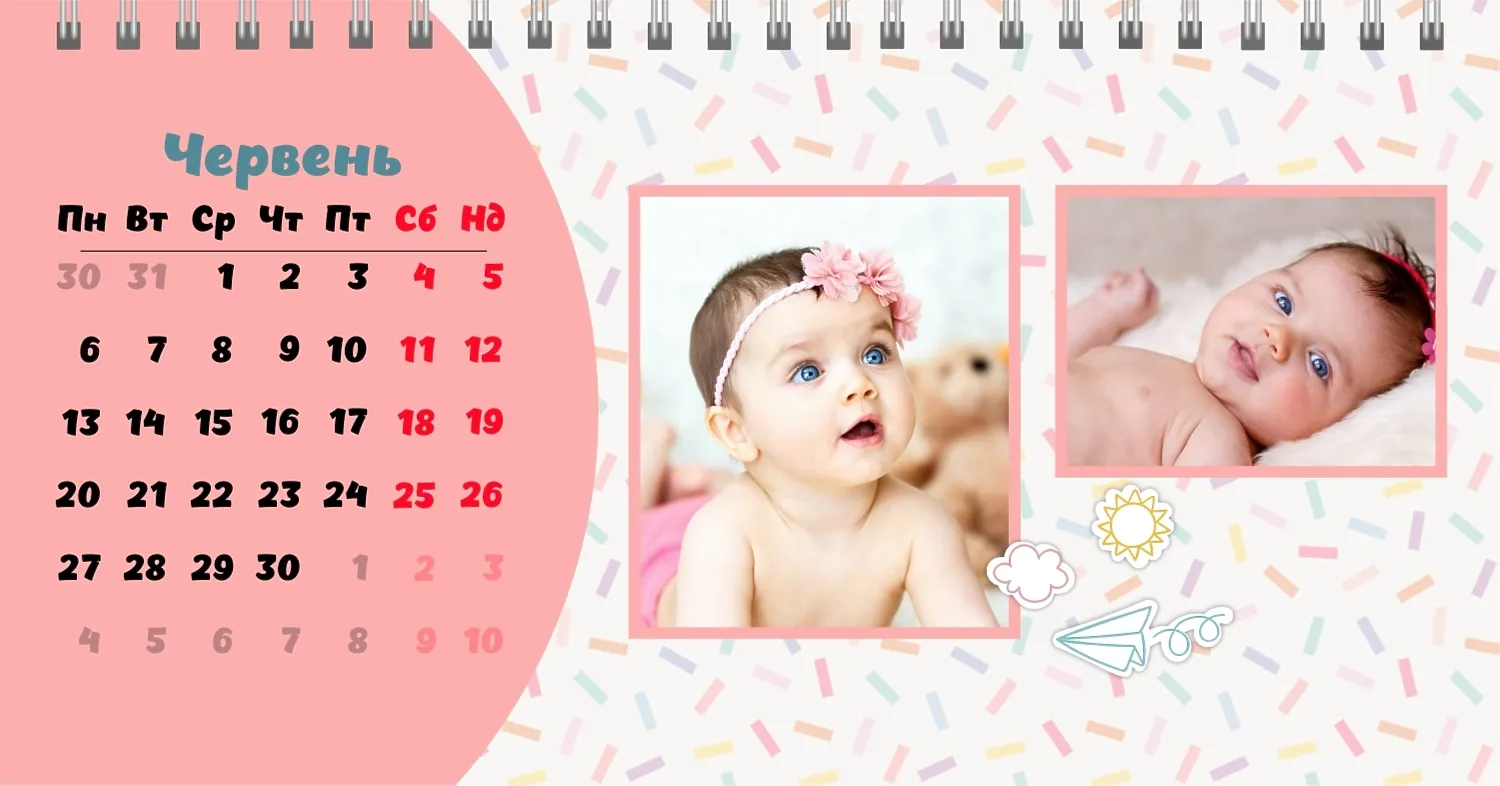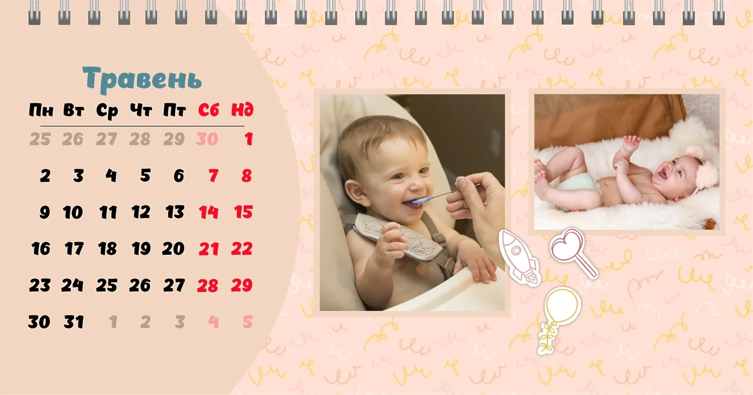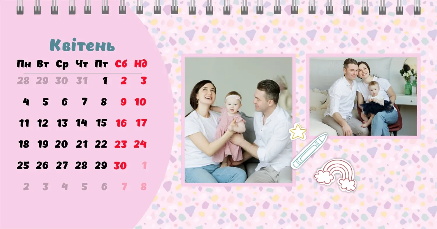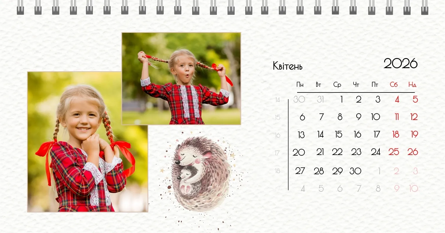Готовий шаблон настільного перекидного календаря з фото дітей і милим декоративним оформленням створений для тих, хто цінує теплі сімейні емоції і хоче перетворити звичайний календар в затишний персональний аксесуар. Ніжні пастельні відтінки, акуратні ілюстрації, дитячі елементи декору і акцент на фотографії роблять такий календар особливо привабливим для батьків, вихователів, педагогів творчих студій, дитячих фотографів і всіх, хто працює з дітьми або створює для них контент. Він підходить для сімейних архівів, дитячих садків, центрів розвитку та невеликих студій, які хочуть запропонувати клієнтам приємний та емоційний продукт. У нашому онлайн-конструкторі цей шаблон легко перетворити під власні завдання. Ви можете замінити фотографії, змінювати розташування елементів, редагувати написи, вибирати інші шрифти і відтінки, додавати декоративні вставки або навпаки — прибирати зайві, щоб створити більш минималистичную композицію. Кожен місяць можна оформити по-різному, додавши важливі дати, індивідуальні примітки або невеликі картинки, які підкреслюють характер дитини або тематику фото.