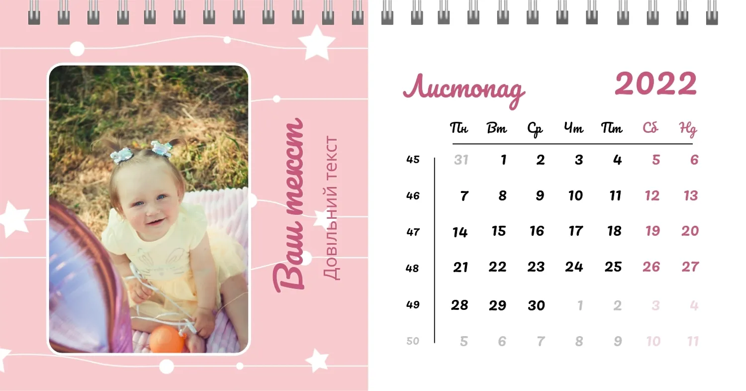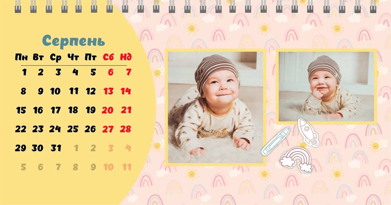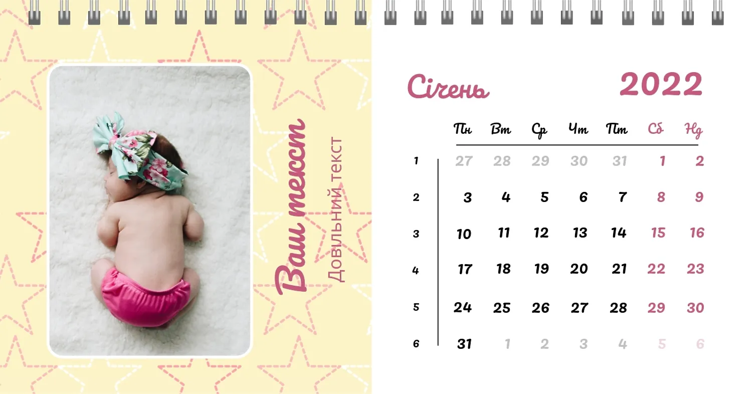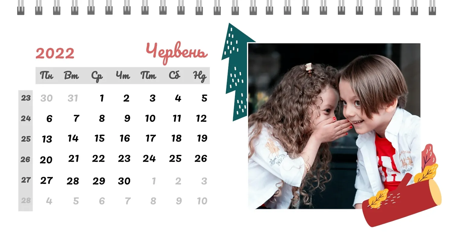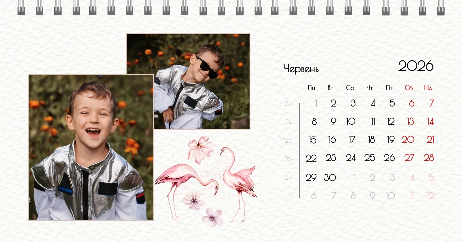 Готовий шаблон настільного перекидного календаря з фото дітей і милим декоративним оформленням створений для тих, хто цінує теплі сімейні емоції і хоче перетворити звичайний календар в затишний персональний аксесуар. Ніжні пастельні відтінки, акуратні ілюстрації, дитячі елементи декору і акцент на фотографії роблять такий календар особливо привабливим для батьків, вихователів, педагогів творчих студій, дитячих фотографів і всіх, хто працює з дітьми або створює для них контент. Він підходить для сімейних архівів, дитячих садків, центрів розвитку та невеликих студій, які хочуть запропонувати клієнтам приємний та емоційний продукт. У нашому онлайн-конструкторі цей шаблон легко перетворити під власні завдання. Ви можете замінити фотографії, змінювати розташування елементів, редагувати написи, вибирати інші шрифти і відтінки, додавати декоративні вставки або навпаки — прибирати зайві, щоб створити більш минималистичную композицію. Кожен місяць можна оформити по-різному, додавши важливі дати, індивідуальні примітки або невеликі картинки, які підкреслюють характер дитини або тематику фото.