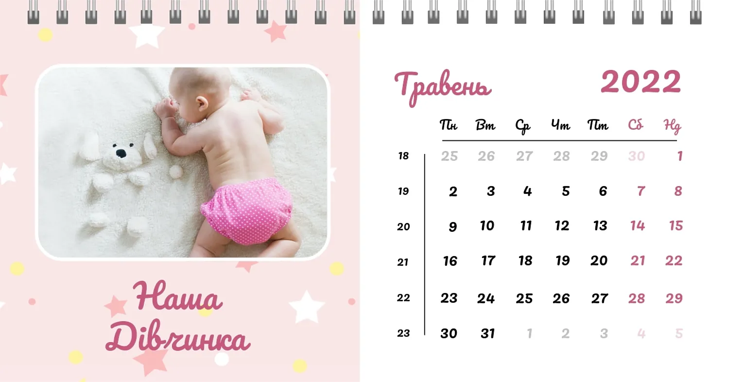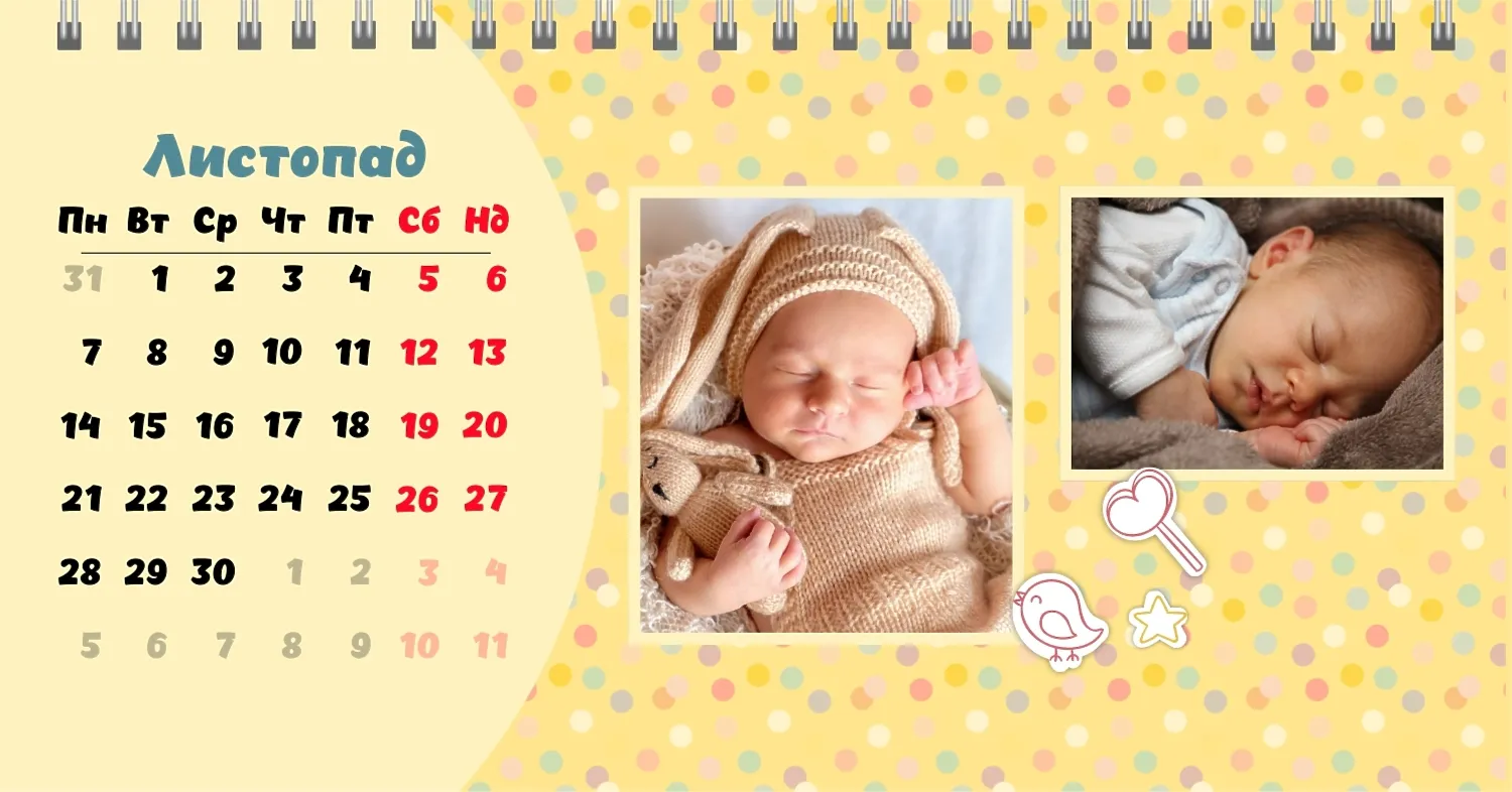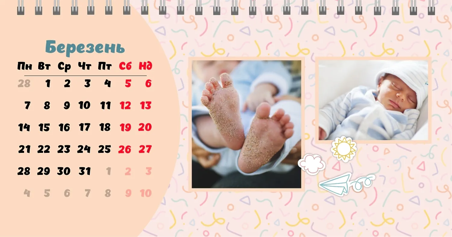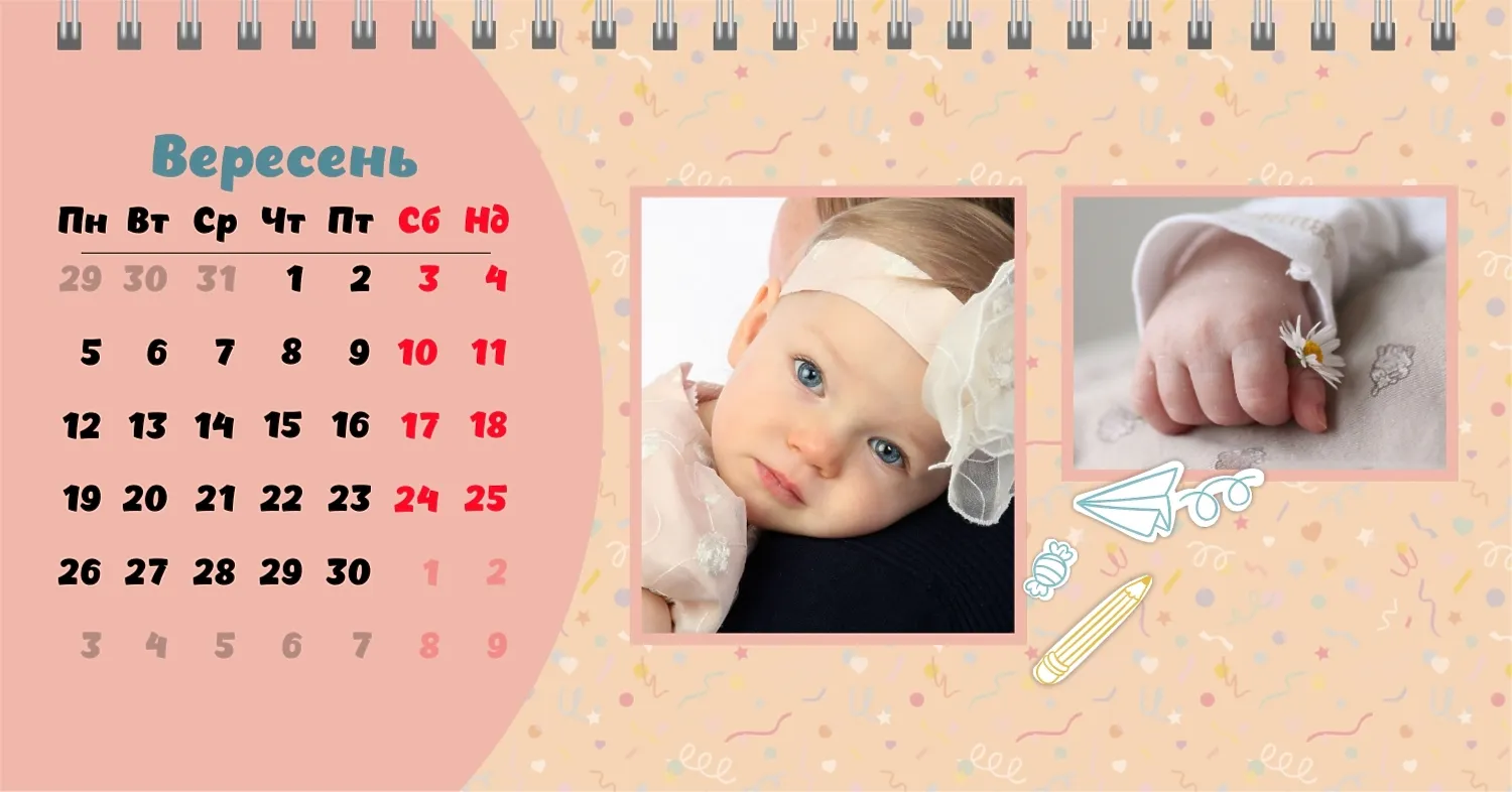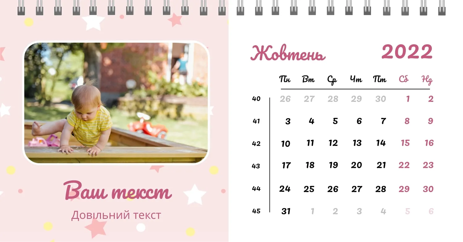 Готовий шаблон настільного перекидного календаря з фото дітей і милим декоративним оформленням створений для тих, хто цінує теплі сімейні емоції і хоче перетворити звичайний календар в затишний персональний аксесуар. Ніжні пастельні відтінки, акуратні ілюстрації, дитячі елементи декору і акцент на фотографії роблять такий календар особливо привабливим для батьків, вихователів, педагогів творчих студій, дитячих фотографів і всіх, хто працює з дітьми або створює для них контент. Він підходить для сімейних архівів, дитячих садків, центрів розвитку та невеликих студій, які хочуть запропонувати клієнтам приємний та емоційний продукт. У нашому онлайн-конструкторі цей шаблон легко перетворити під власні завдання. Ви можете замінити фотографії, змінювати розташування елементів, редагувати написи, вибирати інші шрифти і відтінки, додавати декоративні вставки або навпаки — прибирати зайві, щоб створити більш минималистичную композицію. Кожен місяць можна оформити по-різному, додавши важливі дати, індивідуальні примітки або невеликі картинки, які підкреслюють характер дитини або тематику фото.