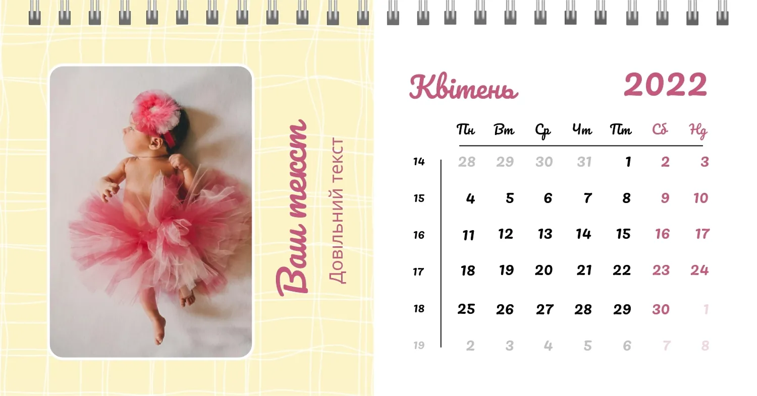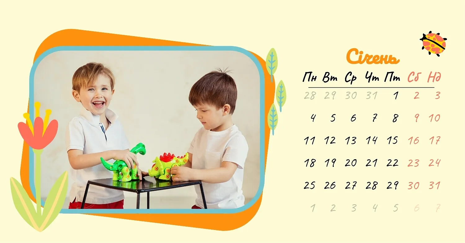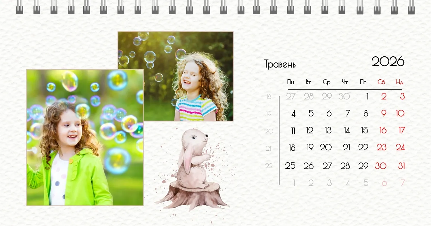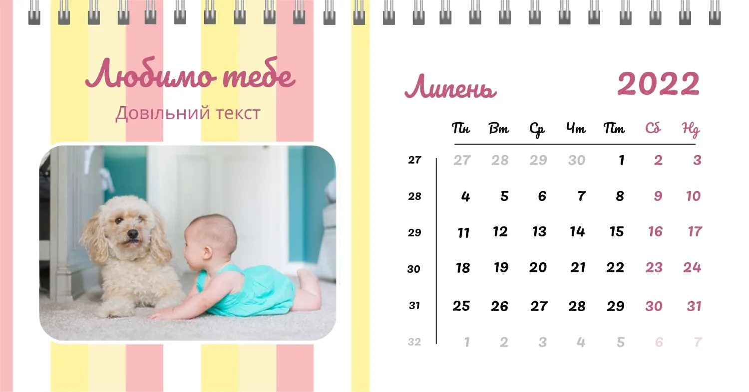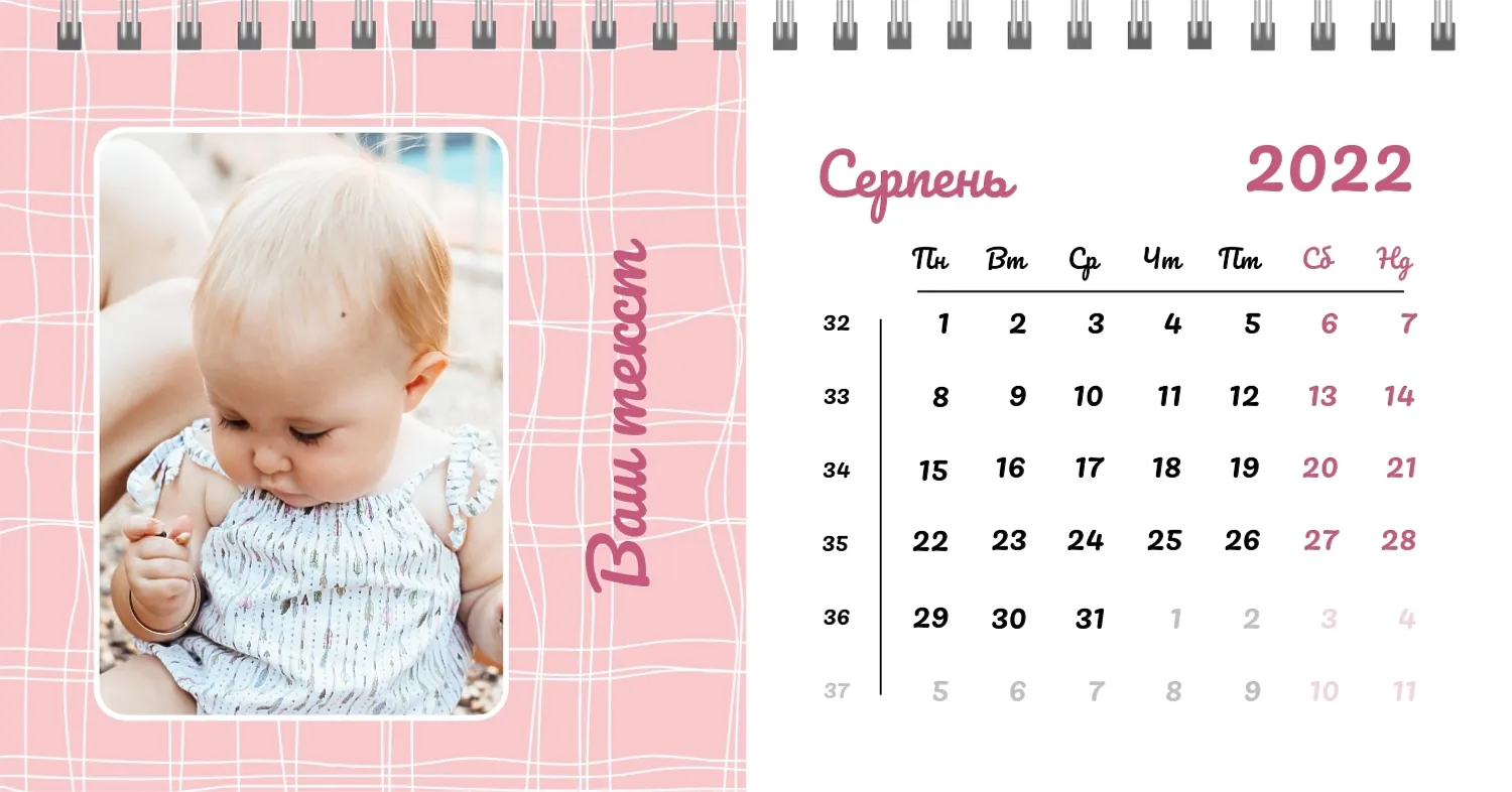 Готовий шаблон настільного перекидного календаря з фото дітей і милим декоративним оформленням створений для тих, хто цінує теплі сімейні емоції і хоче перетворити звичайний календар в затишний персональний аксесуар. Ніжні пастельні відтінки, акуратні ілюстрації, дитячі елементи декору і акцент на фотографії роблять такий календар особливо привабливим для батьків, вихователів, педагогів творчих студій, дитячих фотографів і всіх, хто працює з дітьми або створює для них контент. Він підходить для сімейних архівів, дитячих садків, центрів розвитку та невеликих студій, які хочуть запропонувати клієнтам приємний та емоційний продукт. У нашому онлайн-конструкторі цей шаблон легко перетворити під власні завдання. Ви можете замінити фотографії, змінювати розташування елементів, редагувати написи, вибирати інші шрифти і відтінки, додавати декоративні вставки або навпаки — прибирати зайві, щоб створити більш минималистичную композицію. Кожен місяць можна оформити по-різному, додавши важливі дати, індивідуальні примітки або невеликі картинки, які підкреслюють характер дитини або тематику фото.