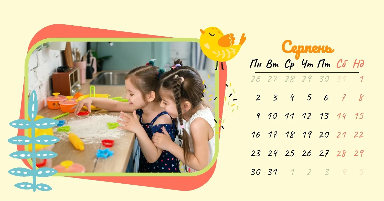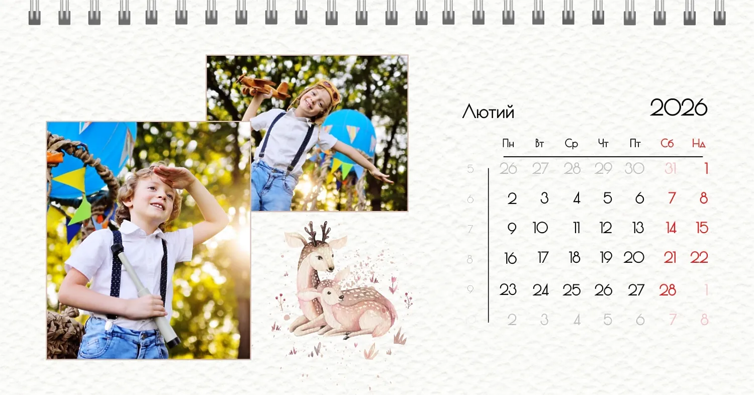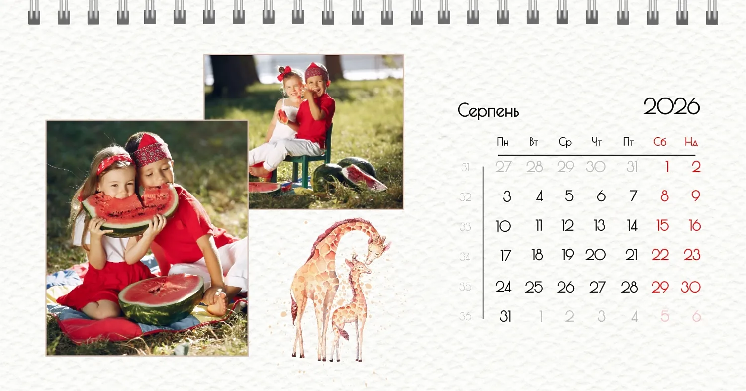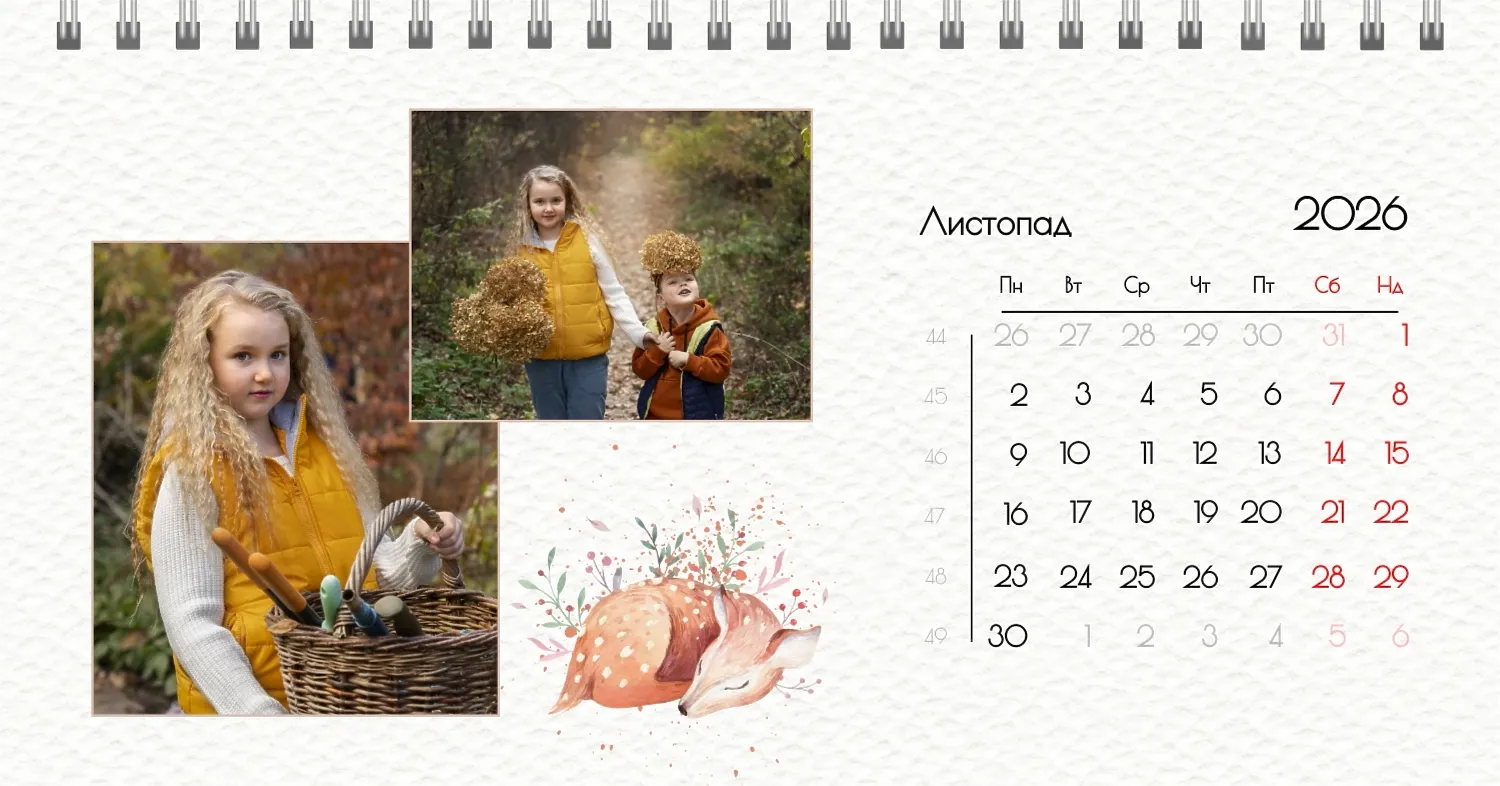 Готовий шаблон настільного перекидного календаря з фото дітей і милим декоративним оформленням створений для тих, хто цінує теплі сімейні емоції і хоче перетворити звичайний календар в затишний персональний аксесуар. Ніжні пастельні відтінки, акуратні ілюстрації, дитячі елементи декору і акцент на фотографії роблять такий календар особливо привабливим для батьків, вихователів, педагогів творчих студій, дитячих фотографів і всіх, хто працює з дітьми або створює для них контент. Він підходить для сімейних архівів, дитячих садків, центрів розвитку та невеликих студій, які хочуть запропонувати клієнтам приємний та емоційний продукт. У нашому онлайн-конструкторі цей шаблон легко перетворити під власні завдання. Ви можете замінити фотографії, змінювати розташування елементів, редагувати написи, вибирати інші шрифти і відтінки, додавати декоративні вставки або навпаки — прибирати зайві, щоб створити більш минималистичную композицію. Кожен місяць можна оформити по-різному, додавши важливі дати, індивідуальні примітки або невеликі картинки, які підкреслюють характер дитини або тематику фото.