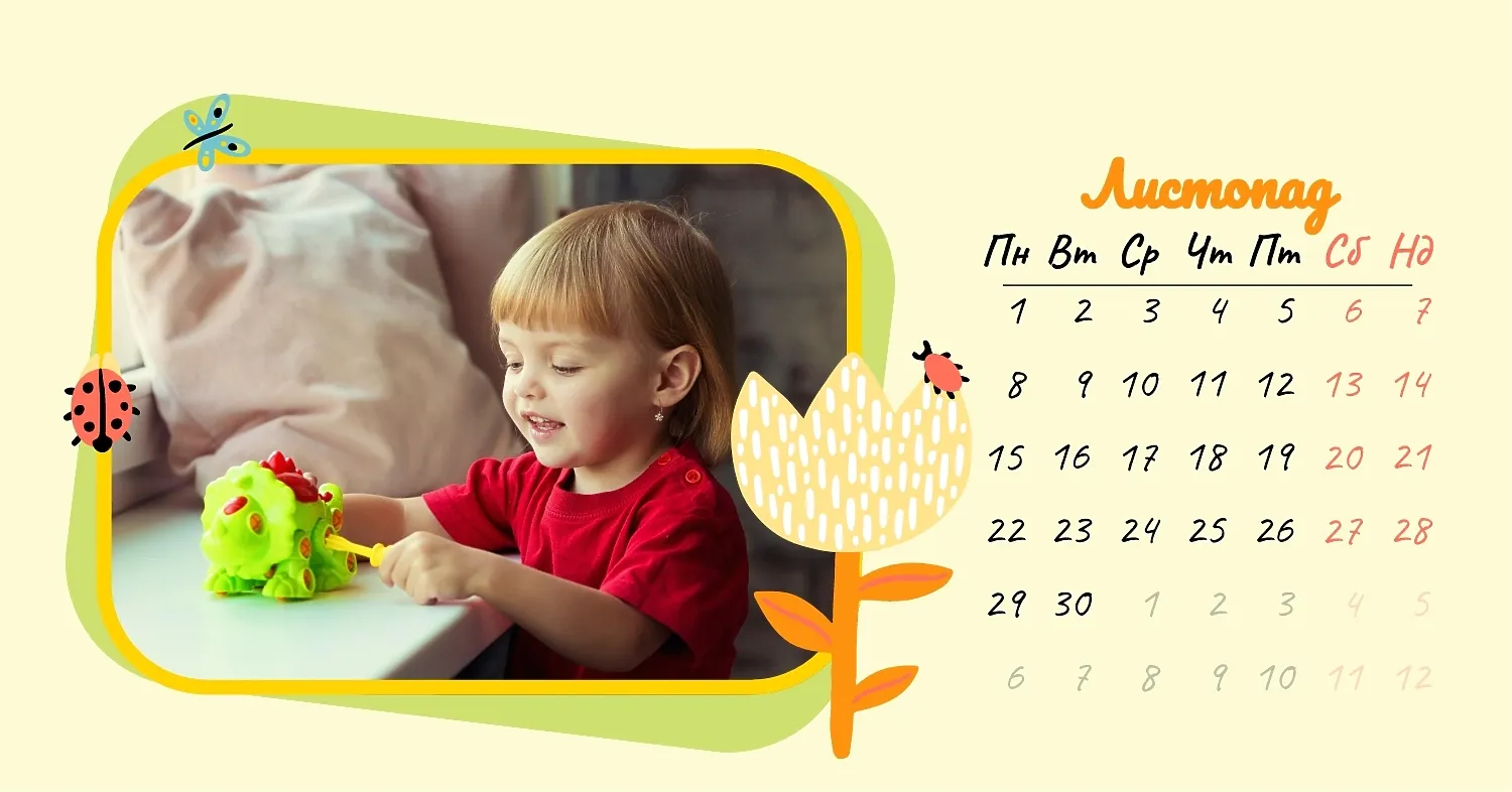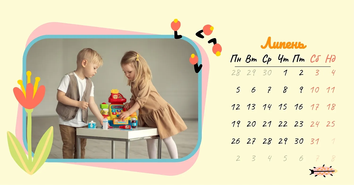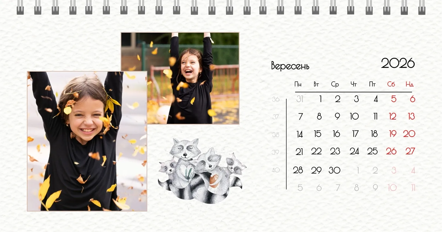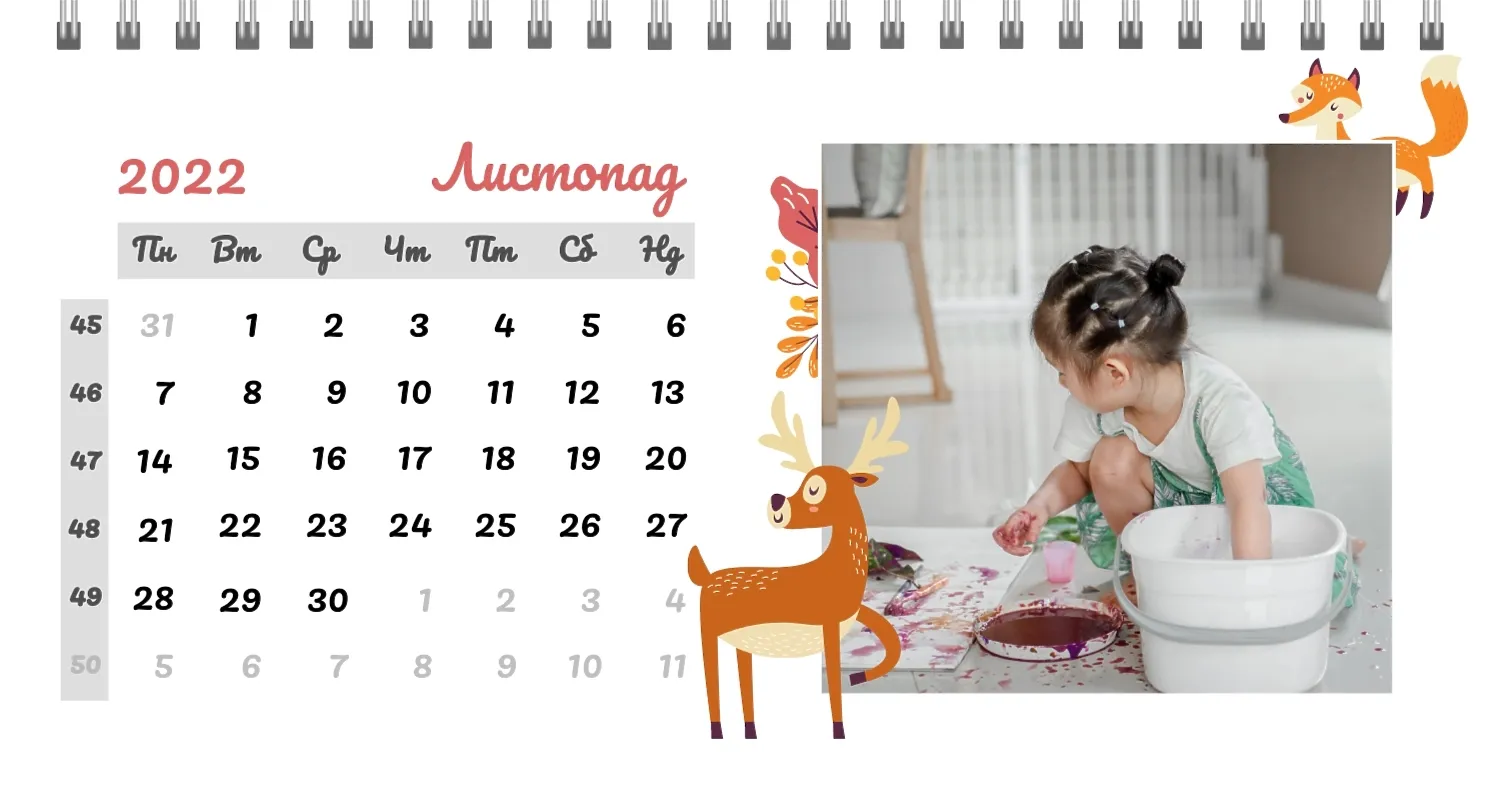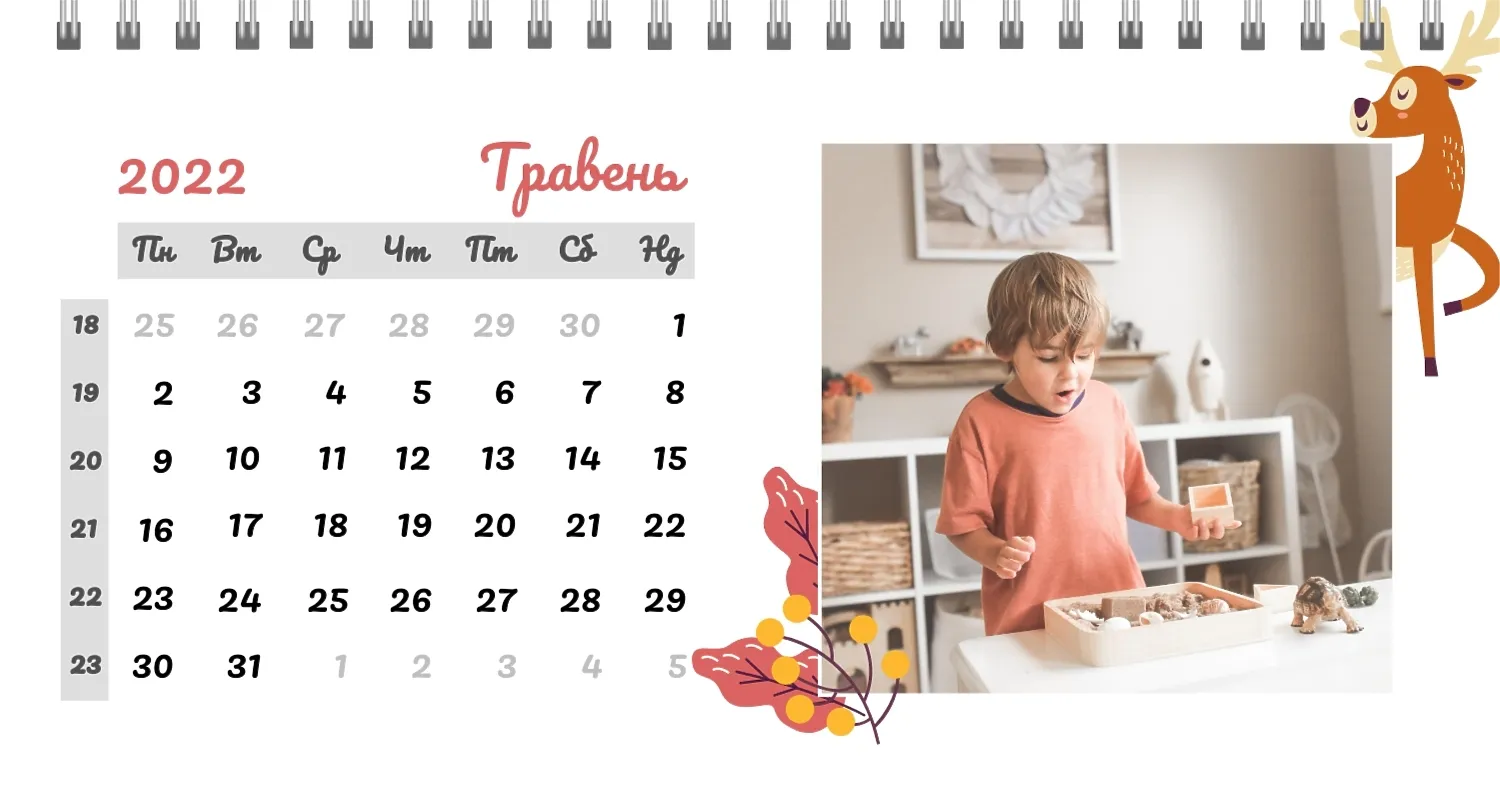 Готовий шаблон настільного перекидного календаря з фото дітей і милим декоративним оформленням створений для тих, хто цінує теплі сімейні емоції і хоче перетворити звичайний календар в затишний персональний аксесуар. Ніжні пастельні відтінки, акуратні ілюстрації, дитячі елементи декору і акцент на фотографії роблять такий календар особливо привабливим для батьків, вихователів, педагогів творчих студій, дитячих фотографів і всіх, хто працює з дітьми або створює для них контент. Він підходить для сімейних архівів, дитячих садків, центрів розвитку та невеликих студій, які хочуть запропонувати клієнтам приємний та емоційний продукт. У нашому онлайн-конструкторі цей шаблон легко перетворити під власні завдання. Ви можете замінити фотографії, змінювати розташування елементів, редагувати написи, вибирати інші шрифти і відтінки, додавати декоративні вставки або навпаки — прибирати зайві, щоб створити більш минималистичную композицію. Кожен місяць можна оформити по-різному, додавши важливі дати, індивідуальні примітки або невеликі картинки, які підкреслюють характер дитини або тематику фото.
