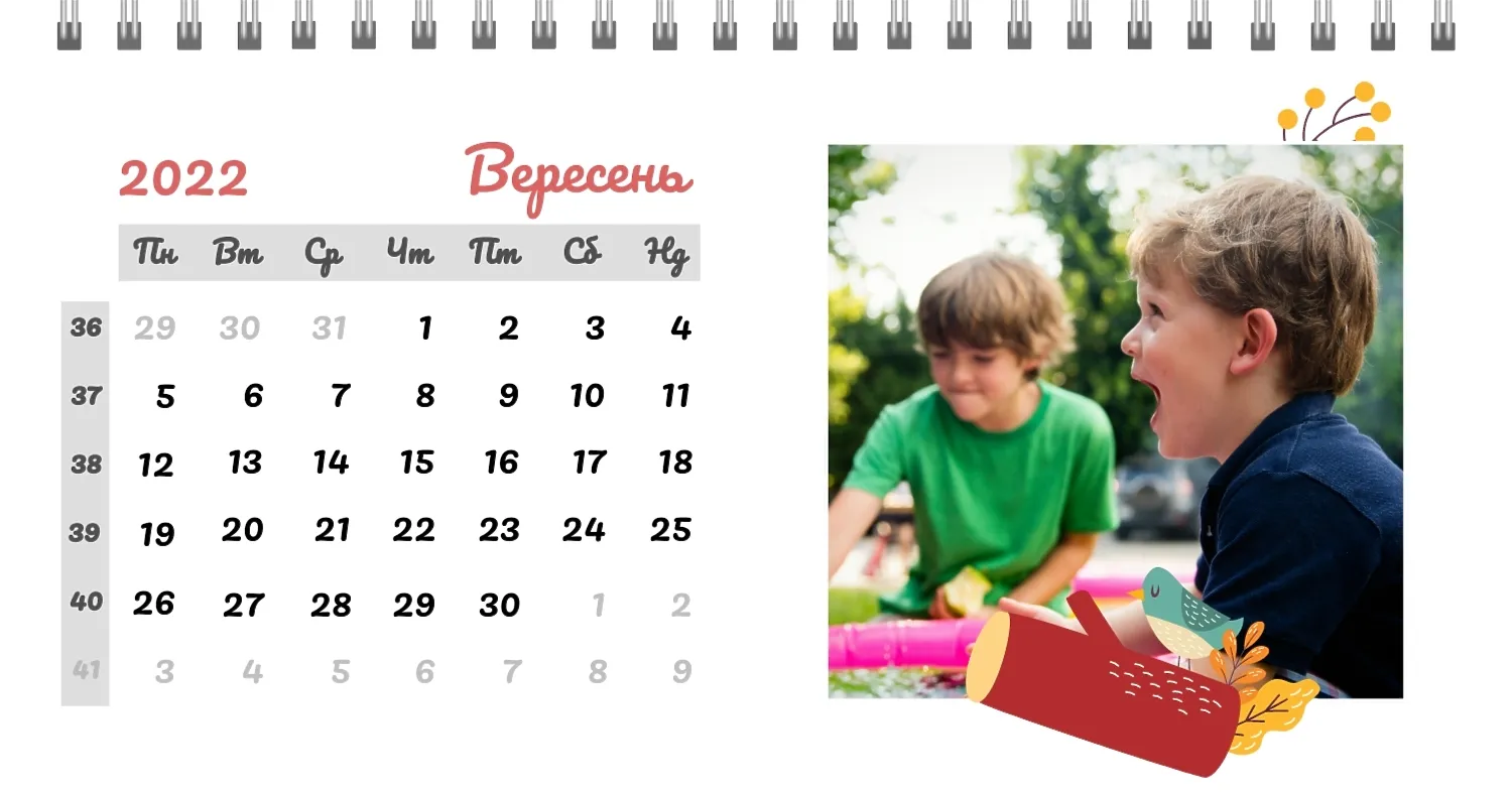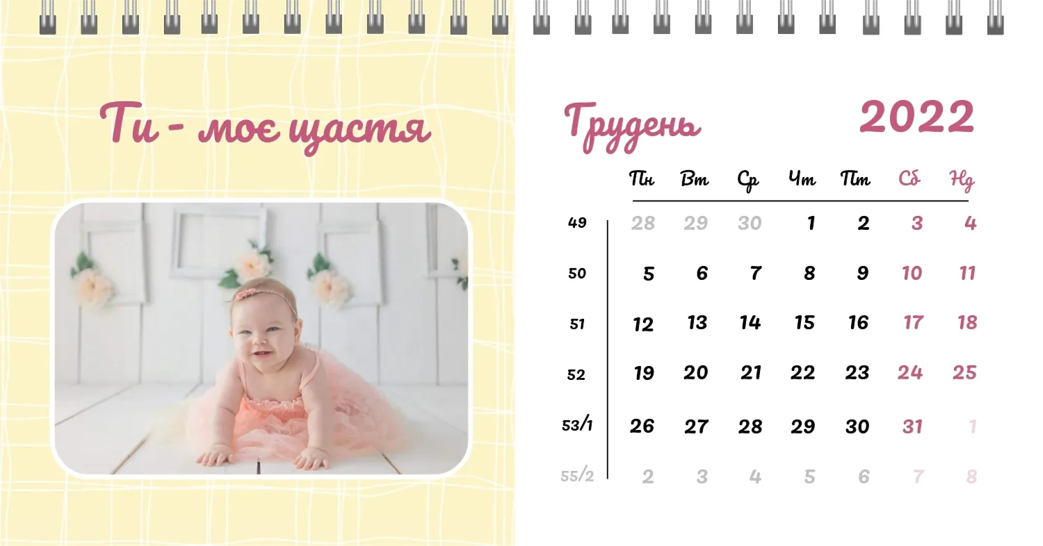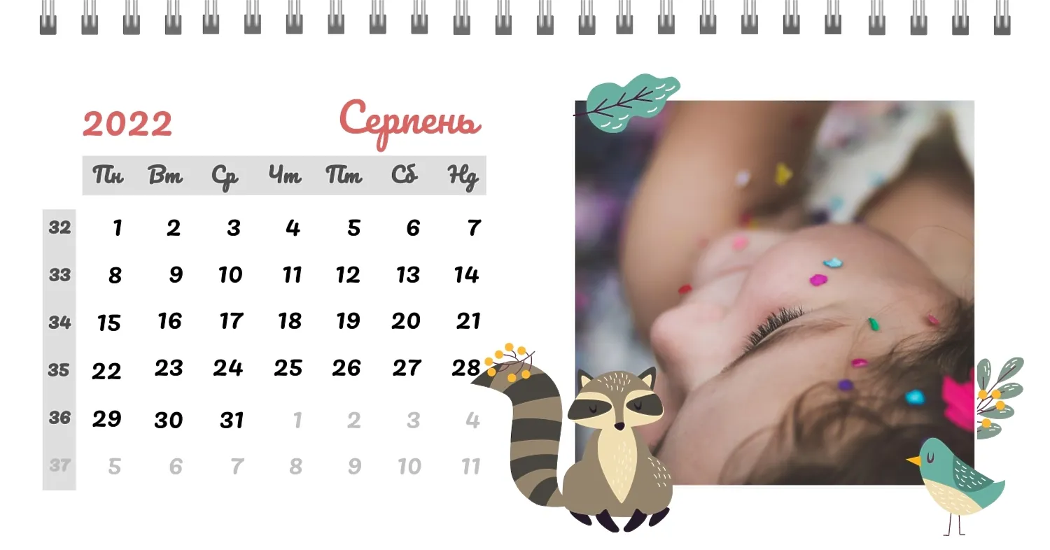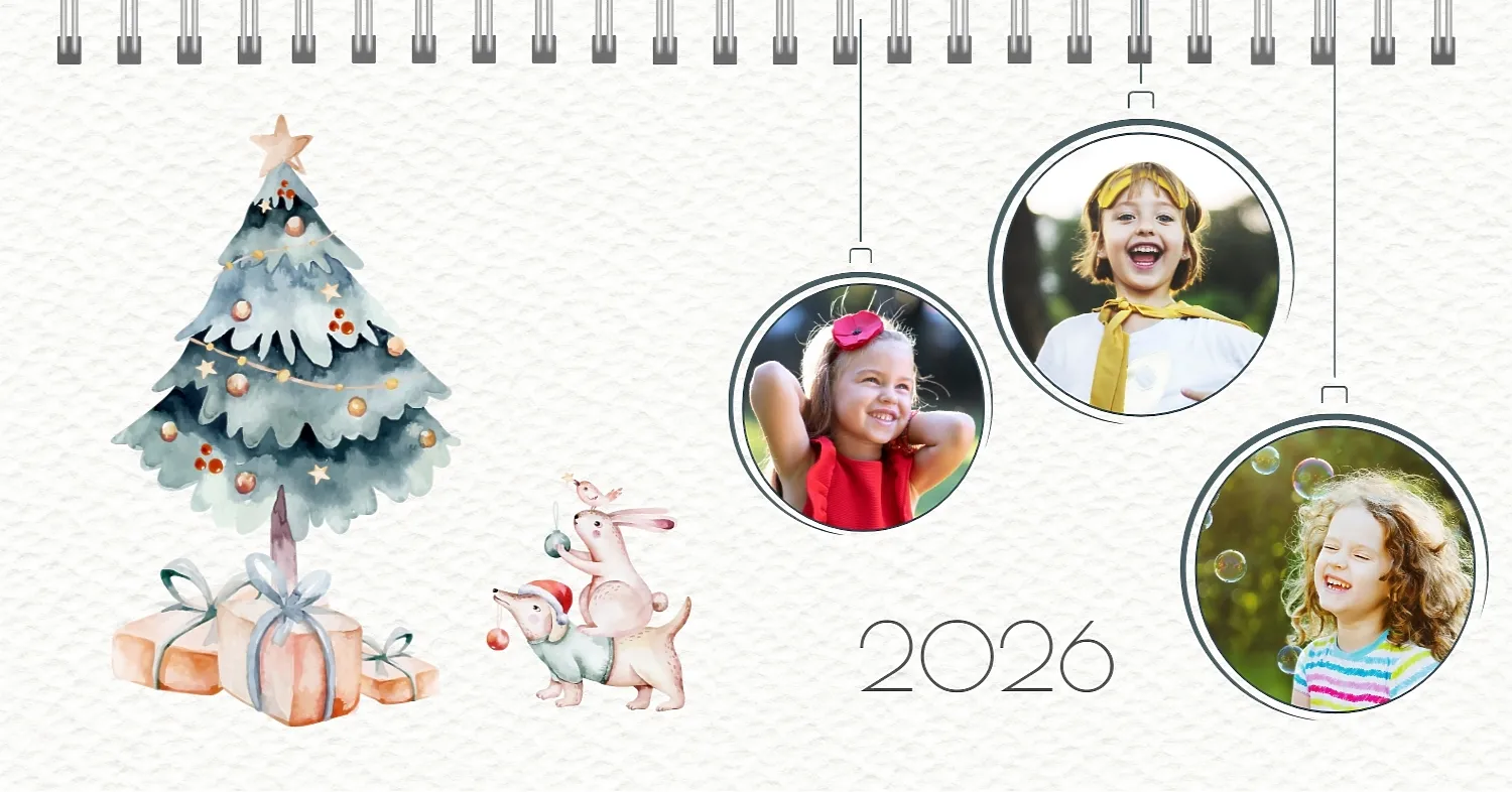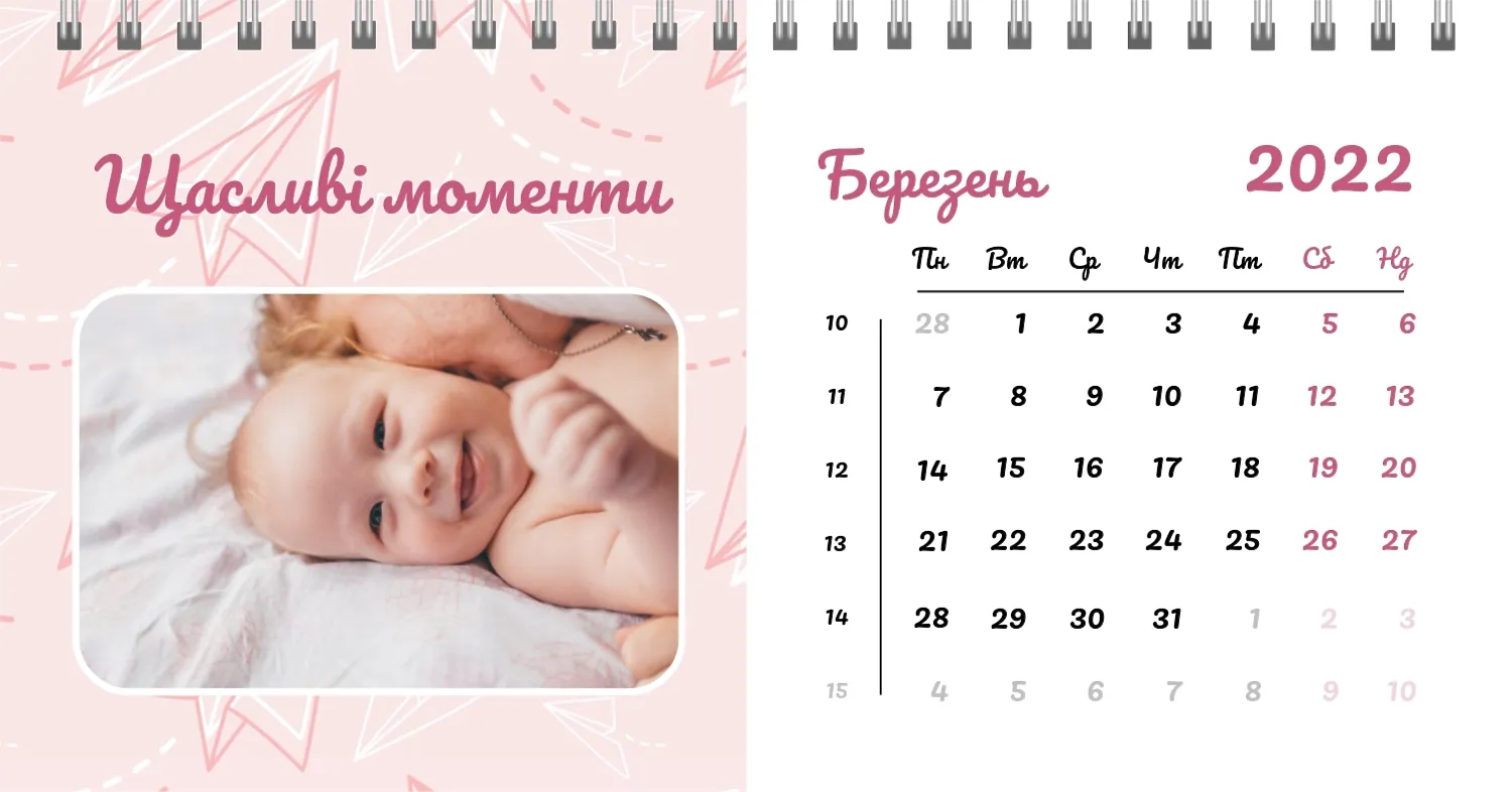 Готовий шаблон настільного перекидного календаря з фото дітей і милим декоративним оформленням створений для тих, хто цінує теплі сімейні емоції і хоче перетворити звичайний календар в затишний персональний аксесуар. Ніжні пастельні відтінки, акуратні ілюстрації, дитячі елементи декору і акцент на фотографії роблять такий календар особливо привабливим для батьків, вихователів, педагогів творчих студій, дитячих фотографів і всіх, хто працює з дітьми або створює для них контент. Він підходить для сімейних архівів, дитячих садків, центрів розвитку та невеликих студій, які хочуть запропонувати клієнтам приємний та емоційний продукт. У нашому онлайн-конструкторі цей шаблон легко перетворити під власні завдання. Ви можете замінити фотографії, змінювати розташування елементів, редагувати написи, вибирати інші шрифти і відтінки, додавати декоративні вставки або навпаки — прибирати зайві, щоб створити більш минималистичную композицію. Кожен місяць можна оформити по-різному, додавши важливі дати, індивідуальні примітки або невеликі картинки, які підкреслюють характер дитини або тематику фото.