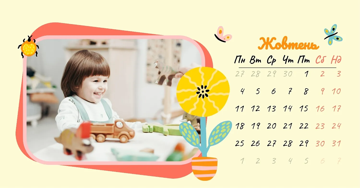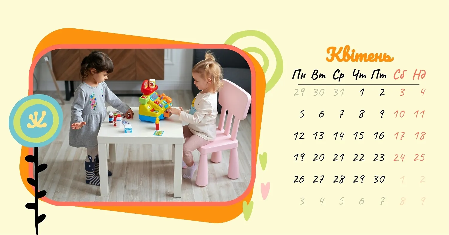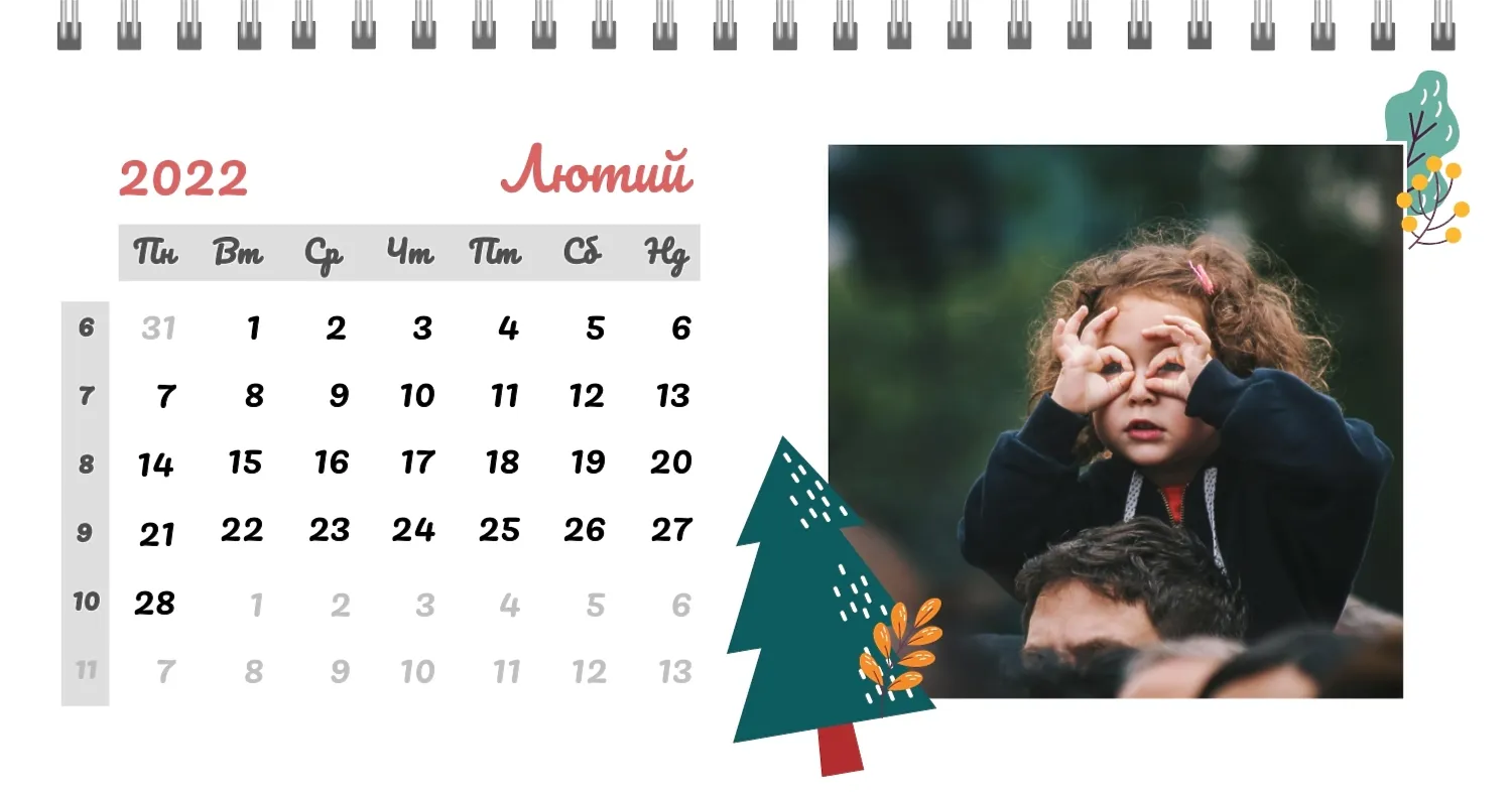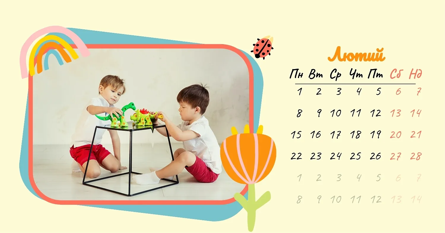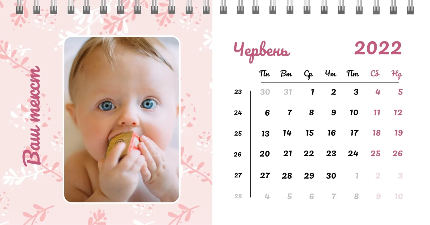 Готовий шаблон настільного перекидного календаря з фото дітей і милим декоративним оформленням створений для тих, хто цінує теплі сімейні емоції і хоче перетворити звичайний календар в затишний персональний аксесуар. Ніжні пастельні відтінки, акуратні ілюстрації, дитячі елементи декору і акцент на фотографії роблять такий календар особливо привабливим для батьків, вихователів, педагогів творчих студій, дитячих фотографів і всіх, хто працює з дітьми або створює для них контент. Він підходить для сімейних архівів, дитячих садків, центрів розвитку та невеликих студій, які хочуть запропонувати клієнтам приємний та емоційний продукт. У нашому онлайн-конструкторі цей шаблон легко перетворити під власні завдання. Ви можете замінити фотографії, змінювати розташування елементів, редагувати написи, вибирати інші шрифти і відтінки, додавати декоративні вставки або навпаки — прибирати зайві, щоб створити більш минималистичную композицію. Кожен місяць можна оформити по-різному, додавши важливі дати, індивідуальні примітки або невеликі картинки, які підкреслюють характер дитини або тематику фото.