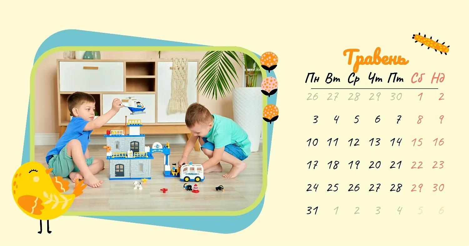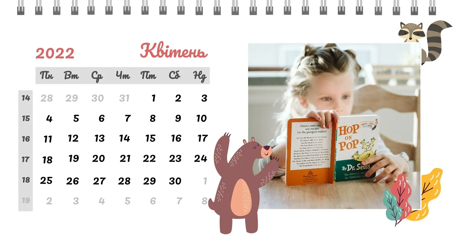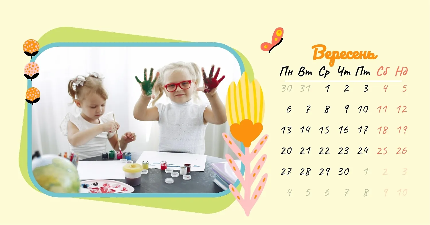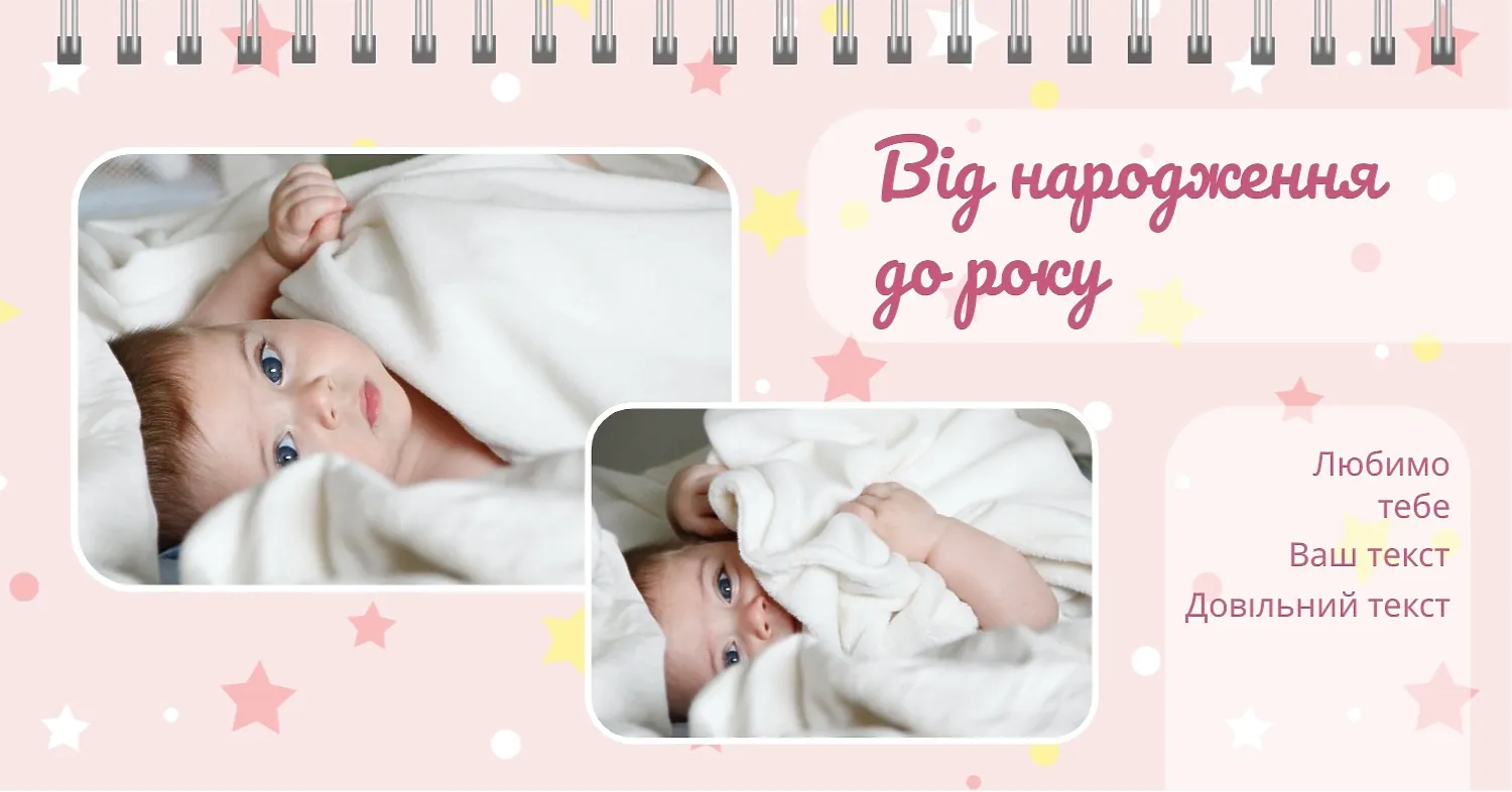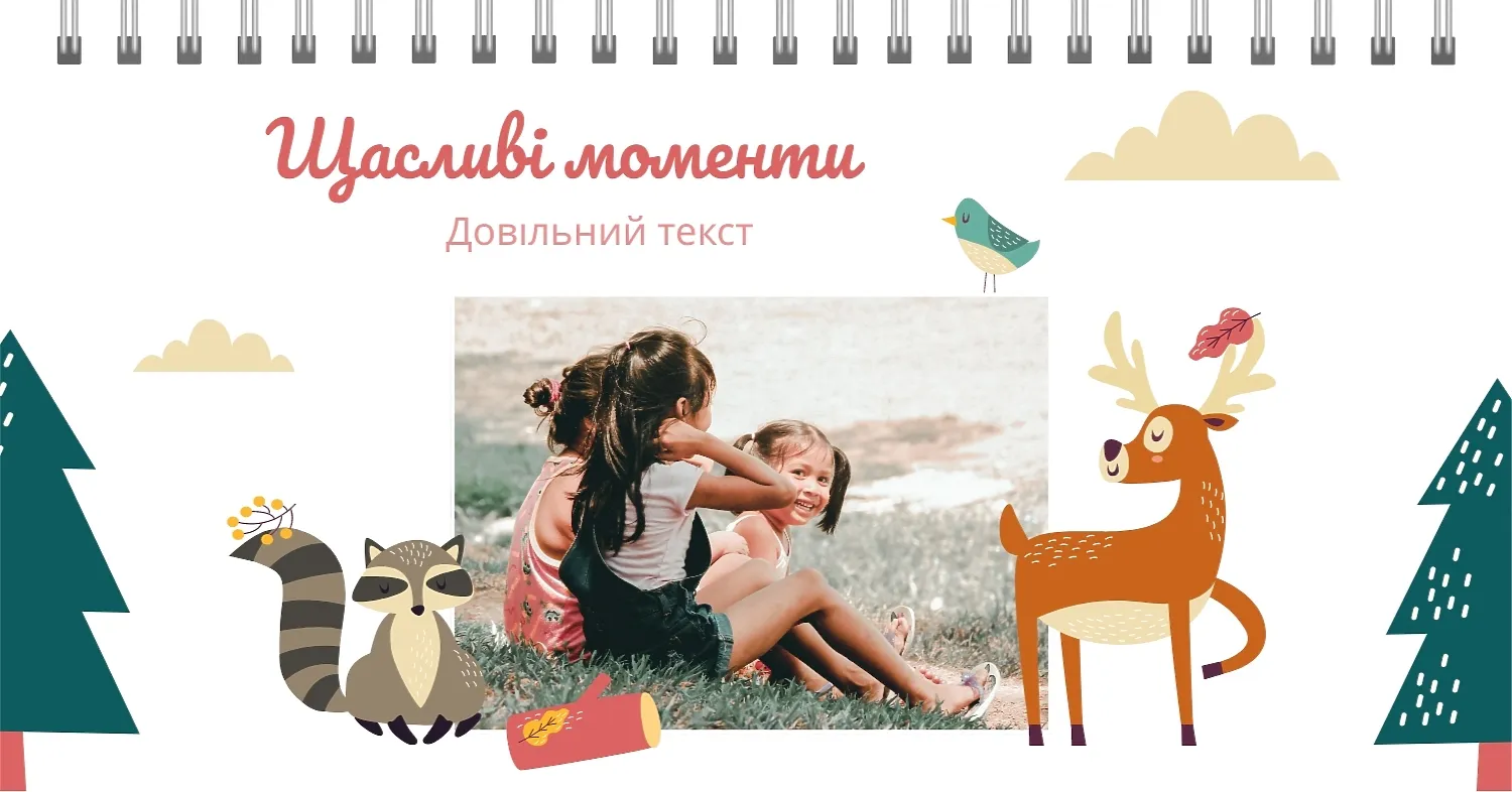 Готовий шаблон настільного перекидного календаря з фото дітей і милим декоративним оформленням створений для тих, хто цінує теплі сімейні емоції і хоче перетворити звичайний календар в затишний персональний аксесуар. Ніжні пастельні відтінки, акуратні ілюстрації, дитячі елементи декору і акцент на фотографії роблять такий календар особливо привабливим для батьків, вихователів, педагогів творчих студій, дитячих фотографів і всіх, хто працює з дітьми або створює для них контент. Він підходить для сімейних архівів, дитячих садків, центрів розвитку та невеликих студій, які хочуть запропонувати клієнтам приємний та емоційний продукт. У нашому онлайн-конструкторі цей шаблон легко перетворити під власні завдання. Ви можете замінити фотографії, змінювати розташування елементів, редагувати написи, вибирати інші шрифти і відтінки, додавати декоративні вставки або навпаки — прибирати зайві, щоб створити більш минималистичную композицію. Кожен місяць можна оформити по-різному, додавши важливі дати, індивідуальні примітки або невеликі картинки, які підкреслюють характер дитини або тематику фото.