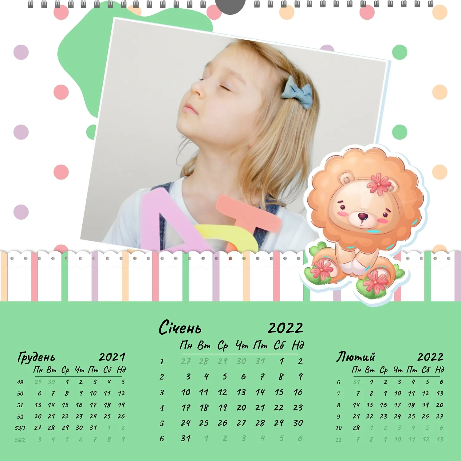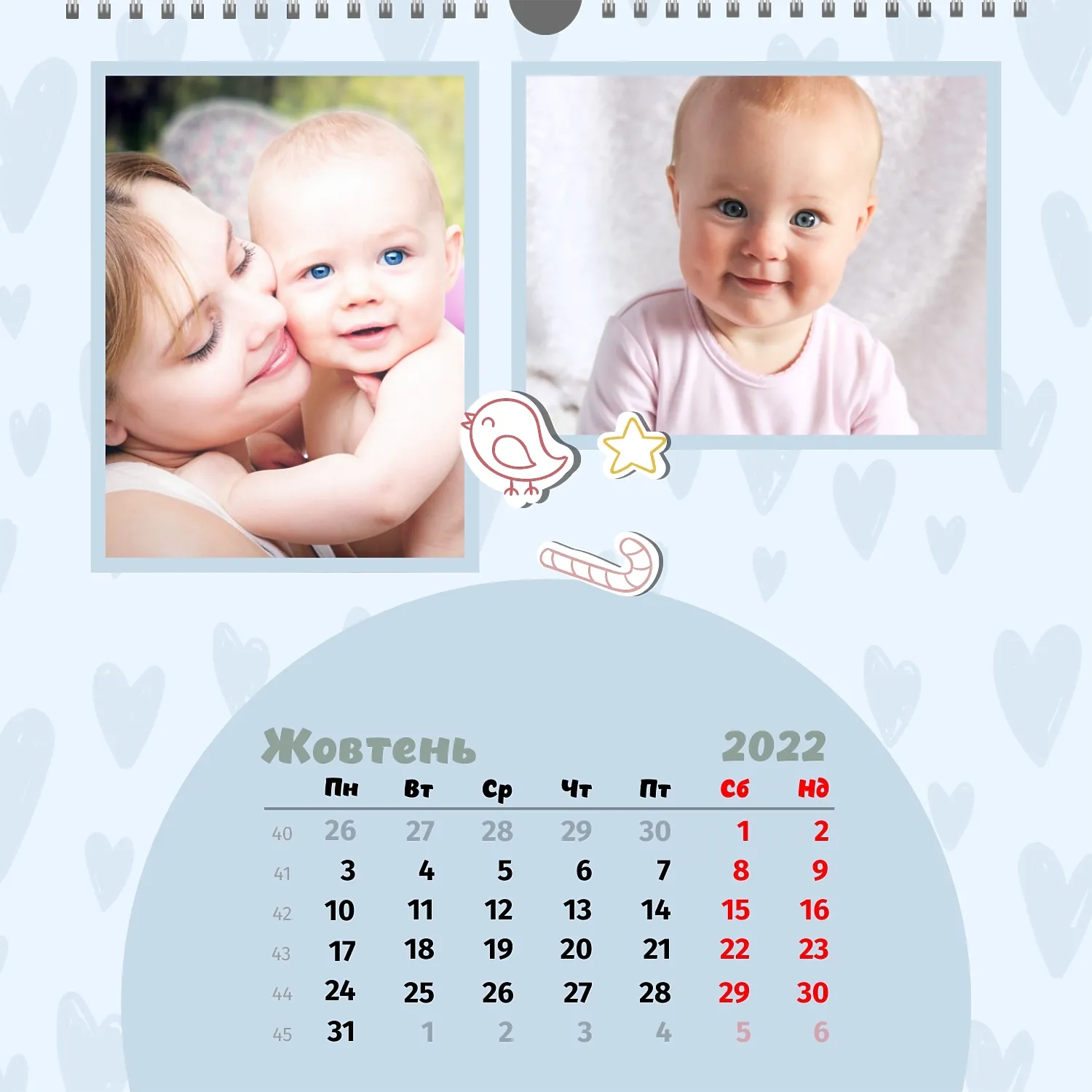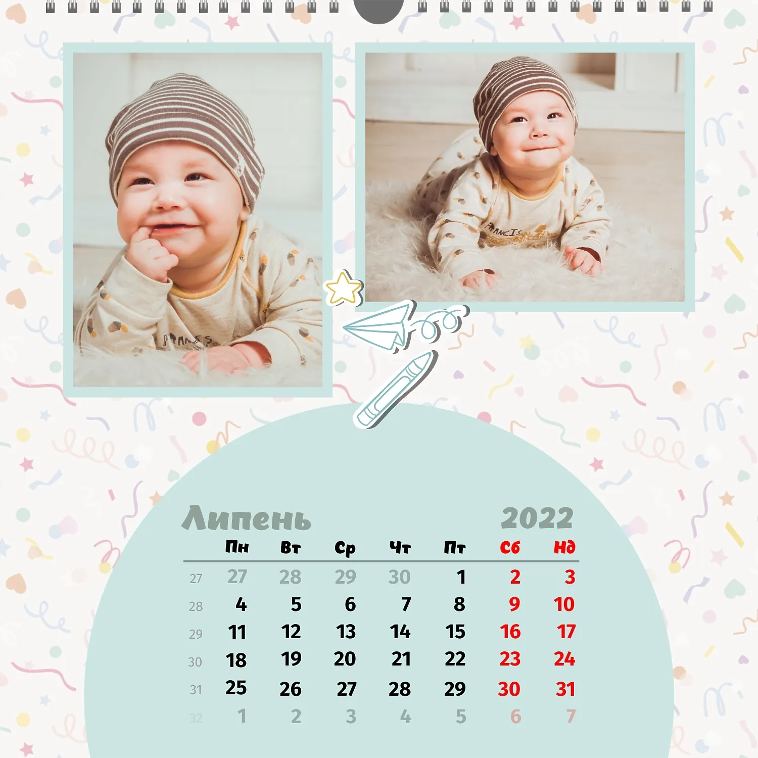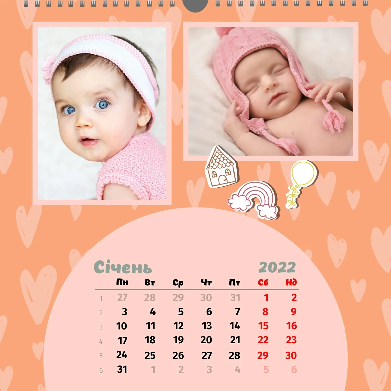 Готовий шаблон настінного квадратного календаря з фото дітей і милим декоративним оформленням створений для тих, хто цінує теплі сімейні емоції і хоче перетворити звичайний календар в затишний персональний аксесуар. Ніжні пастельні відтінки, акуратні ілюстрації, дитячі елементи декору і акцент на фотографії роблять такий календар особливо привабливим для батьків, вихователів, педагогів творчих студій, дитячих фотографів і всіх, хто працює з дітьми або створює для них контент. . У нашому онлайн-конструкторі цей шаблон легко перетворити під власні завдання. Ви можете замінити фотографії, змінювати розташування елементів, редагувати написи, вибирати інші шрифти і відтінки, додавати декоративні вставки або навпаки — прибирати зайві, щоб створити більш минималистичную композицію. Кожен місяць можна оформити по-різному, додавши важливі дати, індивідуальні примітки або невеликі картинки, які підкреслюють характер дитини або тематику фото. Завдяки інтуїтивному управлінню і гнучкості налаштувань ви повністю контролюєте зовнішній вигляд майбутнього календаря. Навіть без дизайнерських навичок можна створити професійно виглядає макет, який буде радувати весь рік. Шаблон служить лише основою-в конструкторі він перетворюється в унікальний, теплий і по-справжньому персональний настінний календар, зроблений своїми руками.