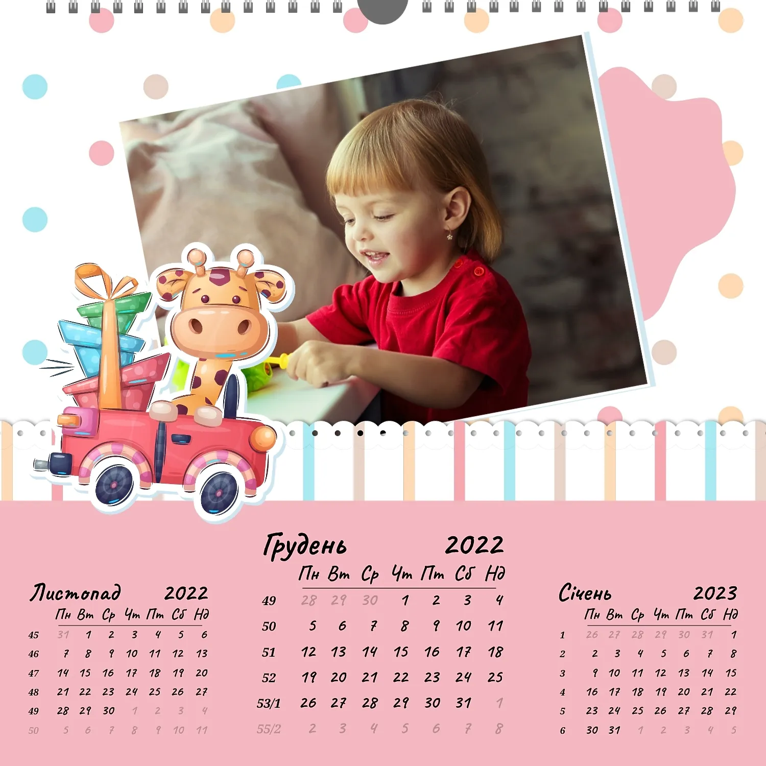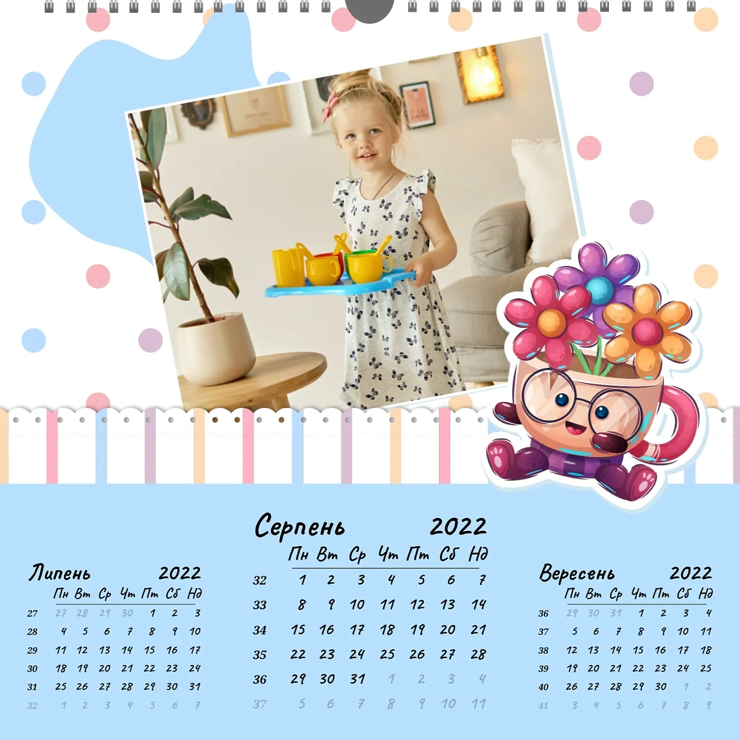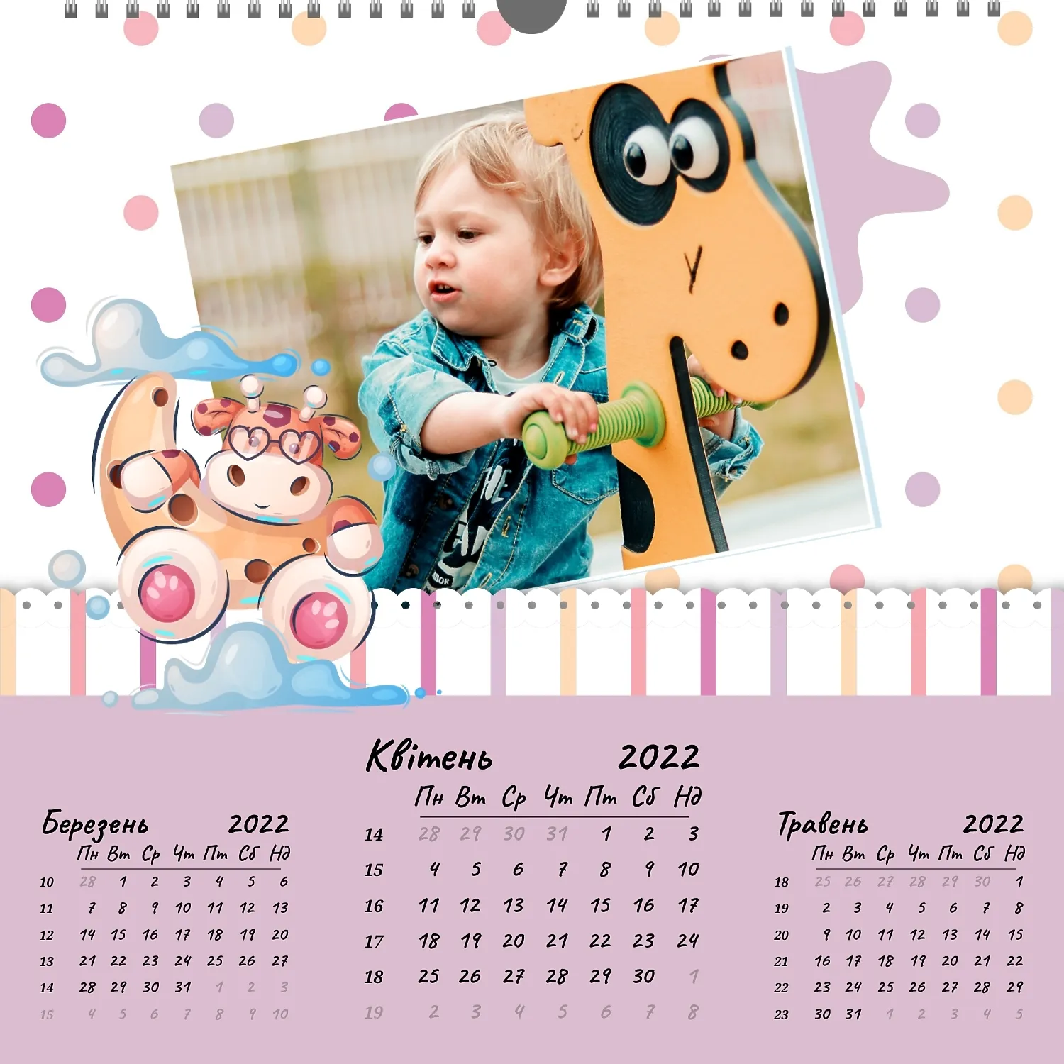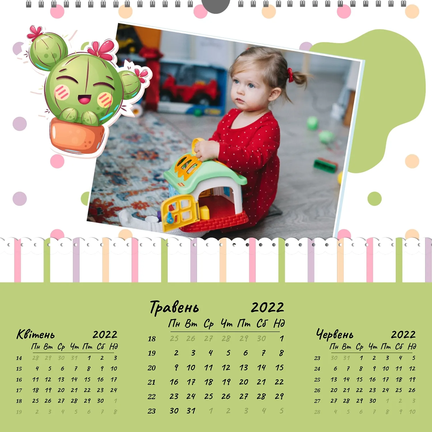 Готовий шаблон настінного квадратного календаря з фото дітей і милим декоративним оформленням створений для тих, хто цінує теплі сімейні емоції і хоче перетворити звичайний календар в затишний персональний аксесуар. Ніжні пастельні відтінки, акуратні ілюстрації, дитячі елементи декору і акцент на фотографії роблять такий календар особливо привабливим для батьків, вихователів, педагогів творчих студій, дитячих фотографів і всіх, хто працює з дітьми або створює для них контент. . У нашому онлайн-конструкторі цей шаблон легко перетворити під власні завдання. Ви можете замінити фотографії, змінювати розташування елементів, редагувати написи, вибирати інші шрифти і відтінки, додавати декоративні вставки або навпаки — прибирати зайві, щоб створити більш минималистичную композицію. Кожен місяць можна оформити по-різному, додавши важливі дати, індивідуальні примітки або невеликі картинки, які підкреслюють характер дитини або тематику фото. Завдяки інтуїтивному управлінню і гнучкості налаштувань ви повністю контролюєте зовнішній вигляд майбутнього календаря. Навіть без дизайнерських навичок можна створити професійно виглядає макет, який буде радувати весь рік. Шаблон служить лише основою-в конструкторі він перетворюється в унікальний, теплий і по-справжньому персональний настінний календар, зроблений своїми руками.
