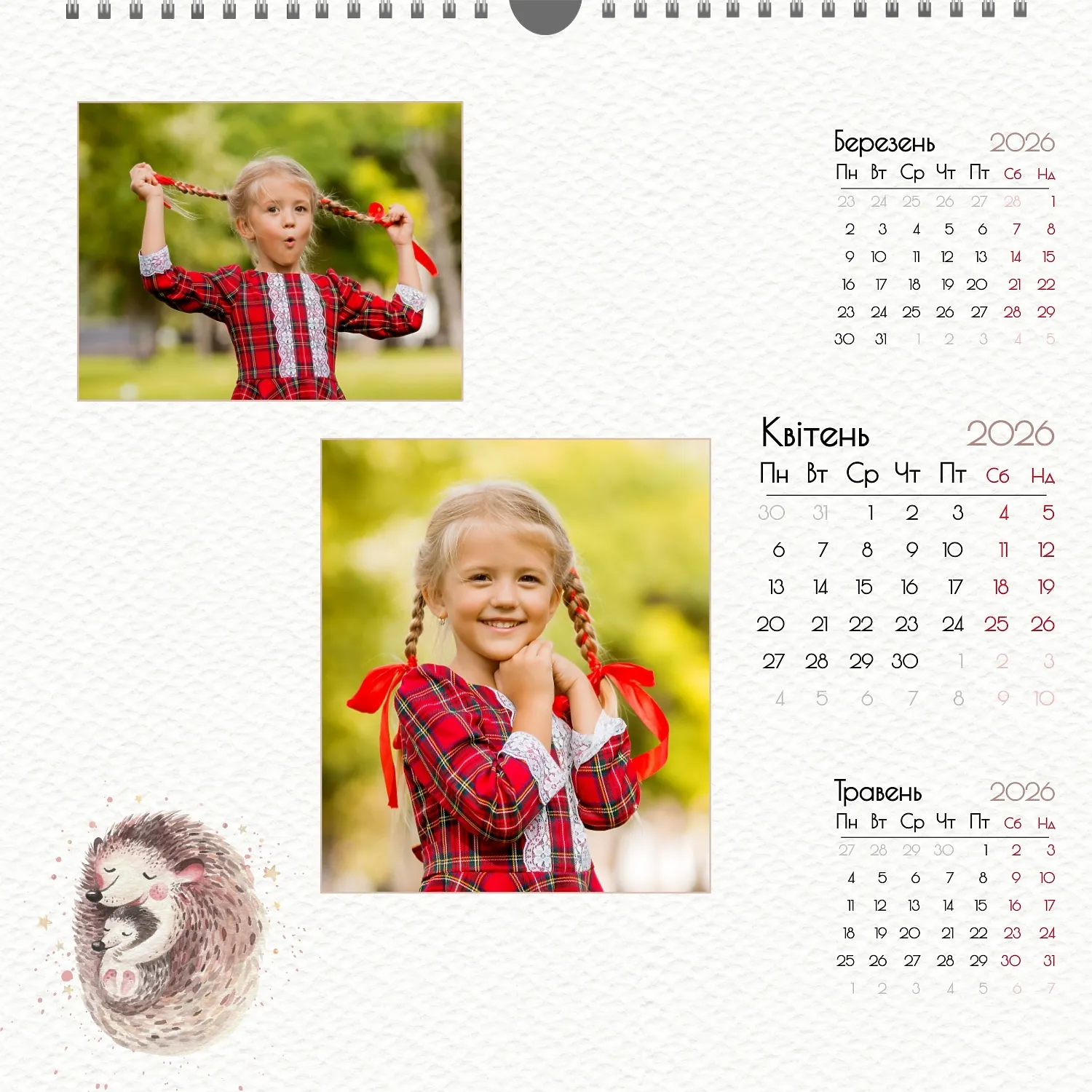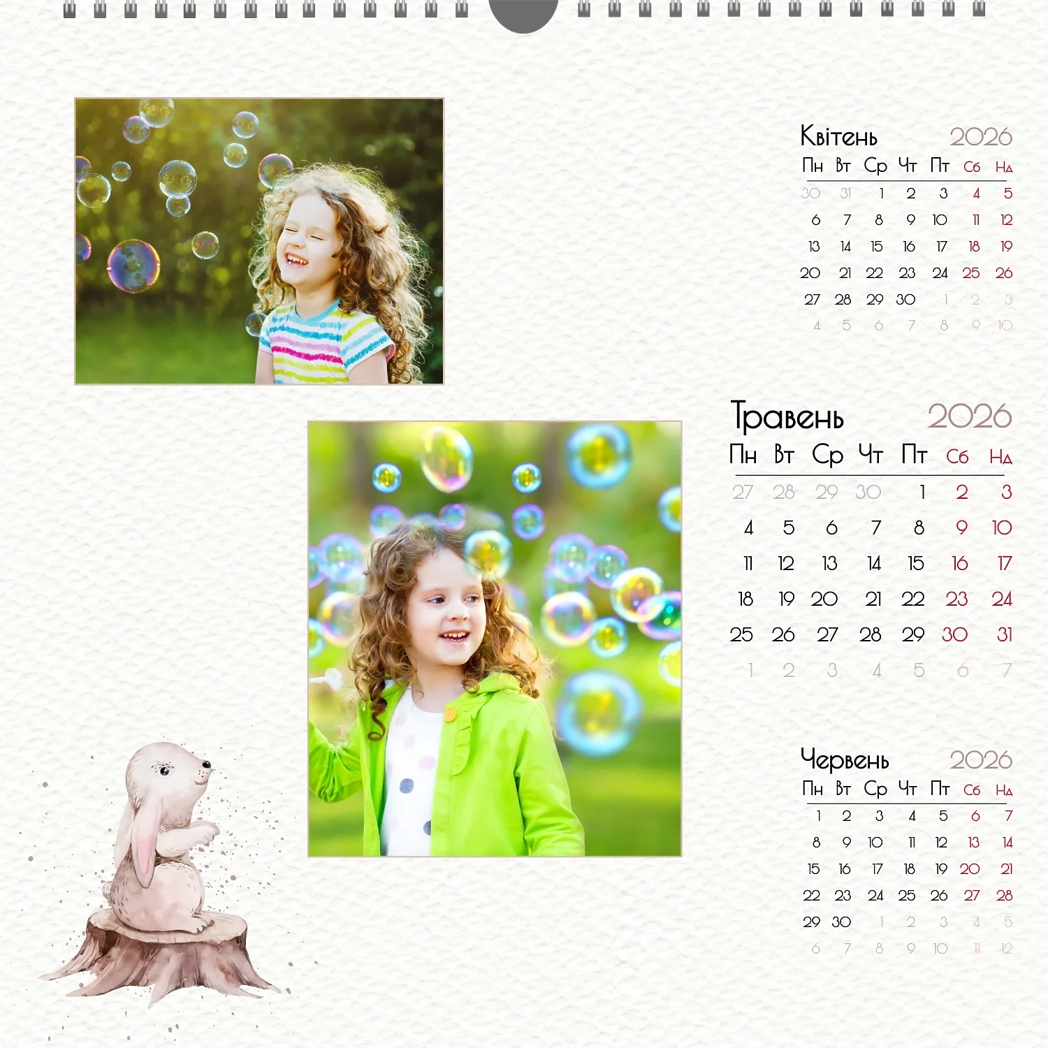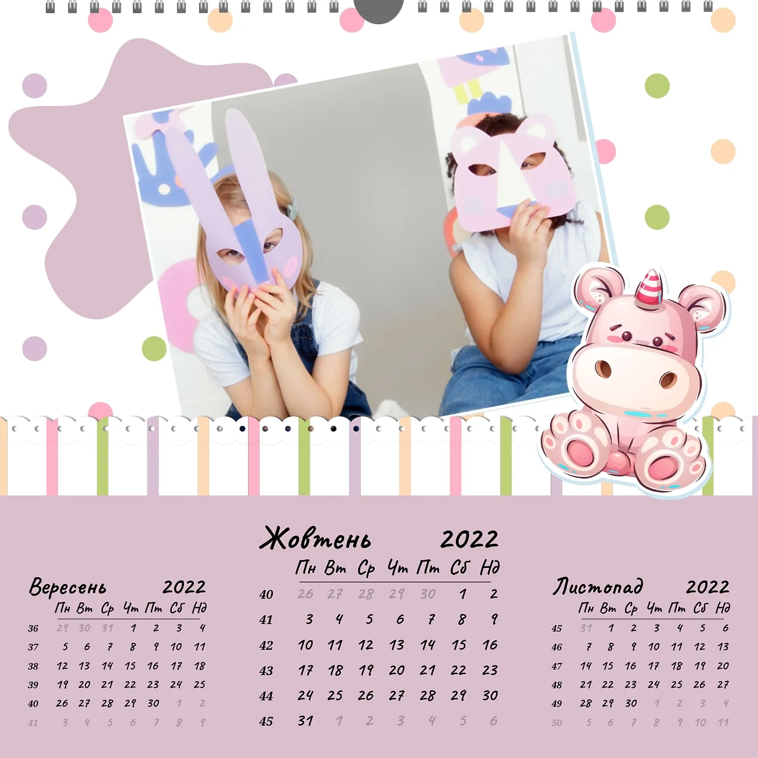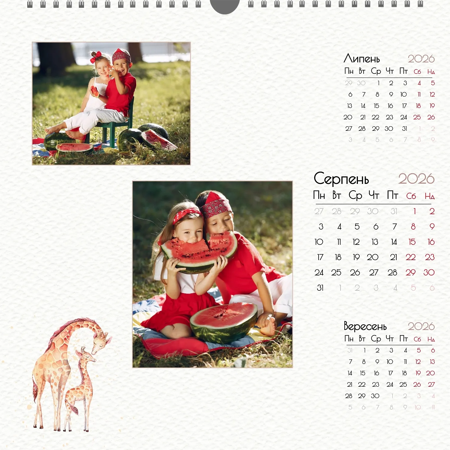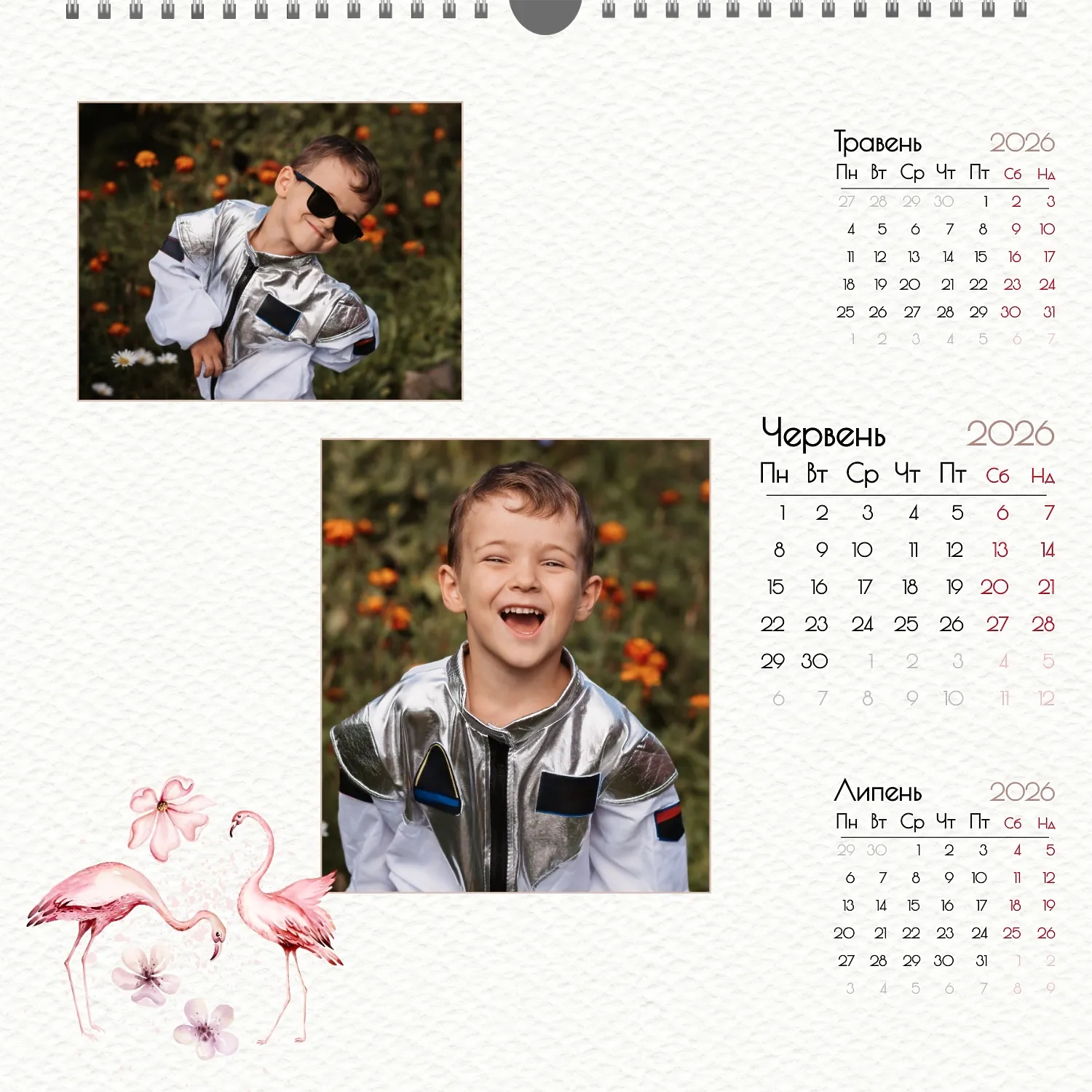 Готовий шаблон настінного квадратного календаря з фото дітей і милим декоративним оформленням створений для тих, хто цінує теплі сімейні емоції і хоче перетворити звичайний календар в затишний персональний аксесуар. Ніжні пастельні відтінки, акуратні ілюстрації, дитячі елементи декору і акцент на фотографії роблять такий календар особливо привабливим для батьків, вихователів, педагогів творчих студій, дитячих фотографів і всіх, хто працює з дітьми або створює для них контент. . У нашому онлайн-конструкторі цей шаблон легко перетворити під власні завдання. Ви можете замінити фотографії, змінювати розташування елементів, редагувати написи, вибирати інші шрифти і відтінки, додавати декоративні вставки або навпаки — прибирати зайві, щоб створити більш минималистичную композицію. Кожен місяць можна оформити по-різному, додавши важливі дати, індивідуальні примітки або невеликі картинки, які підкреслюють характер дитини або тематику фото. Завдяки інтуїтивному управлінню і гнучкості налаштувань ви повністю контролюєте зовнішній вигляд майбутнього календаря. Навіть без дизайнерських навичок можна створити професійно виглядає макет, який буде радувати весь рік. Шаблон служить лише основою-в конструкторі він перетворюється в унікальний, теплий і по-справжньому персональний настінний календар, зроблений своїми руками.
