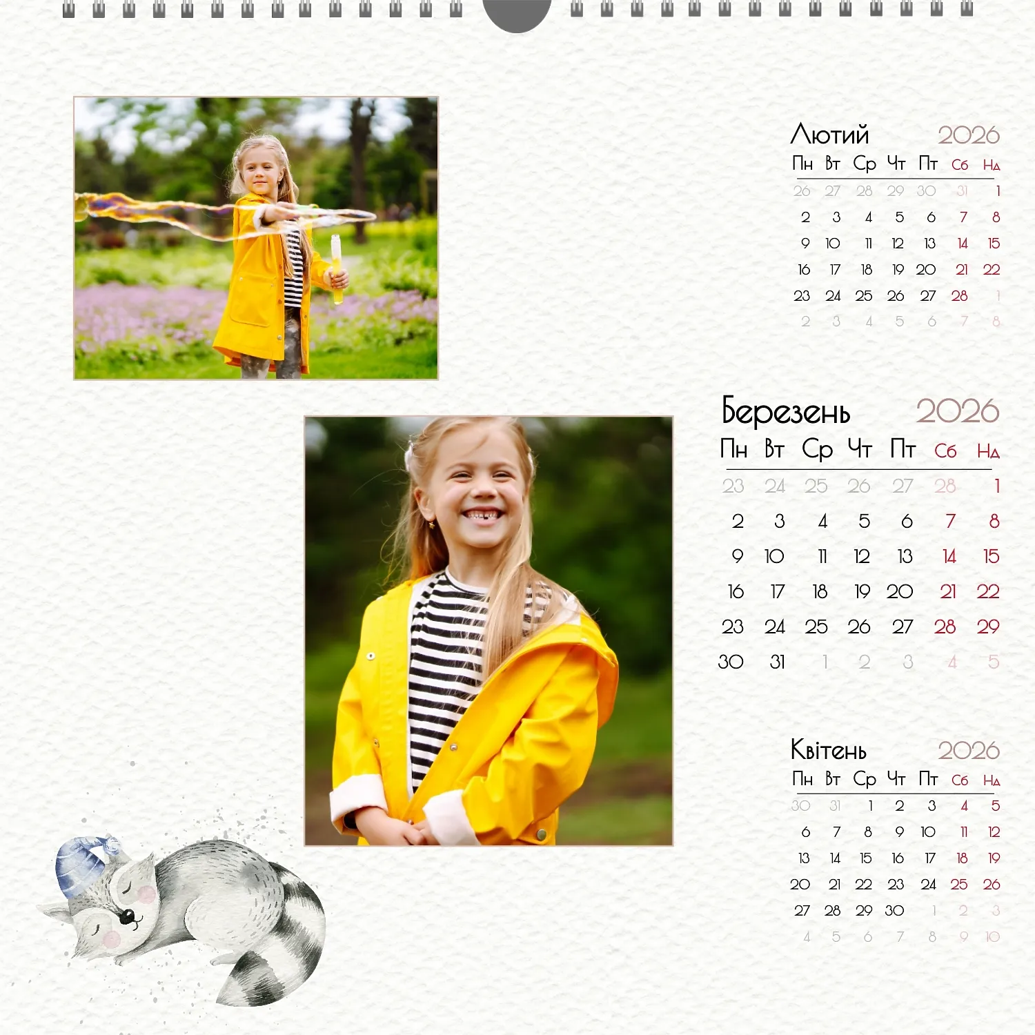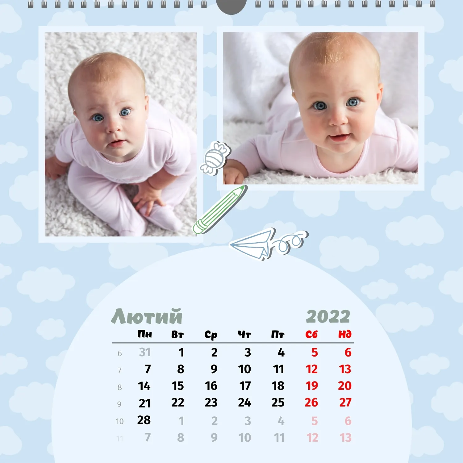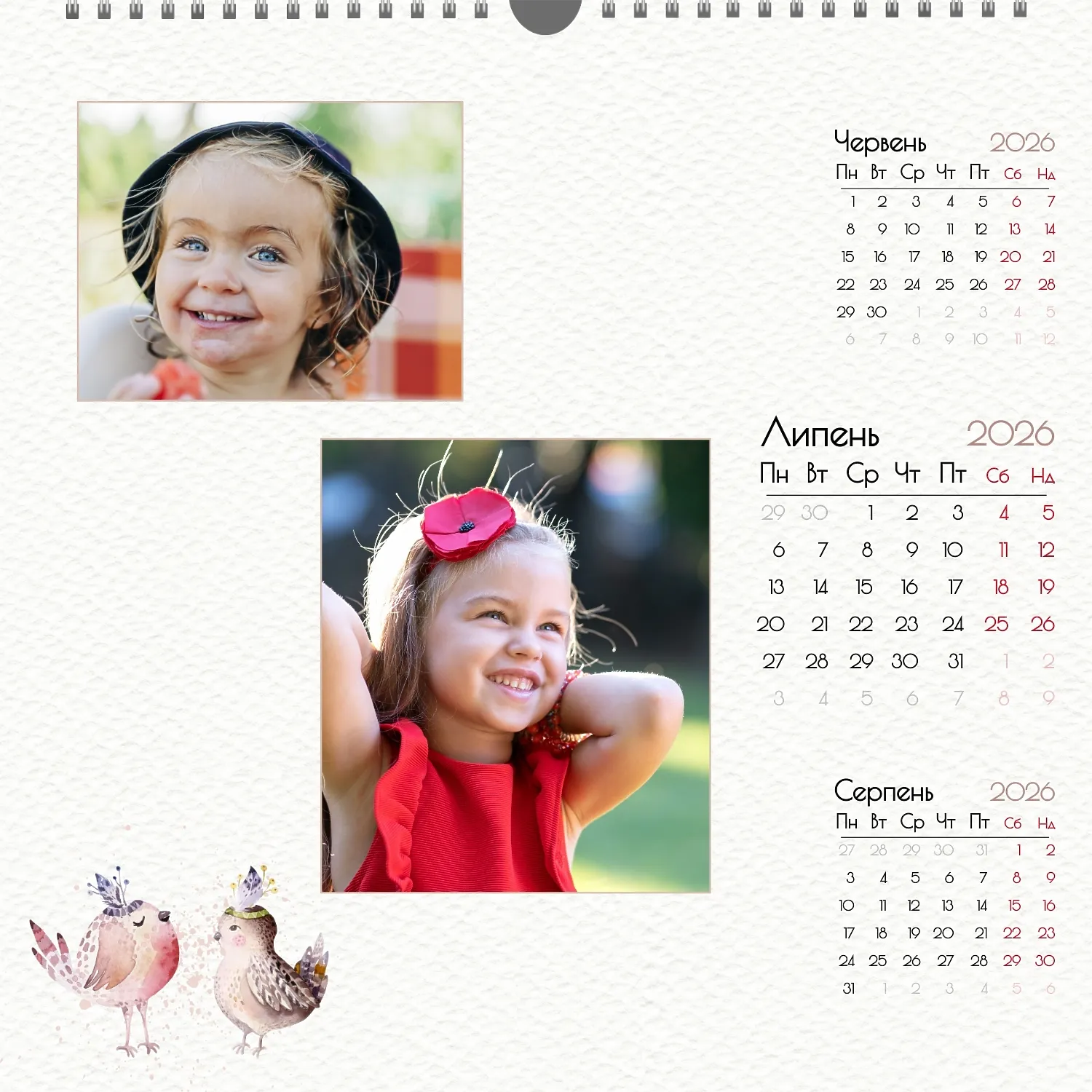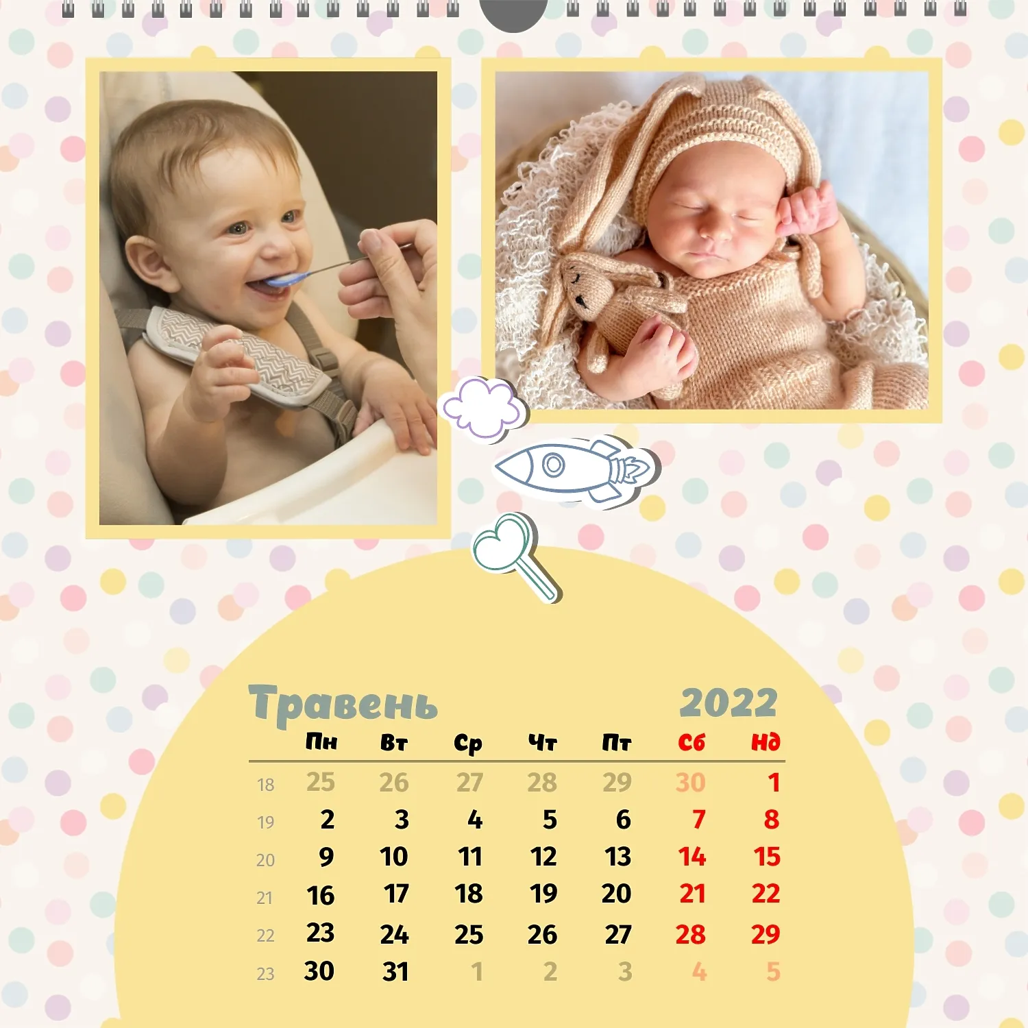 Готовий шаблон настінного квадратного календаря з фото дітей і милим декоративним оформленням створений для тих, хто цінує теплі сімейні емоції і хоче перетворити звичайний календар в затишний персональний аксесуар. Ніжні пастельні відтінки, акуратні ілюстрації, дитячі елементи декору і акцент на фотографії роблять такий календар особливо привабливим для батьків, вихователів, педагогів творчих студій, дитячих фотографів і всіх, хто працює з дітьми або створює для них контент. . У нашому онлайн-конструкторі цей шаблон легко перетворити під власні завдання. Ви можете замінити фотографії, змінювати розташування елементів, редагувати написи, вибирати інші шрифти і відтінки, додавати декоративні вставки або навпаки — прибирати зайві, щоб створити більш минималистичную композицію. Кожен місяць можна оформити по-різному, додавши важливі дати, індивідуальні примітки або невеликі картинки, які підкреслюють характер дитини або тематику фото. Завдяки інтуїтивному управлінню і гнучкості налаштувань ви повністю контролюєте зовнішній вигляд майбутнього календаря. Навіть без дизайнерських навичок можна створити професійно виглядає макет, який буде радувати весь рік. Шаблон служить лише основою-в конструкторі він перетворюється в унікальний, теплий і по-справжньому персональний настінний календар, зроблений своїми руками.