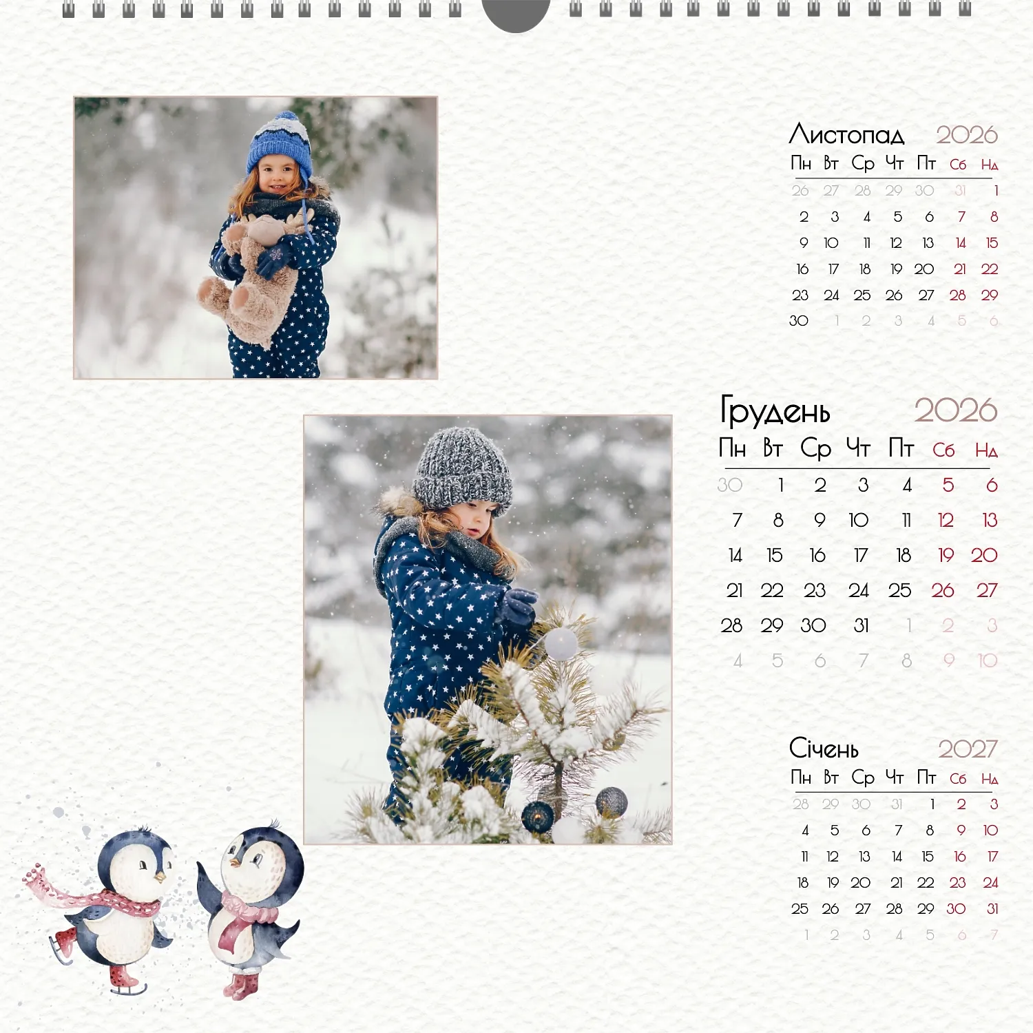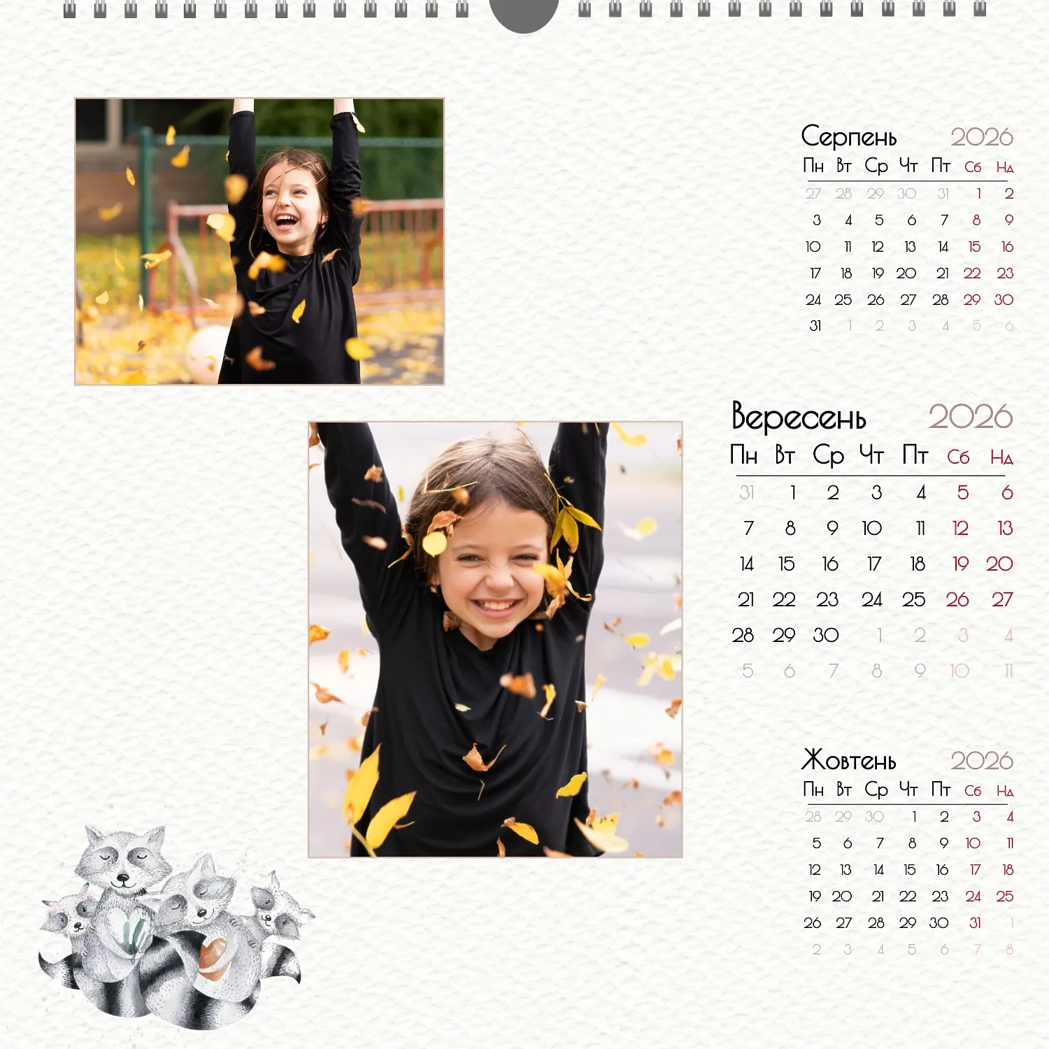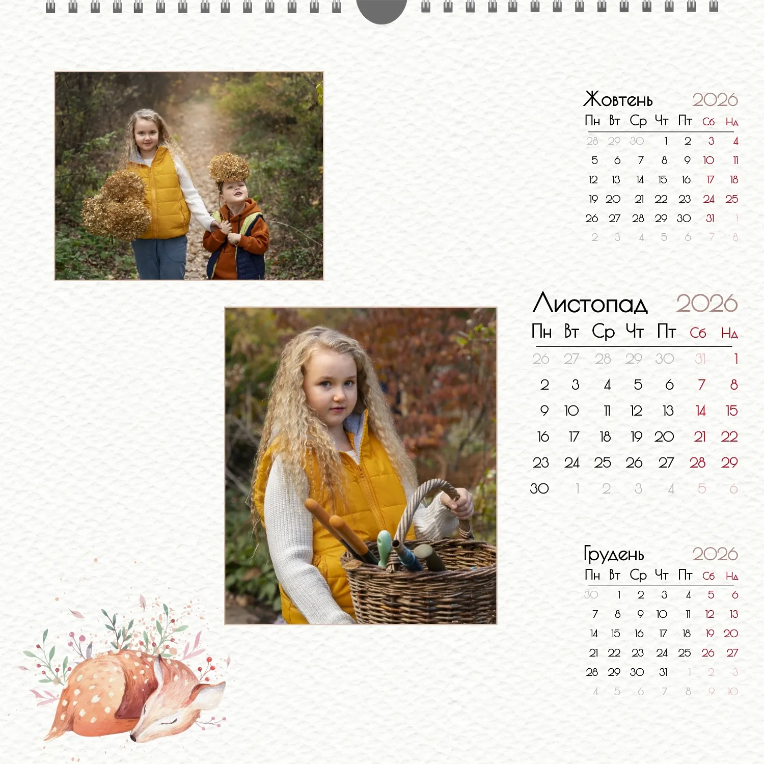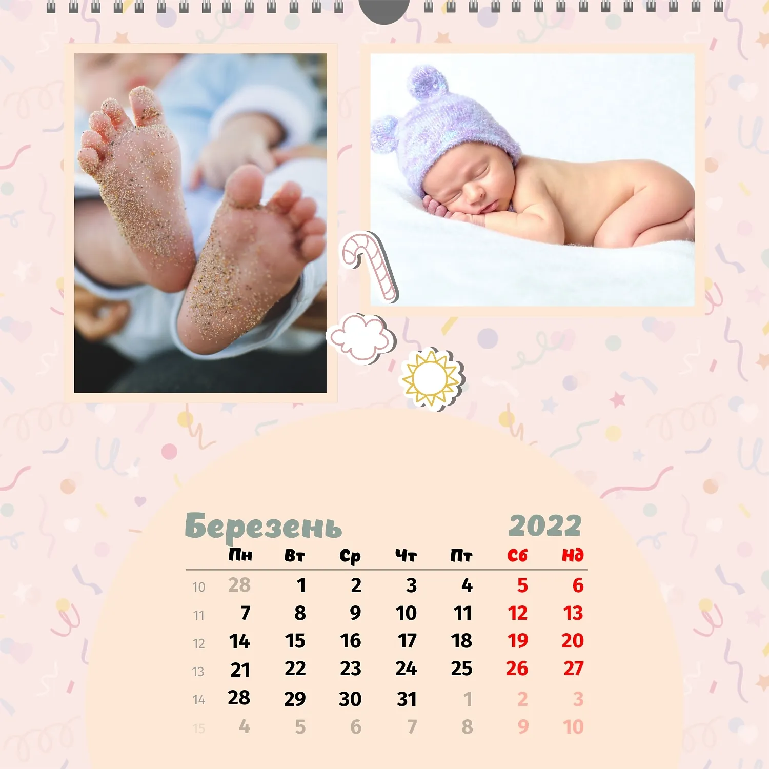 Готовий шаблон настінного квадратного календаря з фото дітей і милим декоративним оформленням створений для тих, хто цінує теплі сімейні емоції і хоче перетворити звичайний календар в затишний персональний аксесуар. Ніжні пастельні відтінки, акуратні ілюстрації, дитячі елементи декору і акцент на фотографії роблять такий календар особливо привабливим для батьків, вихователів, педагогів творчих студій, дитячих фотографів і всіх, хто працює з дітьми або створює для них контент. . У нашому онлайн-конструкторі цей шаблон легко перетворити під власні завдання. Ви можете замінити фотографії, змінювати розташування елементів, редагувати написи, вибирати інші шрифти і відтінки, додавати декоративні вставки або навпаки — прибирати зайві, щоб створити більш минималистичную композицію. Кожен місяць можна оформити по-різному, додавши важливі дати, індивідуальні примітки або невеликі картинки, які підкреслюють характер дитини або тематику фото. Завдяки інтуїтивному управлінню і гнучкості налаштувань ви повністю контролюєте зовнішній вигляд майбутнього календаря. Навіть без дизайнерських навичок можна створити професійно виглядає макет, який буде радувати весь рік. Шаблон служить лише основою-в конструкторі він перетворюється в унікальний, теплий і по-справжньому персональний настінний календар, зроблений своїми руками.