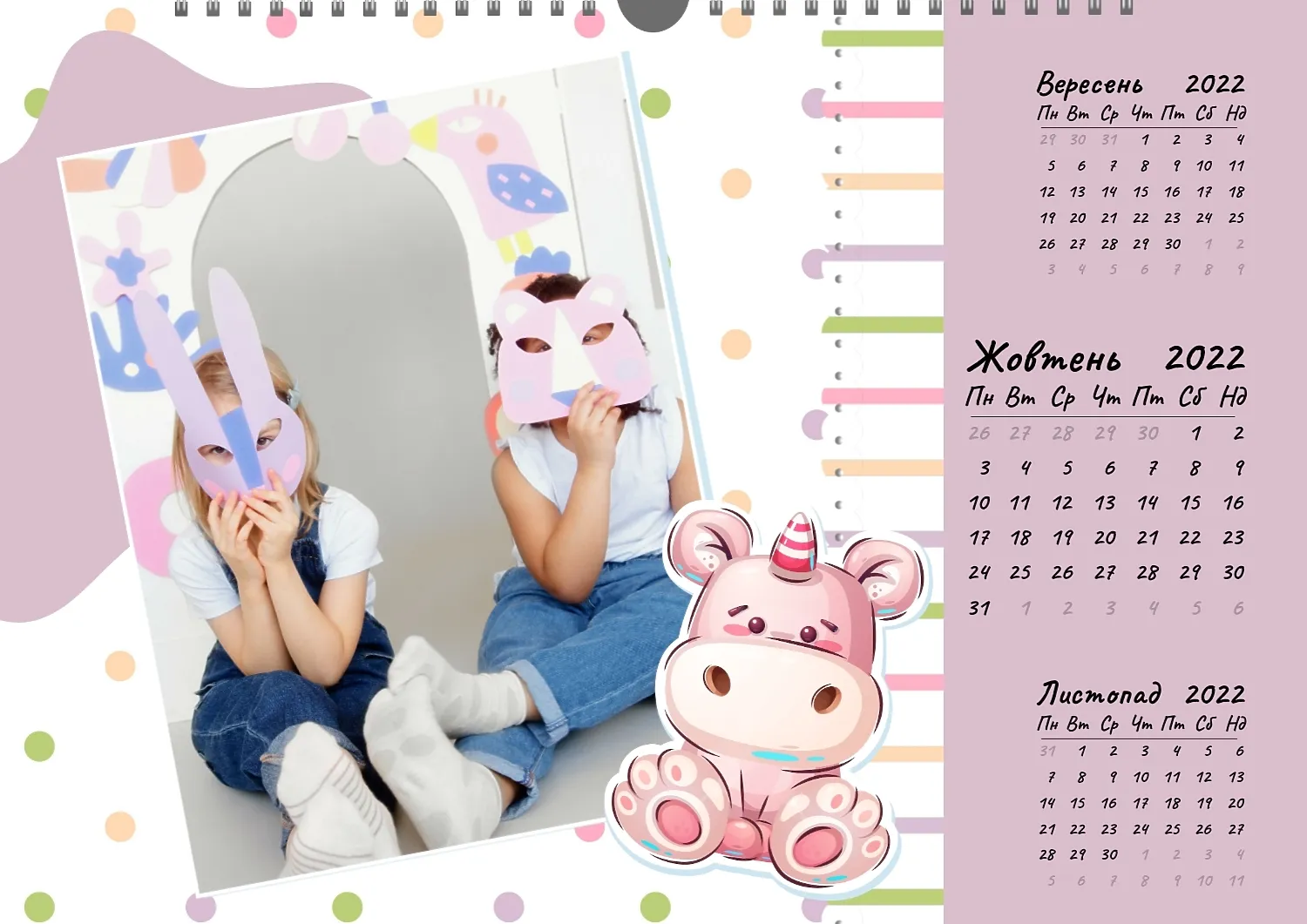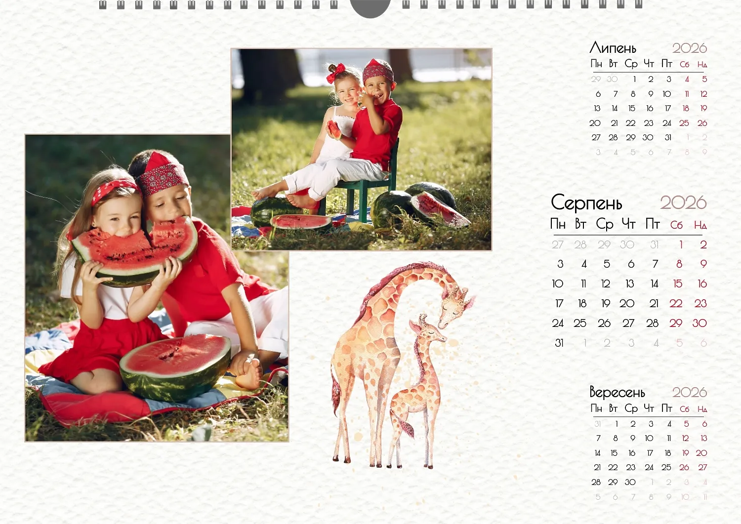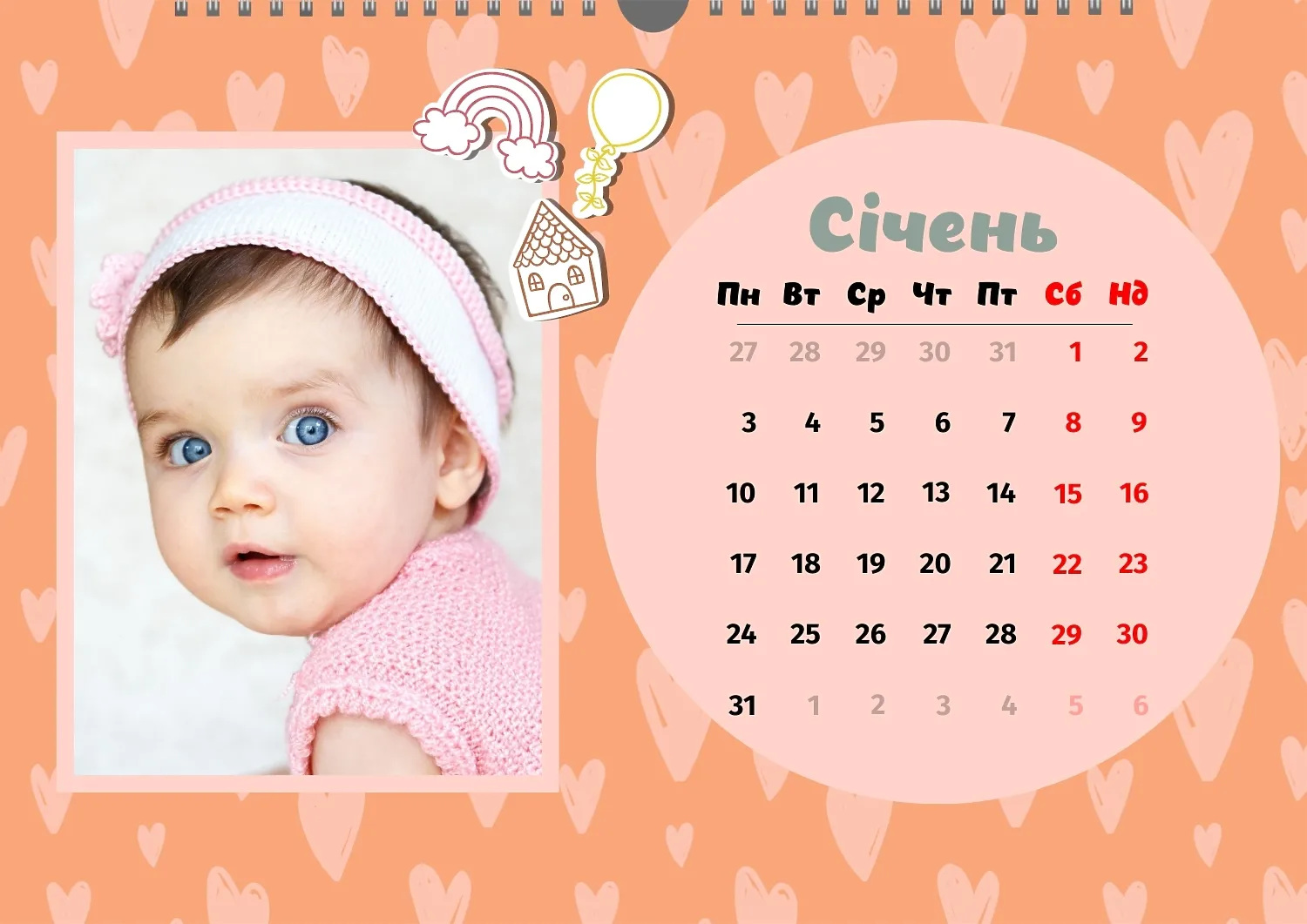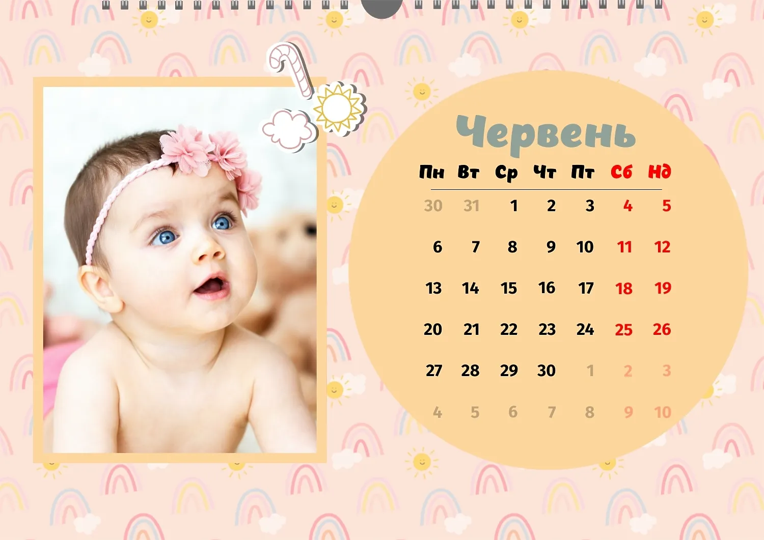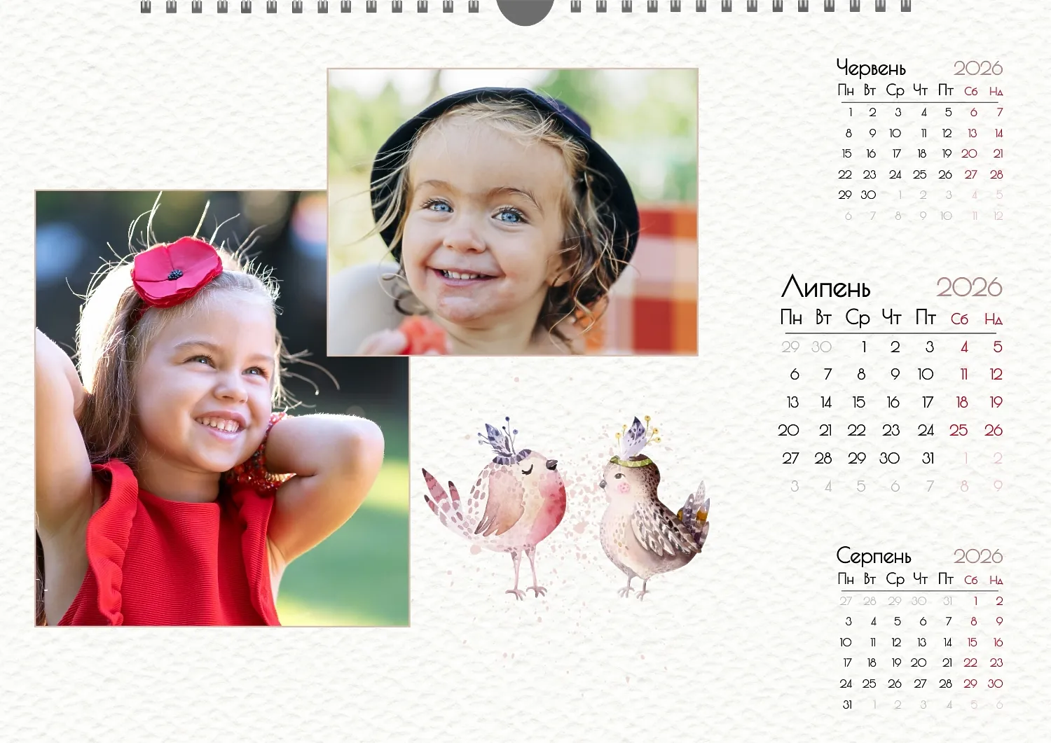 Готовий шаблон настінного горизонтального перекидного календаря з фото дітей і милим декоративним оформленням створений для тих, хто цінує теплі сімейні емоції і хоче перетворити звичайний календар в затишний персональний аксесуар. Ніжні пастельні відтінки, акуратні ілюстрації, дитячі елементи декору і акцент на фотографії роблять такий календар особливо привабливим для батьків, вихователів, педагогів творчих студій, дитячих фотографів і всіх, хто працює з дітьми або створює для них контент. Він підходить для сімейних архівів, дитячих садків, центрів розвитку та невеликих студій, які хочуть запропонувати клієнтам приємний та емоційний продукт. У нашому онлайн-конструкторі цей шаблон легко перетворити під власні завдання. Ви можете замінити фотографії, змінювати розташування елементів, редагувати написи, вибирати інші шрифти і відтінки, додавати декоративні вставки або навпаки — прибирати зайві, щоб створити більш минималистичную композицію. Кожен місяць можна оформити по-різному, додавши важливі дати, індивідуальні примітки або невеликі картинки, які підкреслюють характер дитини або тематику фото.