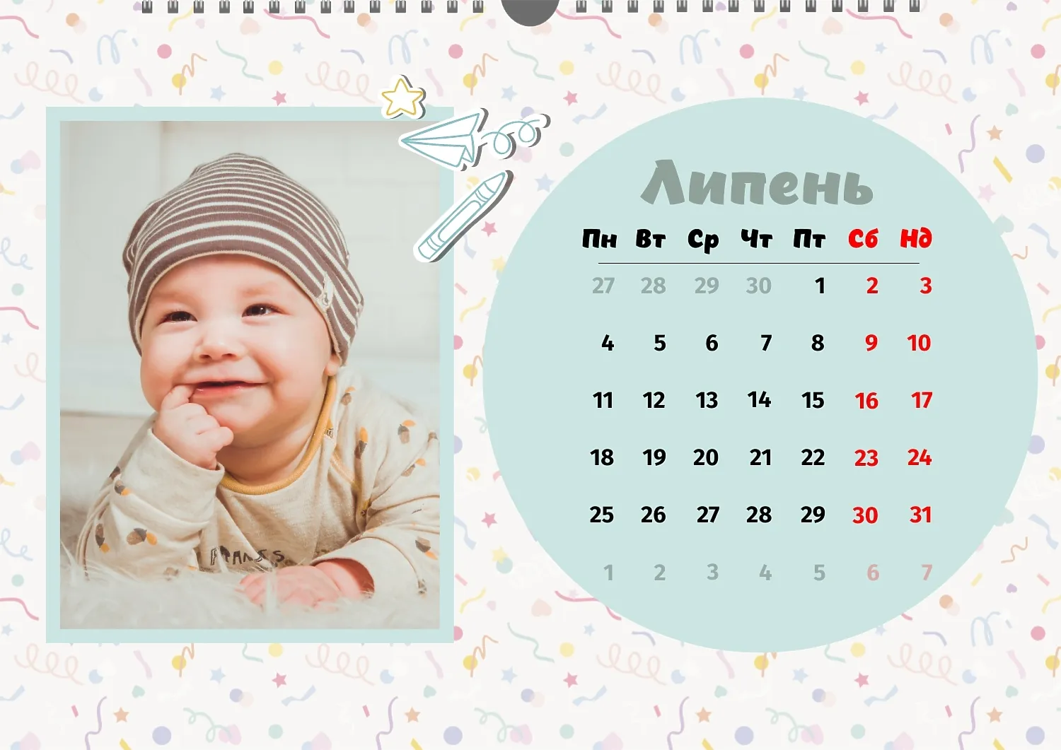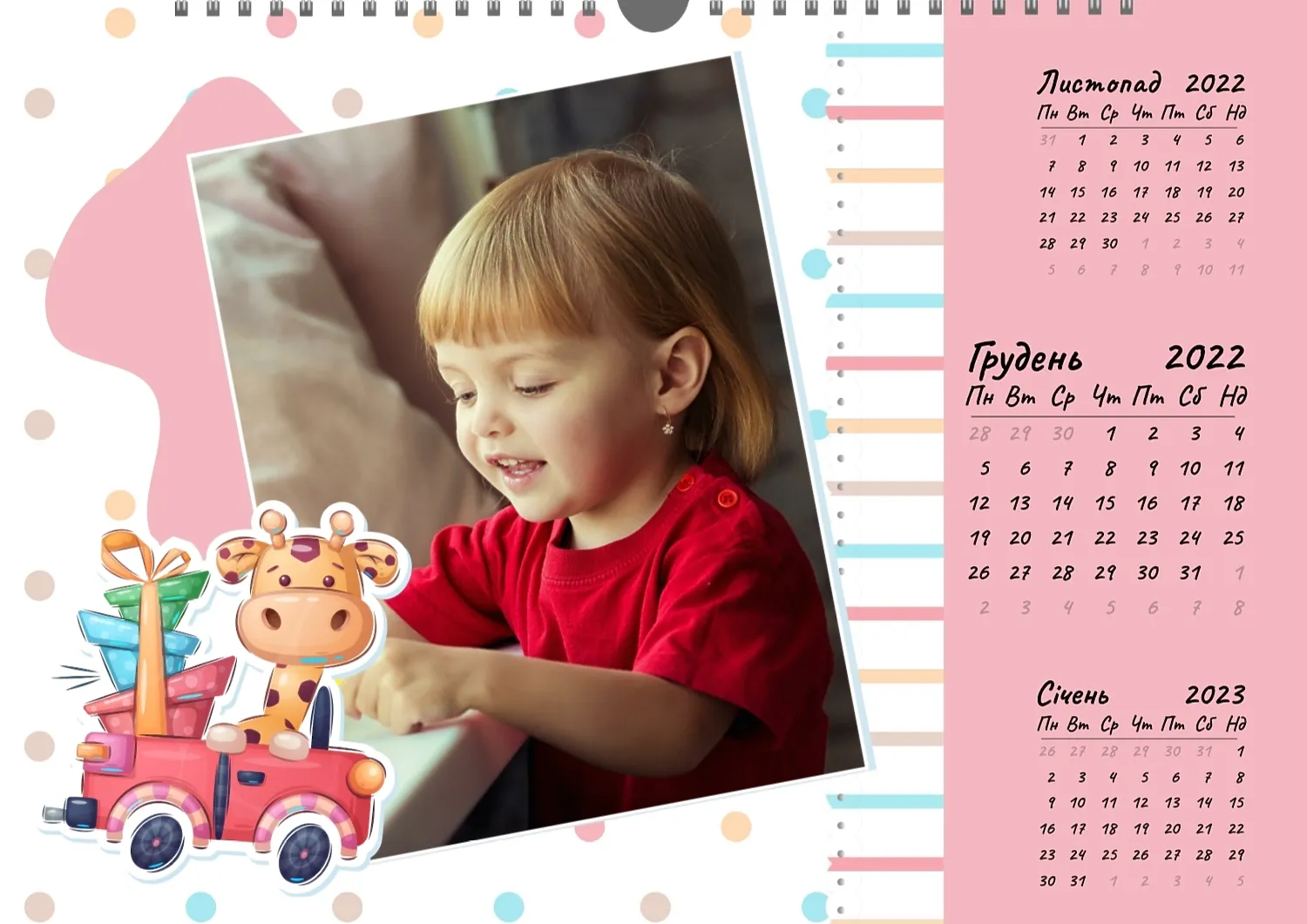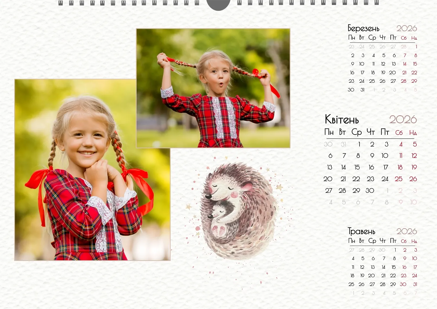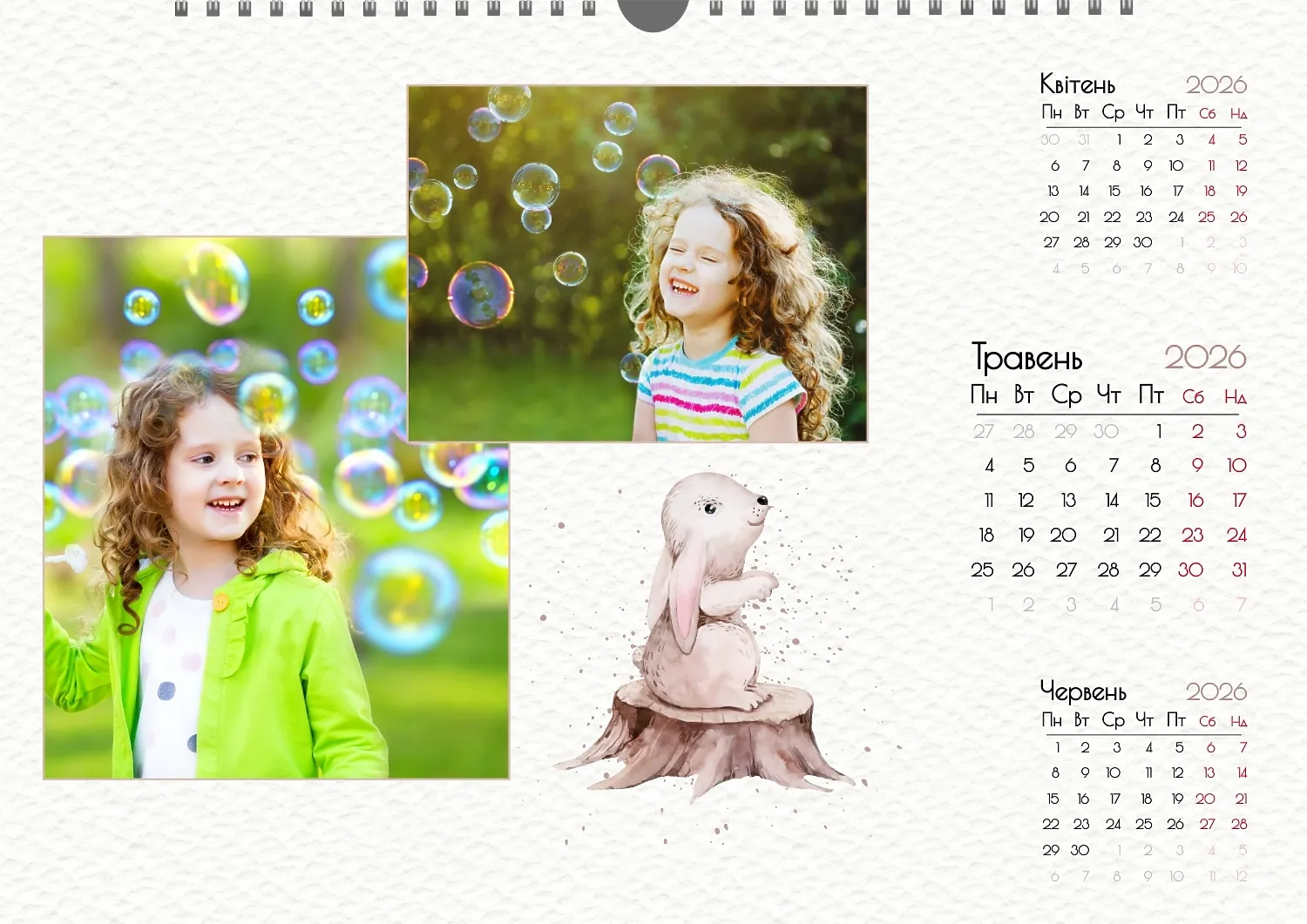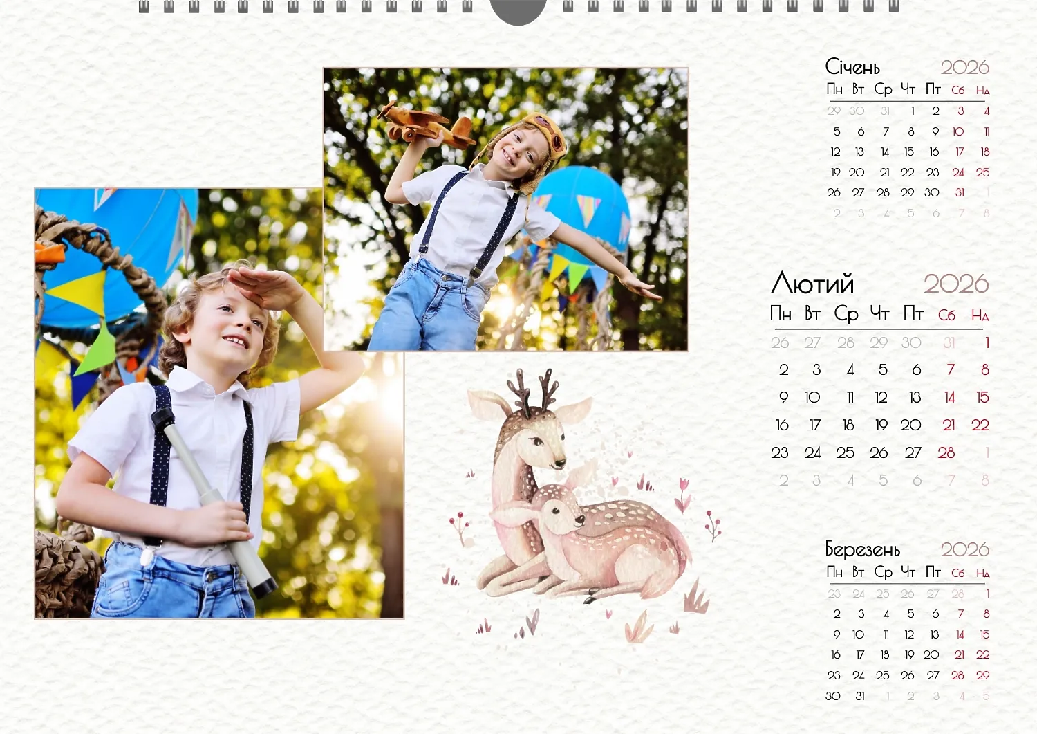 Готовий шаблон настінного горизонтального перекидного календаря з фото дітей і милим декоративним оформленням створений для тих, хто цінує теплі сімейні емоції і хоче перетворити звичайний календар в затишний персональний аксесуар. Ніжні пастельні відтінки, акуратні ілюстрації, дитячі елементи декору і акцент на фотографії роблять такий календар особливо привабливим для батьків, вихователів, педагогів творчих студій, дитячих фотографів і всіх, хто працює з дітьми або створює для них контент. Він підходить для сімейних архівів, дитячих садків, центрів розвитку та невеликих студій, які хочуть запропонувати клієнтам приємний та емоційний продукт. У нашому онлайн-конструкторі цей шаблон легко перетворити під власні завдання. Ви можете замінити фотографії, змінювати розташування елементів, редагувати написи, вибирати інші шрифти і відтінки, додавати декоративні вставки або навпаки — прибирати зайві, щоб створити більш минималистичную композицію. Кожен місяць можна оформити по-різному, додавши важливі дати, індивідуальні примітки або невеликі картинки, які підкреслюють характер дитини або тематику фото.