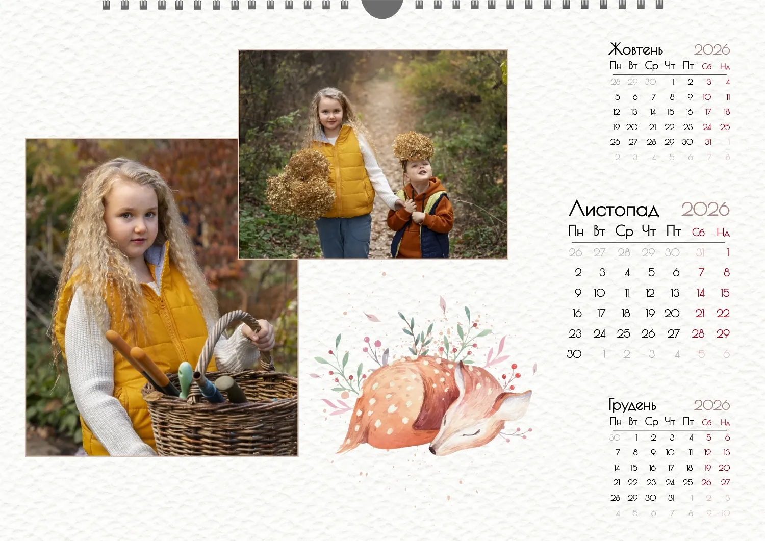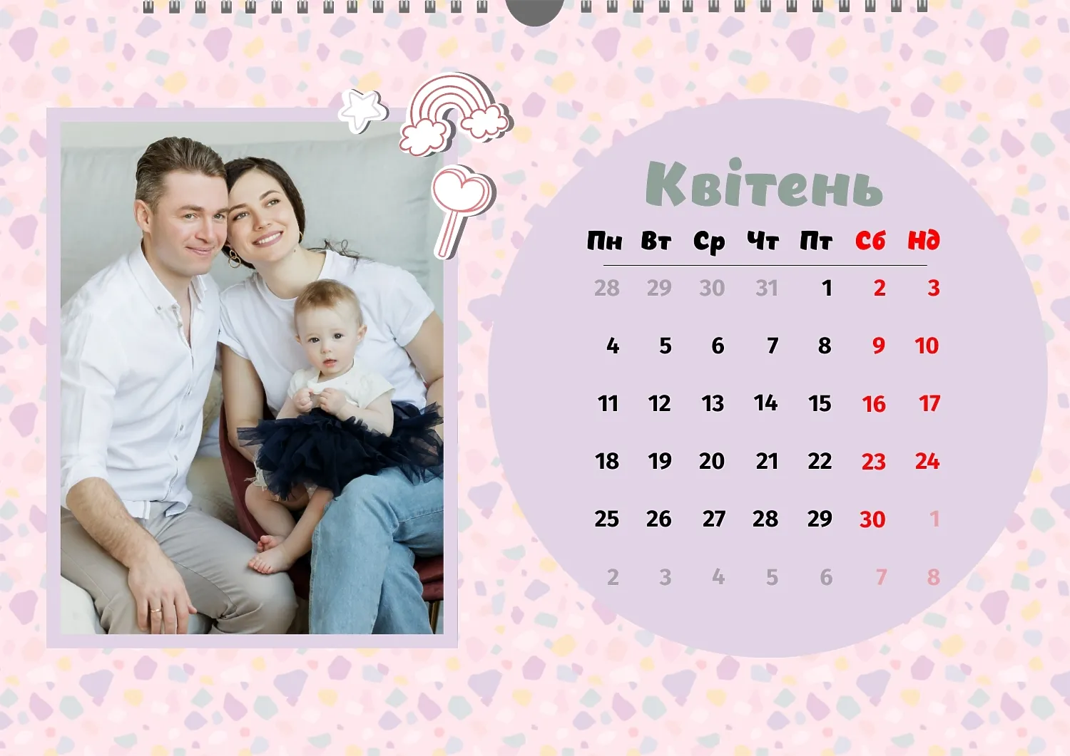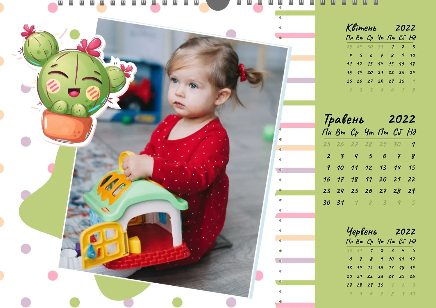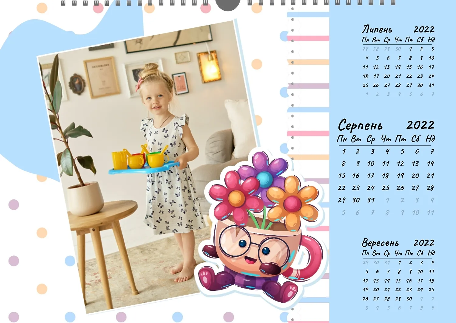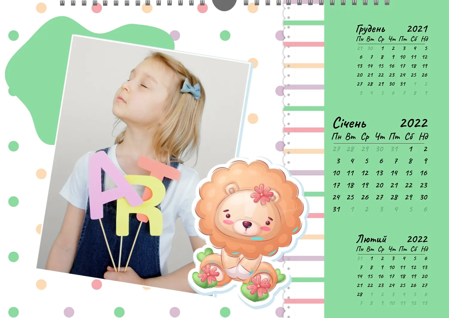 Готовий шаблон настінного горизонтального перекидного календаря з фото дітей і милим декоративним оформленням створений для тих, хто цінує теплі сімейні емоції і хоче перетворити звичайний календар в затишний персональний аксесуар. Ніжні пастельні відтінки, акуратні ілюстрації, дитячі елементи декору і акцент на фотографії роблять такий календар особливо привабливим для батьків, вихователів, педагогів творчих студій, дитячих фотографів і всіх, хто працює з дітьми або створює для них контент. Він підходить для сімейних архівів, дитячих садків, центрів розвитку та невеликих студій, які хочуть запропонувати клієнтам приємний та емоційний продукт. У нашому онлайн-конструкторі цей шаблон легко перетворити під власні завдання. Ви можете замінити фотографії, змінювати розташування елементів, редагувати написи, вибирати інші шрифти і відтінки, додавати декоративні вставки або навпаки — прибирати зайві, щоб створити більш минималистичную композицію. Кожен місяць можна оформити по-різному, додавши важливі дати, індивідуальні примітки або невеликі картинки, які підкреслюють характер дитини або тематику фото.