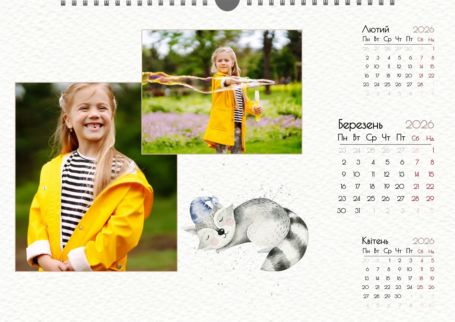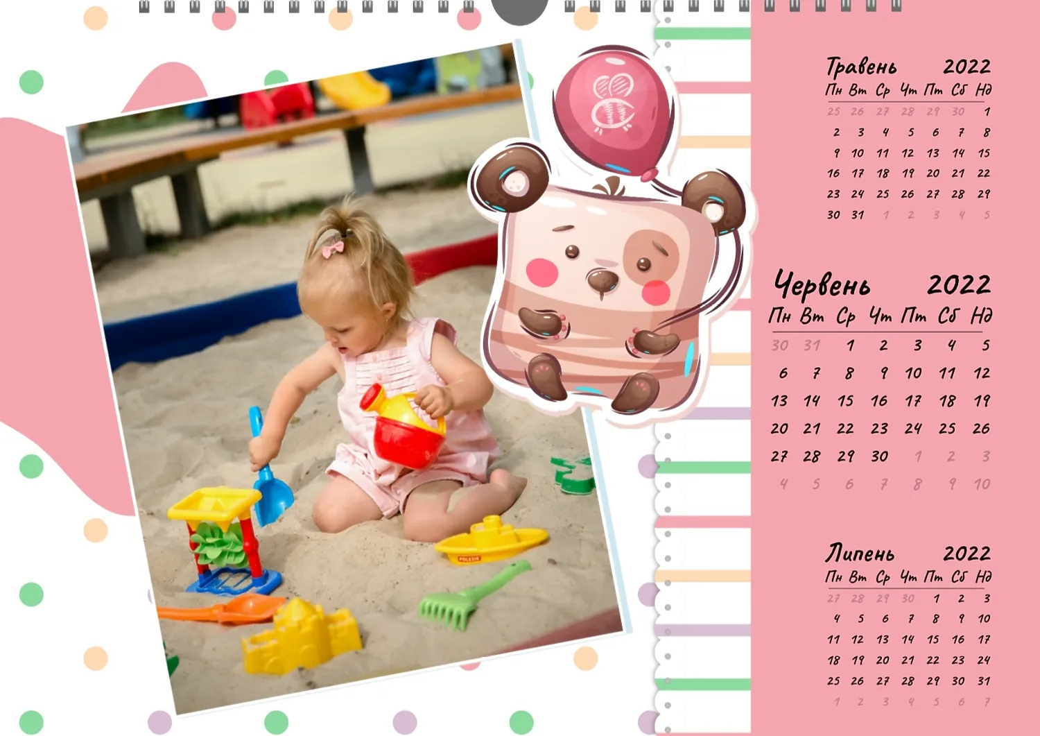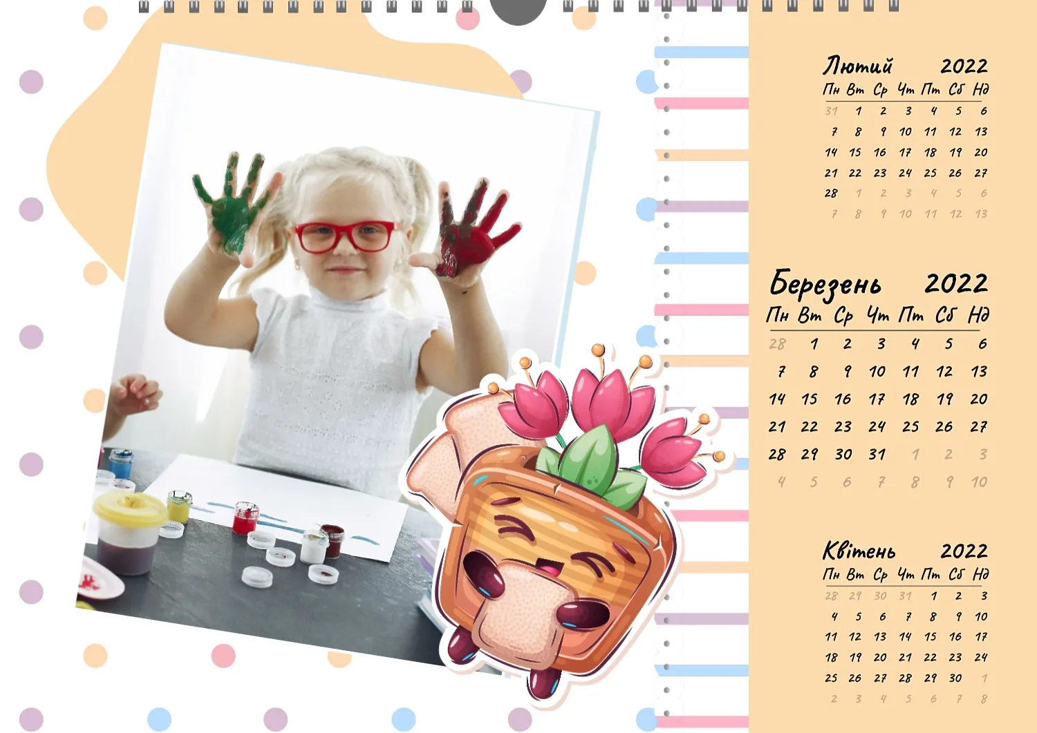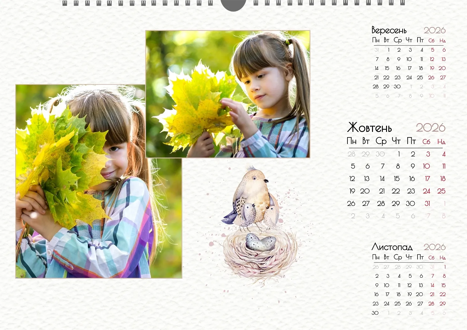 Готовий шаблон настінного горизонтального перекидного календаря з фото дітей і милим декоративним оформленням створений для тих, хто цінує теплі сімейні емоції і хоче перетворити звичайний календар в затишний персональний аксесуар. Ніжні пастельні відтінки, акуратні ілюстрації, дитячі елементи декору і акцент на фотографії роблять такий календар особливо привабливим для батьків, вихователів, педагогів творчих студій, дитячих фотографів і всіх, хто працює з дітьми або створює для них контент. Він підходить для сімейних архівів, дитячих садків, центрів розвитку та невеликих студій, які хочуть запропонувати клієнтам приємний та емоційний продукт. У нашому онлайн-конструкторі цей шаблон легко перетворити під власні завдання. Ви можете замінити фотографії, змінювати розташування елементів, редагувати написи, вибирати інші шрифти і відтінки, додавати декоративні вставки або навпаки — прибирати зайві, щоб створити більш минималистичную композицію. Кожен місяць можна оформити по-різному, додавши важливі дати, індивідуальні примітки або невеликі картинки, які підкреслюють характер дитини або тематику фото.