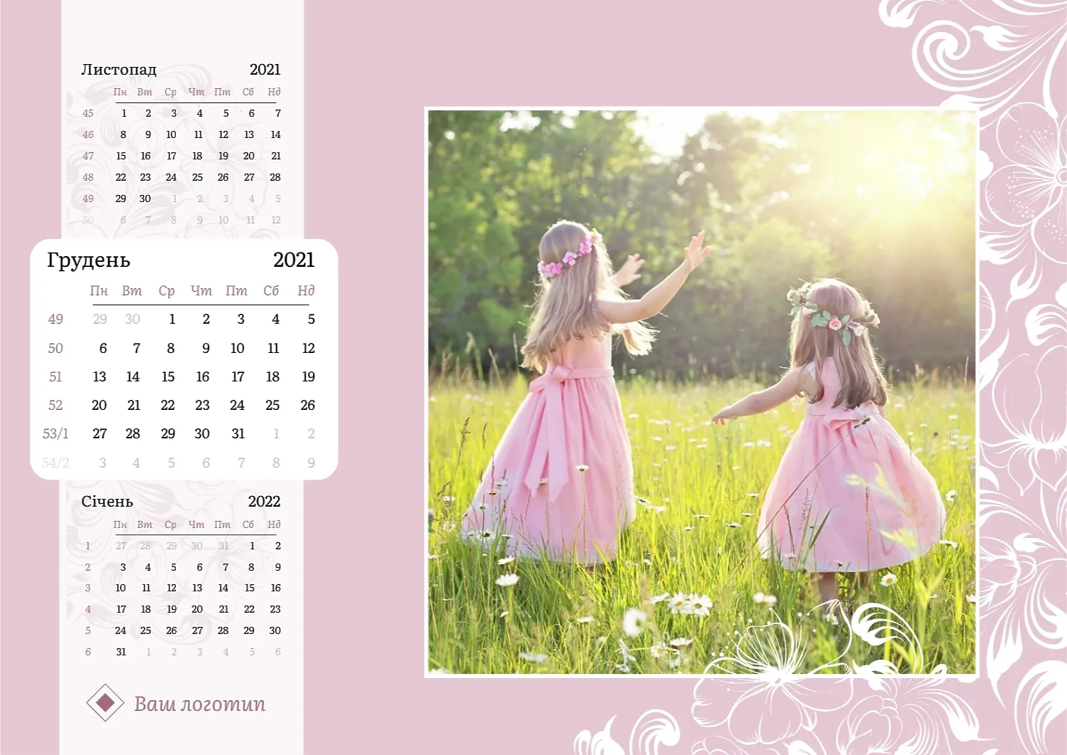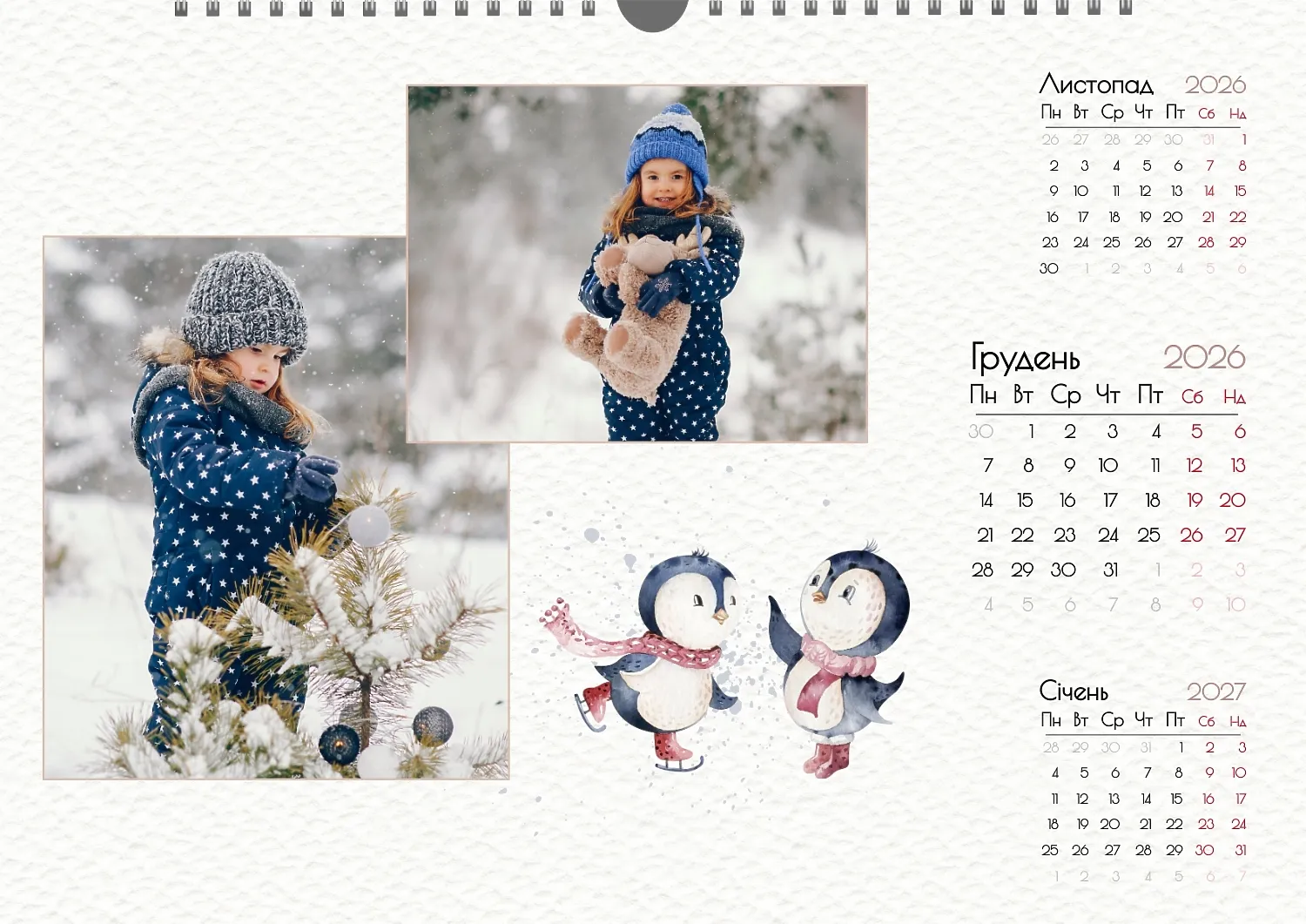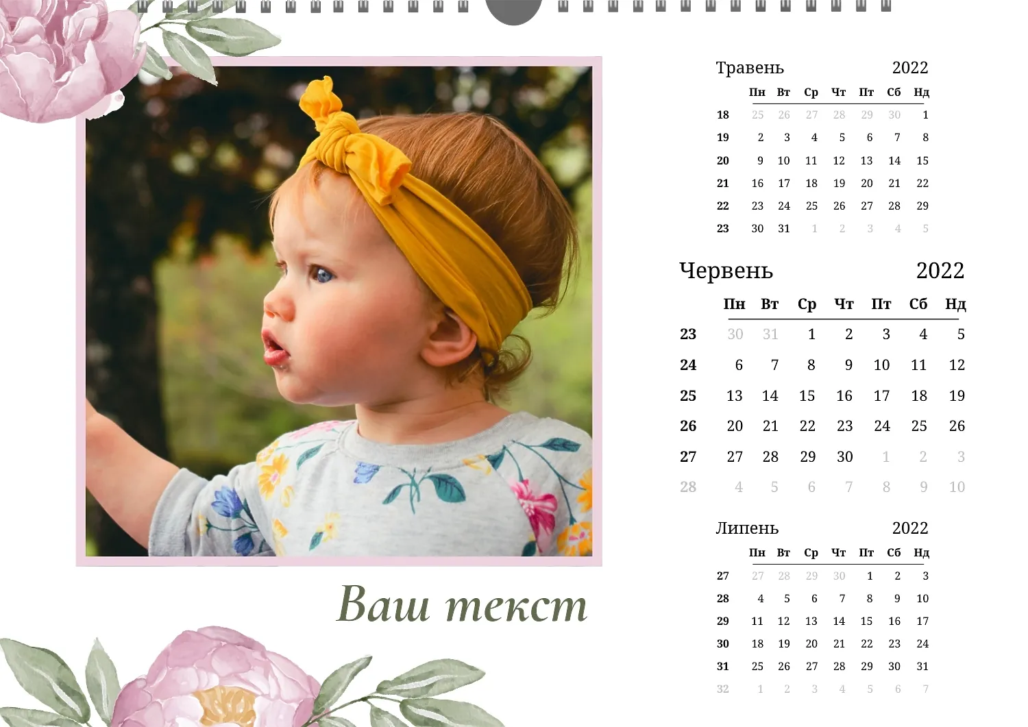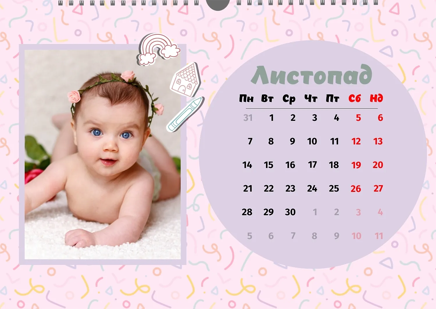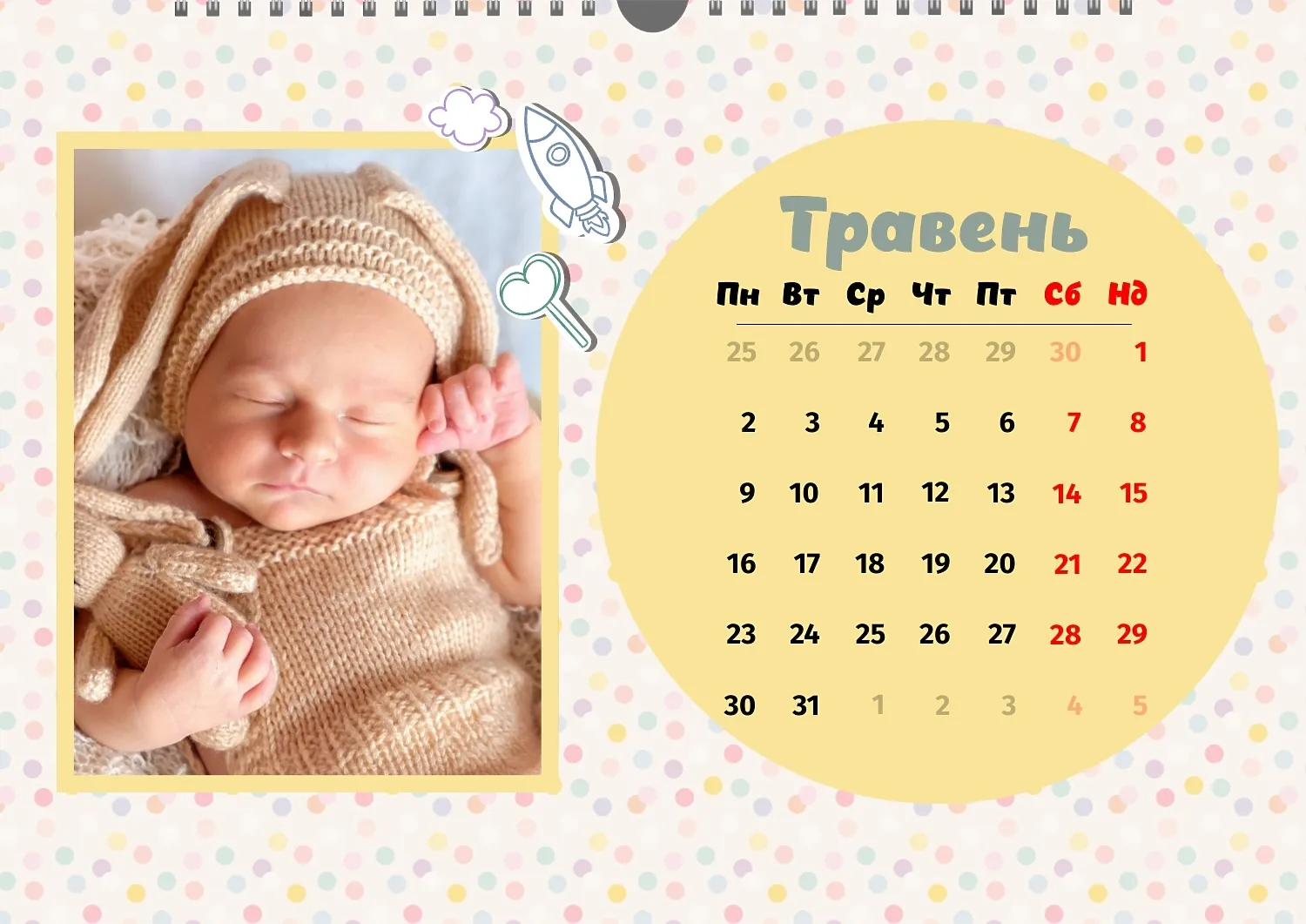 Готовий шаблон настінного горизонтального перекидного календаря з фото дітей і милим декоративним оформленням створений для тих, хто цінує теплі сімейні емоції і хоче перетворити звичайний календар в затишний персональний аксесуар. Ніжні пастельні відтінки, акуратні ілюстрації, дитячі елементи декору і акцент на фотографії роблять такий календар особливо привабливим для батьків, вихователів, педагогів творчих студій, дитячих фотографів і всіх, хто працює з дітьми або створює для них контент. Він підходить для сімейних архівів, дитячих садків, центрів розвитку та невеликих студій, які хочуть запропонувати клієнтам приємний та емоційний продукт. У нашому онлайн-конструкторі цей шаблон легко перетворити під власні завдання. Ви можете замінити фотографії, змінювати розташування елементів, редагувати написи, вибирати інші шрифти і відтінки, додавати декоративні вставки або навпаки — прибирати зайві, щоб створити більш минималистичную композицію. Кожен місяць можна оформити по-різному, додавши важливі дати, індивідуальні примітки або невеликі картинки, які підкреслюють характер дитини або тематику фото.