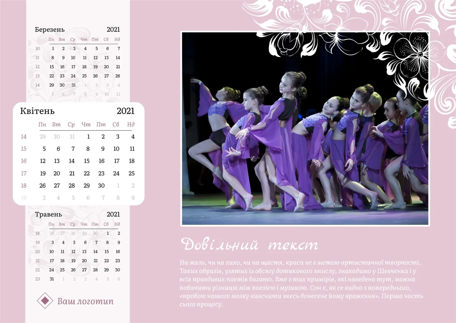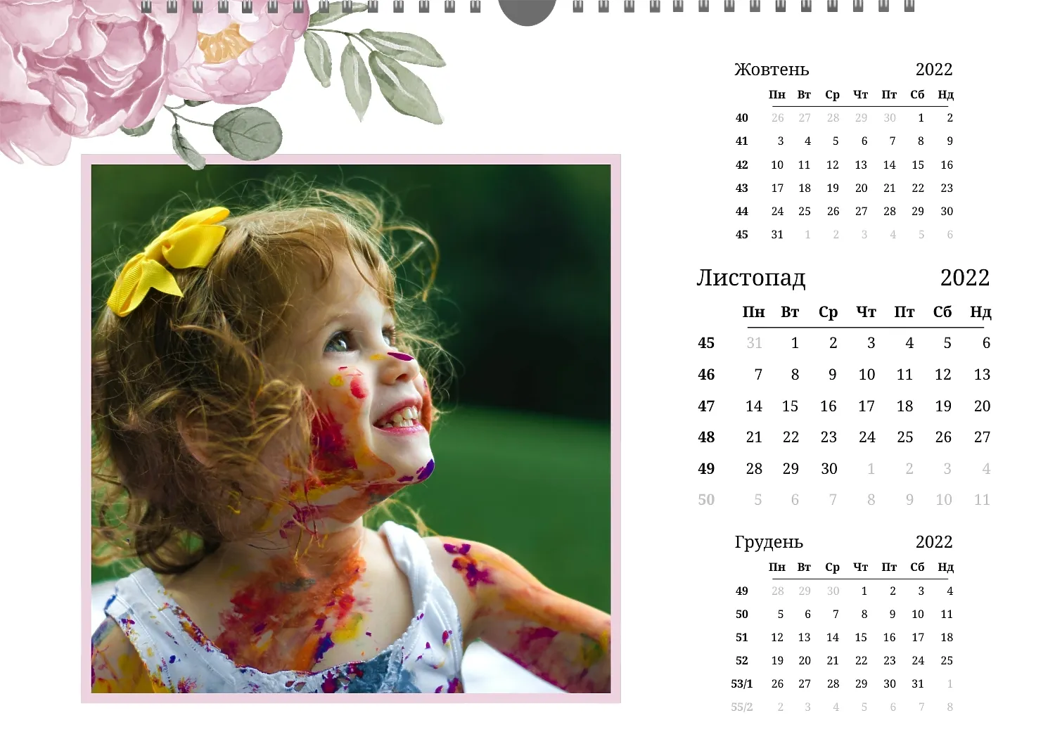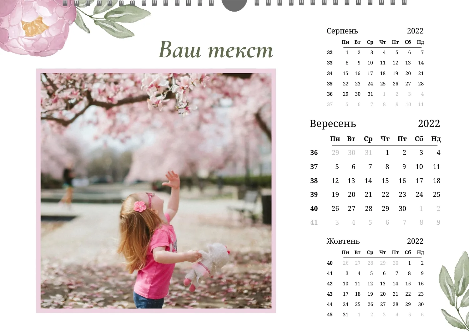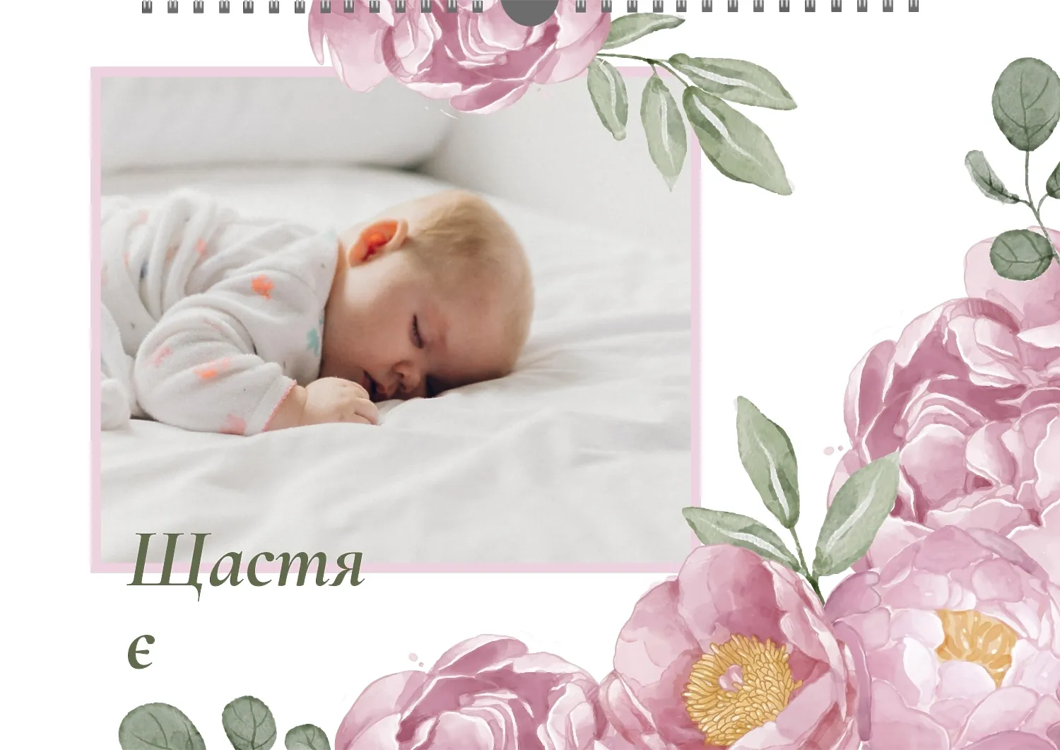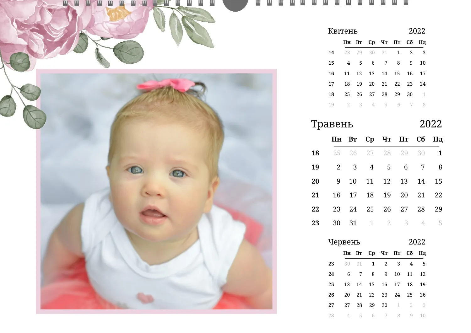 Готовий шаблон настінного горизонтального перекидного календаря з фото дітей і милим декоративним оформленням створений для тих, хто цінує теплі сімейні емоції і хоче перетворити звичайний календар в затишний персональний аксесуар. Ніжні пастельні відтінки, акуратні ілюстрації, дитячі елементи декору і акцент на фотографії роблять такий календар особливо привабливим для батьків, вихователів, педагогів творчих студій, дитячих фотографів і всіх, хто працює з дітьми або створює для них контент. Він підходить для сімейних архівів, дитячих садків, центрів розвитку та невеликих студій, які хочуть запропонувати клієнтам приємний та емоційний продукт. У нашому онлайн-конструкторі цей шаблон легко перетворити під власні завдання. Ви можете замінити фотографії, змінювати розташування елементів, редагувати написи, вибирати інші шрифти і відтінки, додавати декоративні вставки або навпаки — прибирати зайві, щоб створити більш минималистичную композицію. Кожен місяць можна оформити по-різному, додавши важливі дати, індивідуальні примітки або невеликі картинки, які підкреслюють характер дитини або тематику фото.