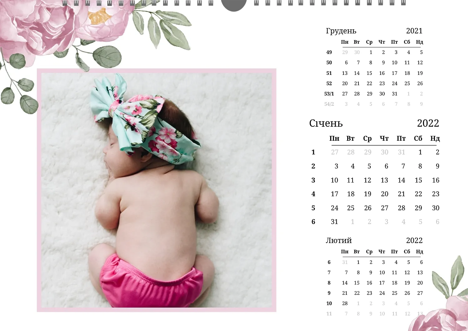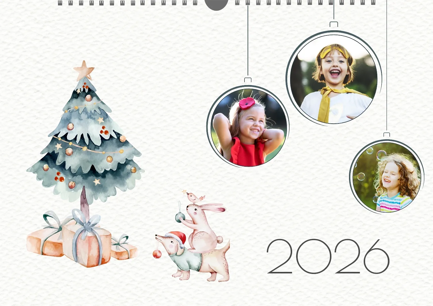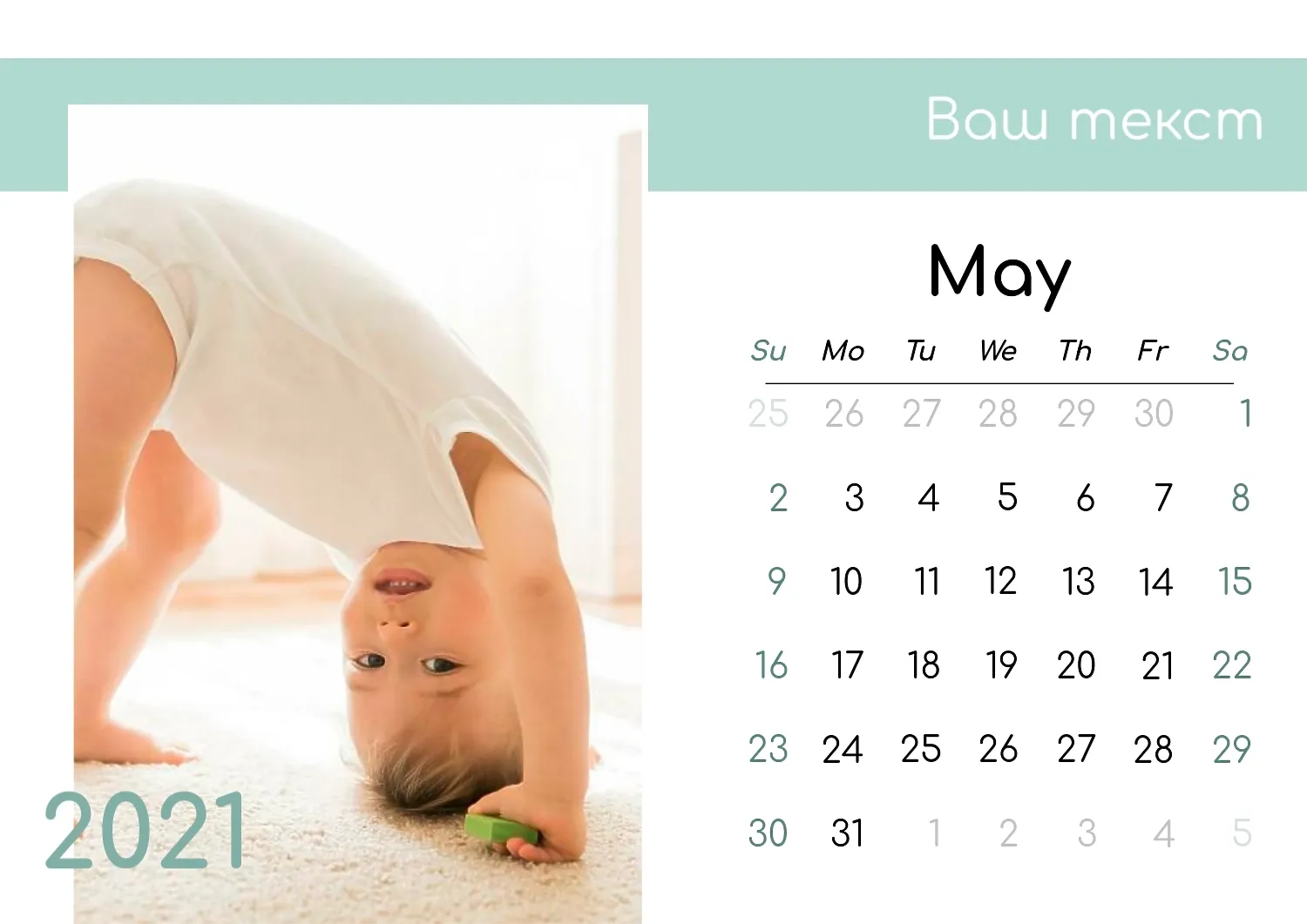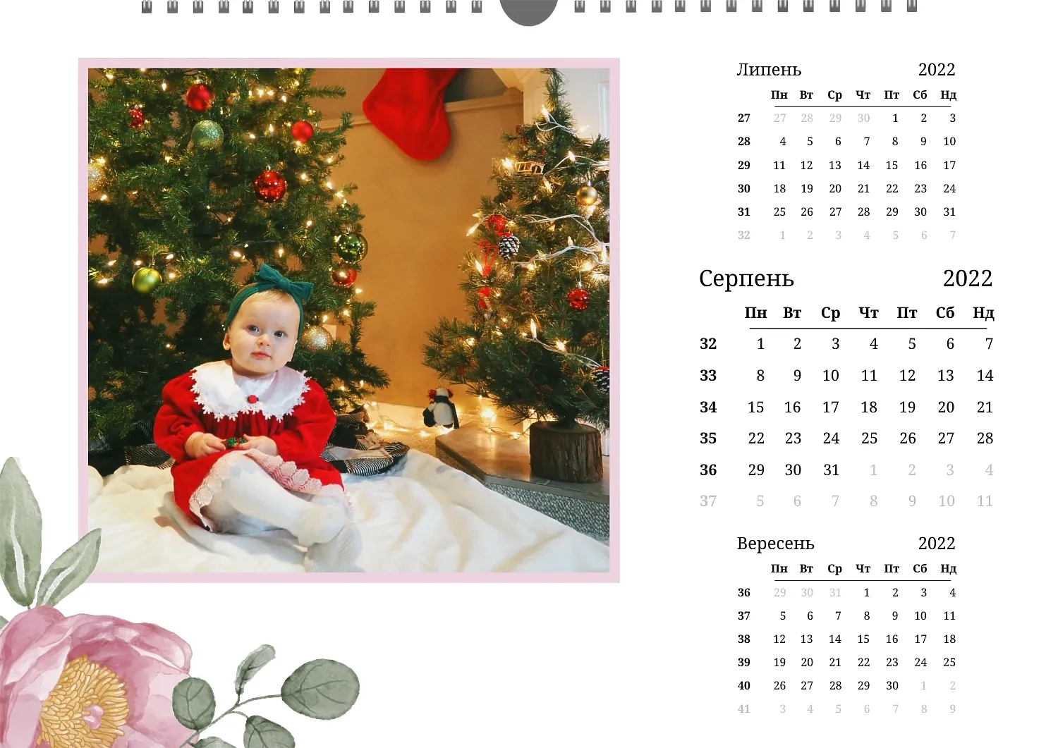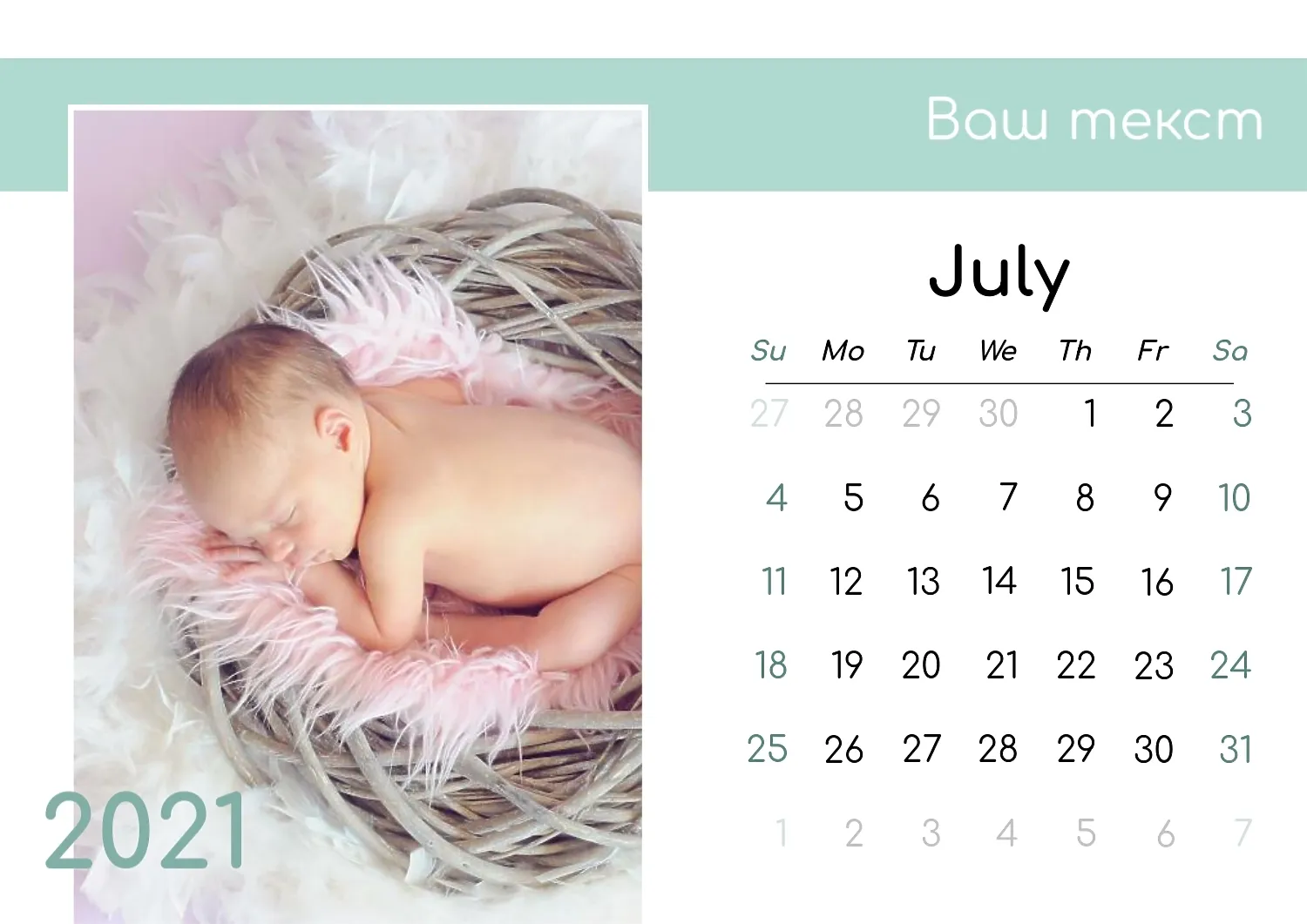 Готовий шаблон настінного горизонтального перекидного календаря з фото дітей і милим декоративним оформленням створений для тих, хто цінує теплі сімейні емоції і хоче перетворити звичайний календар в затишний персональний аксесуар. Ніжні пастельні відтінки, акуратні ілюстрації, дитячі елементи декору і акцент на фотографії роблять такий календар особливо привабливим для батьків, вихователів, педагогів творчих студій, дитячих фотографів і всіх, хто працює з дітьми або створює для них контент. Він підходить для сімейних архівів, дитячих садків, центрів розвитку та невеликих студій, які хочуть запропонувати клієнтам приємний та емоційний продукт. У нашому онлайн-конструкторі цей шаблон легко перетворити під власні завдання. Ви можете замінити фотографії, змінювати розташування елементів, редагувати написи, вибирати інші шрифти і відтінки, додавати декоративні вставки або навпаки — прибирати зайві, щоб створити більш минималистичную композицію. Кожен місяць можна оформити по-різному, додавши важливі дати, індивідуальні примітки або невеликі картинки, які підкреслюють характер дитини або тематику фото.