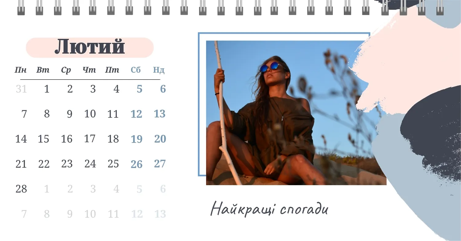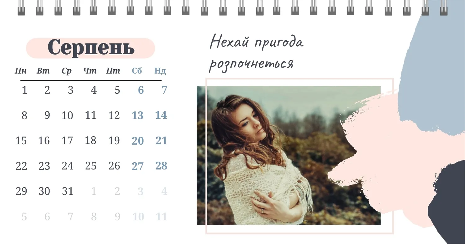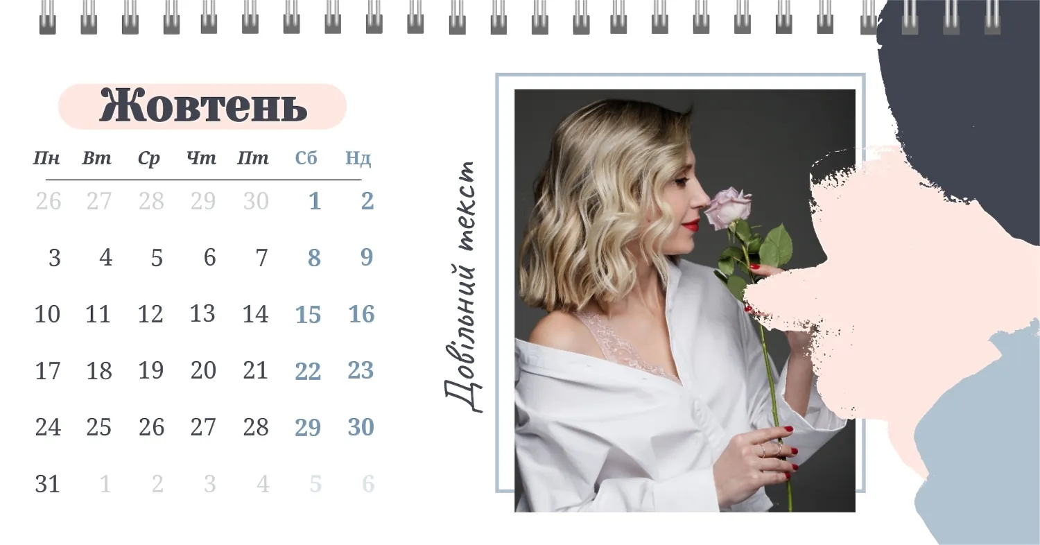 Готовий шаблон настільного перекидного календаря "Привіт" створений для тих, хто любить сучасний і доброзичливий стиль в оформленні. В онлайн-конструкторі шаблон легко адаптується під ваші завдання і стиль. Можна замінити фон на більш спокійний або навпаки яскравий, змінити розташування, вибрати інший стиль шрифтів, додати ілюстрації, декоративні елементи або фотографії. Щомісяця можна оформити по-своєму: наприклад, використовувати фотографії колективу, улюблені сімейні знімки або зображення проектів і робіт. Також легко внести важливі дати-корпоративні заходи, особисті свята, дедлайни або дні народження близьких. Редагування проходить максимально просто і інтуїтивно, не вимагаючи спеціальних навичок в дизайні. Всі елементи можна переміщати, збільшувати, перефарбовувати, а результат відразу відображається на екрані. Ви самостійно формуєте настрій календаря: ніжне і домашнє, ділове і стримане або яскраве і надихаюче. Використовуючи шаблон "Привіт" в нашому онлайн-конструкторі, ви створюєте не просто календар, а особистий прикрашений акцент простору, який буде радувати і надихати протягом усього року.