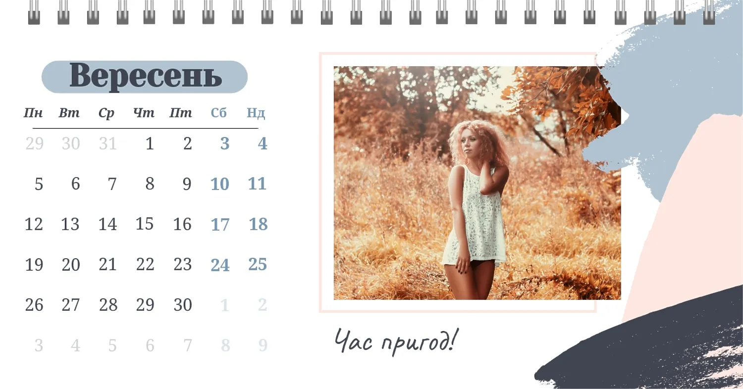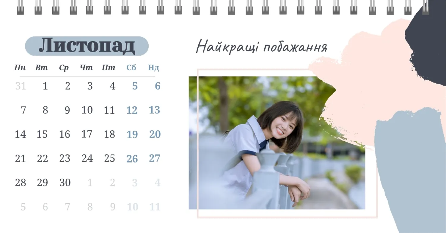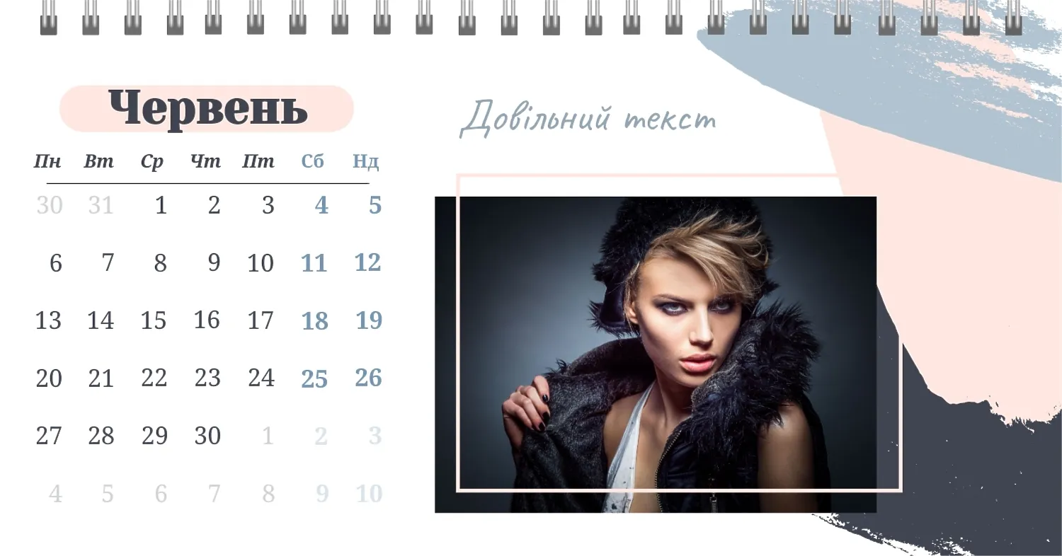 Готовий шаблон настільного перекидного календаря "Привіт" створений для тих, хто любить сучасний і доброзичливий стиль в оформленні. В онлайн-конструкторі шаблон легко адаптується під ваші завдання і стиль. Можна замінити фон на більш спокійний або навпаки яскравий, змінити розташування, вибрати інший стиль шрифтів, додати ілюстрації, декоративні елементи або фотографії. Щомісяця можна оформити по-своєму: наприклад, використовувати фотографії колективу, улюблені сімейні знімки або зображення проектів і робіт. Також легко внести важливі дати-корпоративні заходи, особисті свята, дедлайни або дні народження близьких. Редагування проходить максимально просто і інтуїтивно, не вимагаючи спеціальних навичок в дизайні. Всі елементи можна переміщати, збільшувати, перефарбовувати, а результат відразу відображається на екрані. Ви самостійно формуєте настрій календаря: ніжне і домашнє, ділове і стримане або яскраве і надихаюче. Використовуючи шаблон "Привіт" в нашому онлайн-конструкторі, ви створюєте не просто календар, а особистий прикрашений акцент простору, який буде радувати і надихати протягом усього року.