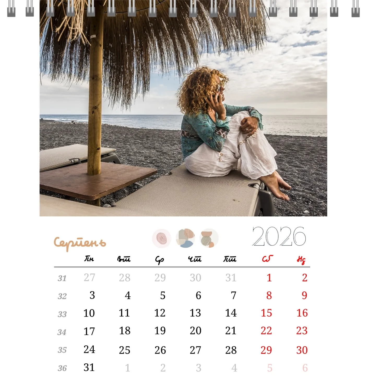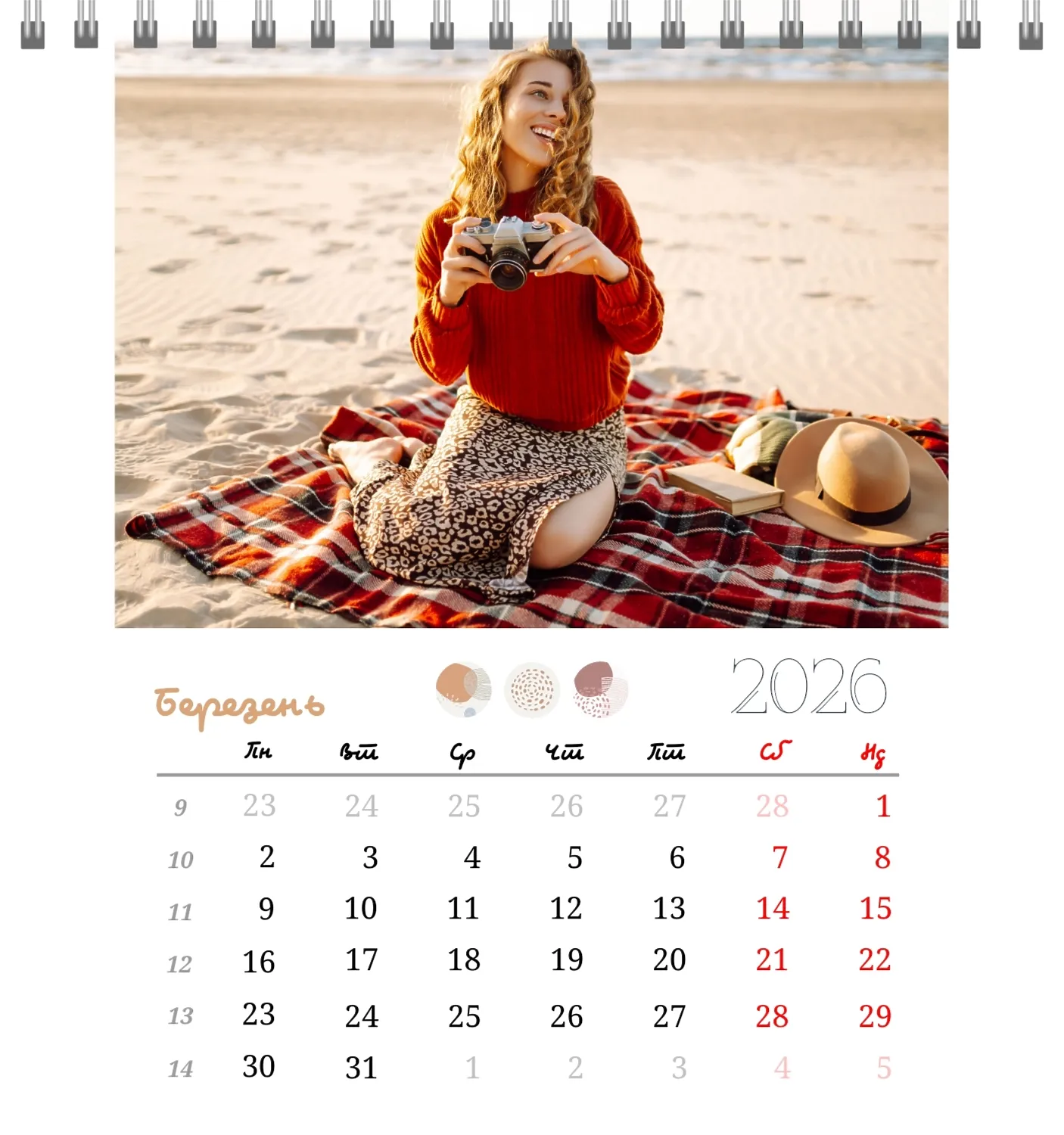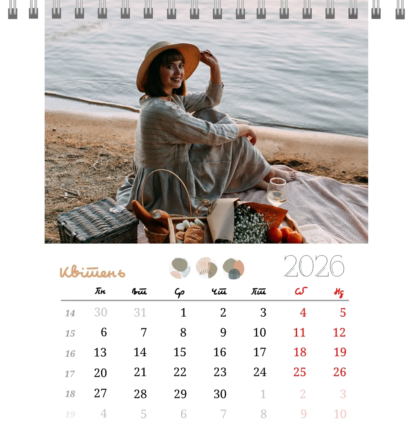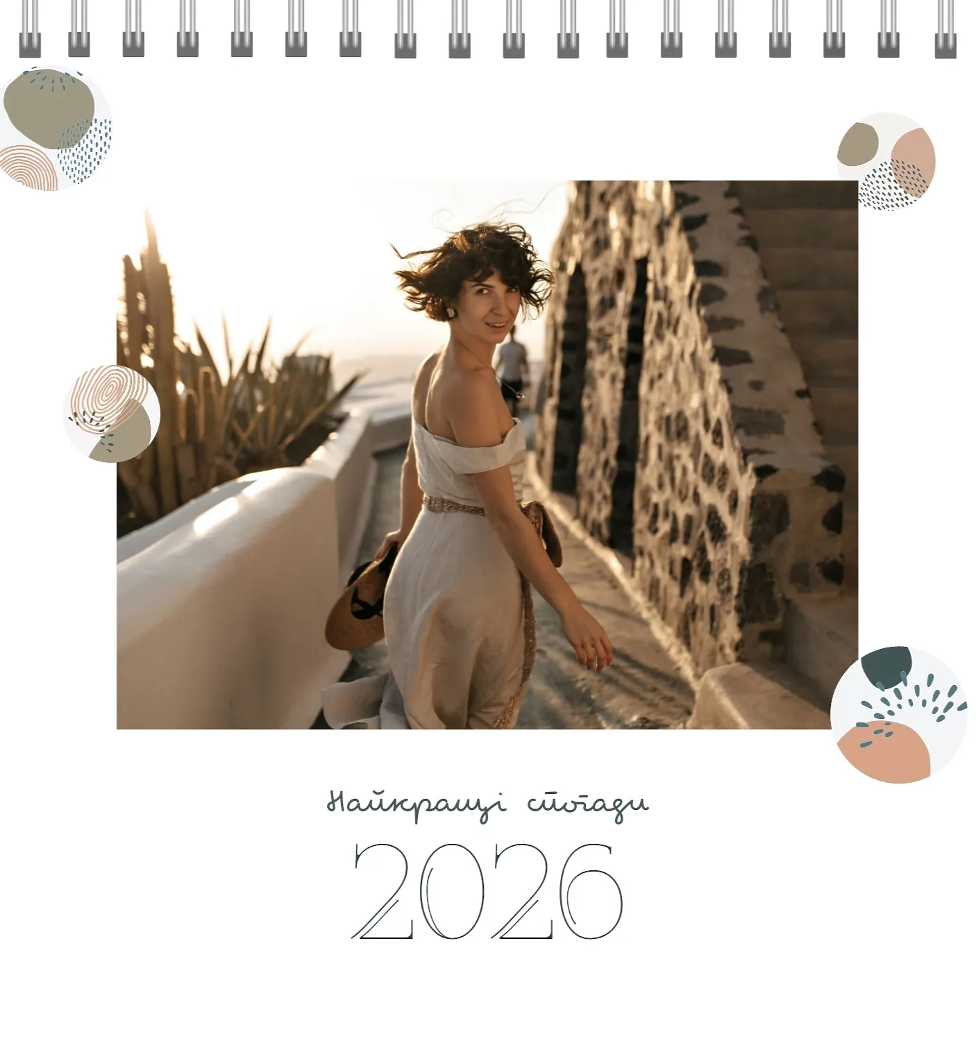 Готовий шаблон настільного квадратного перекидного календаря» спогади " створений для тих, хто цінує теплі моменти і хоче зберегти їх у повсякденному житті. Його м'яка композиція, світла палітра і акуратні декоративні деталі дозволяють підкреслити атмосферу сімейного затишку, подорожей, подій і дорогих серцю зустрічей. Такий шаблон Підходить батькам, вчителям, фотографам, творчим студіям, власникам невеликих брендів, а також всім, хто хоче оформити особисті або робочі простори з душевним акцентом. Він однаково доречний і вдома, і в офісі, і в студії — скрізь, де важливі емоції і візуальна естетика. В онлайн-конструкторі цей календар можна легко адаптувати під свій стиль. Кожну сторінку можна наповнити власними фотографіями — від сімейних знімків до портретів учнів або кадрів з заходів. Підписи та дати редагуються: ви можете змінити назви місяців, додати важливі події, виділити дні народження, пам'ятні дати або культурні заходи вашої організації. Шрифти і кольори написів також налаштовуються, дозволяючи зробити календар більш яскравим, більш суворим або, навпаки, максимально ніжним. При бажанні можна додати логотип компанії, слоган, контактну інформацію або залишити дизайн повністю особистим і домашнім. Шаблон "спогади" розрахований на самостійне створення унікального календаря прямо в онлайн-конструкторі, без необхідності володіти професійними графічними програмами. Все редагування відбувається інтуїтивно і крок за кроком, а результат буде виглядати професійно і гармонійно. Такий календар стає не просто прикрасою стін, а справжньою історією, яка буде нагадувати про найголовніше кожен день.
