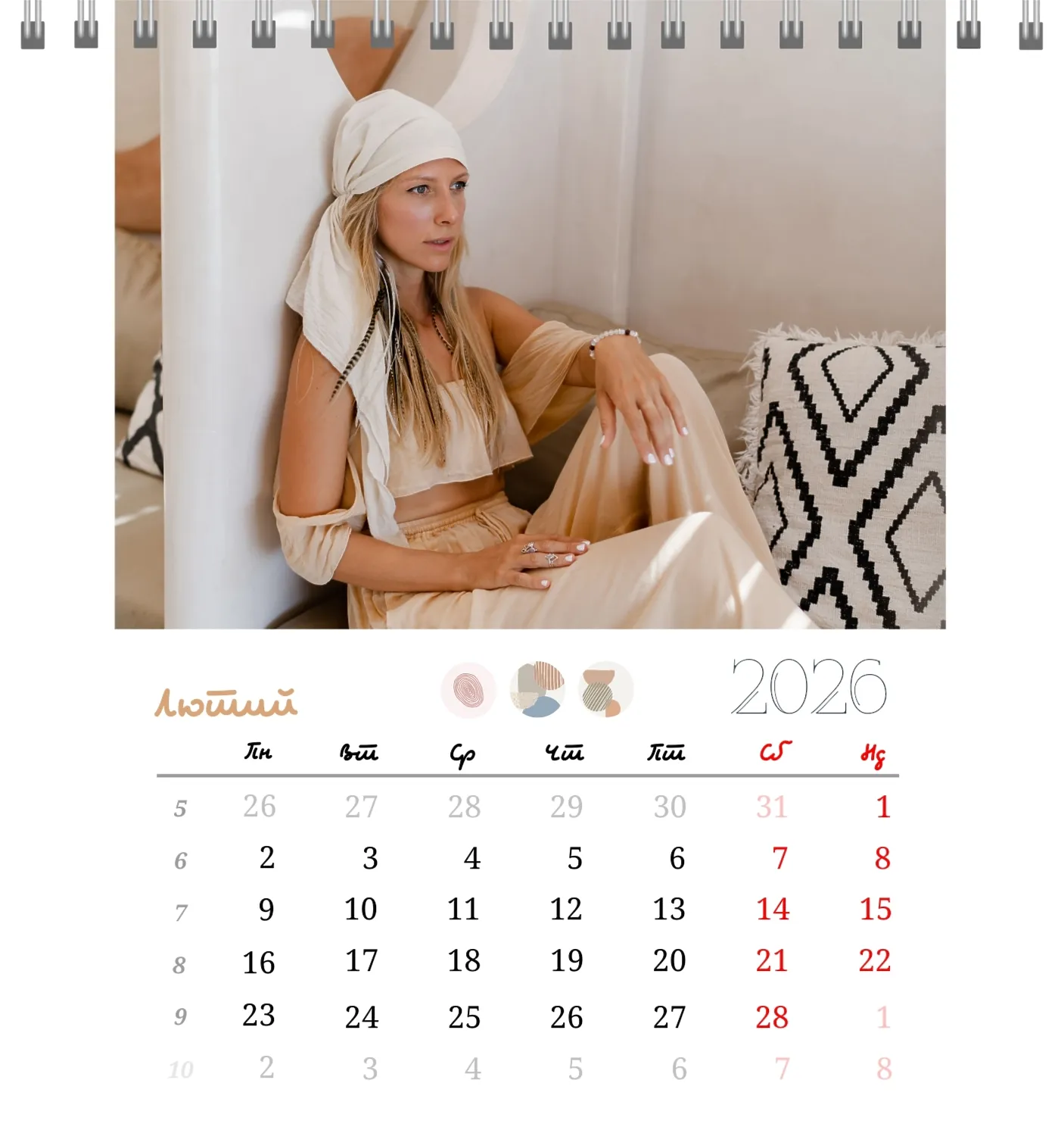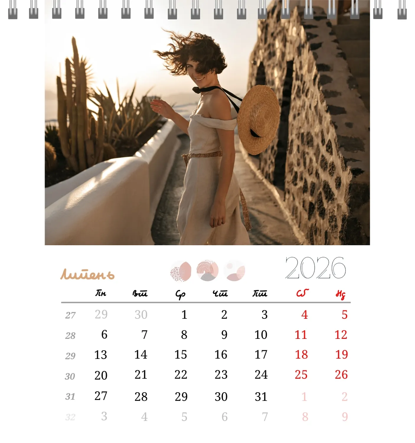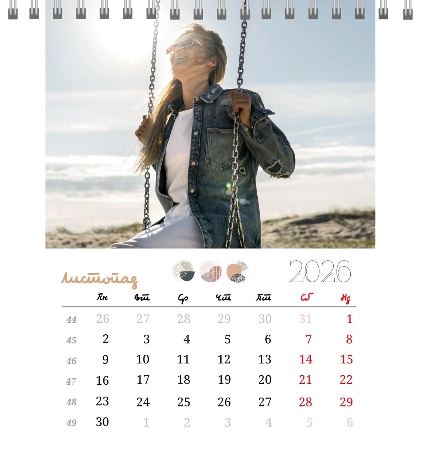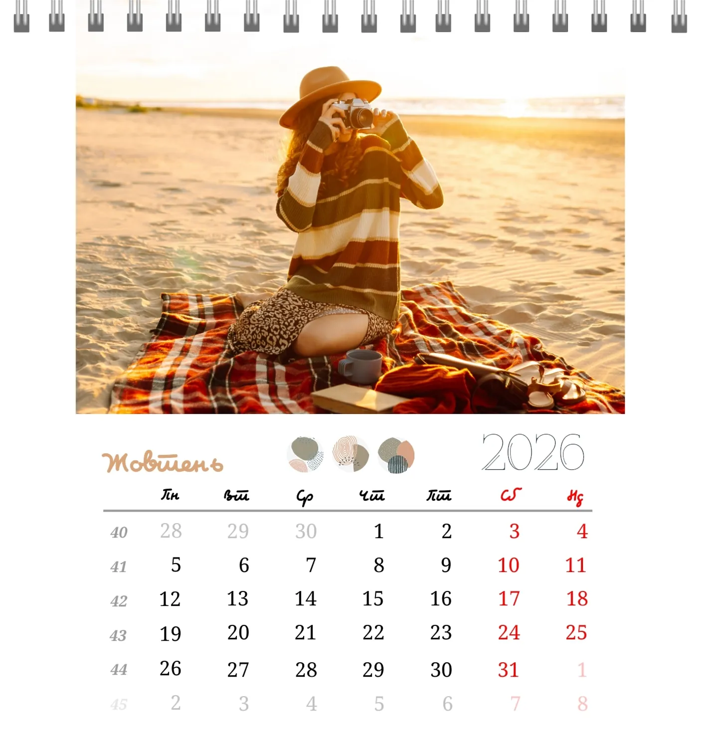 Готовий шаблон настільного квадратного перекидного календаря» спогади " створений для тих, хто цінує теплі моменти і хоче зберегти їх у повсякденному житті. Його м'яка композиція, світла палітра і акуратні декоративні деталі дозволяють підкреслити атмосферу сімейного затишку, подорожей, подій і дорогих серцю зустрічей. Такий шаблон Підходить батькам, вчителям, фотографам, творчим студіям, власникам невеликих брендів, а також всім, хто хоче оформити особисті або робочі простори з душевним акцентом. Він однаково доречний і вдома, і в офісі, і в студії — скрізь, де важливі емоції і візуальна естетика. В онлайн-конструкторі цей календар можна легко адаптувати під свій стиль. Кожну сторінку можна наповнити власними фотографіями — від сімейних знімків до портретів учнів або кадрів з заходів. Підписи та дати редагуються: ви можете змінити назви місяців, додати важливі події, виділити дні народження, пам'ятні дати або культурні заходи вашої організації. Шрифти і кольори написів також налаштовуються, дозволяючи зробити календар більш яскравим, більш суворим або, навпаки, максимально ніжним. При бажанні можна додати логотип компанії, слоган, контактну інформацію або залишити дизайн повністю особистим і домашнім. Шаблон "спогади" розрахований на самостійне створення унікального календаря прямо в онлайн-конструкторі, без необхідності володіти професійними графічними програмами. Все редагування відбувається інтуїтивно і крок за кроком, а результат буде виглядати професійно і гармонійно. Такий календар стає не просто прикрасою стін, а справжньою історією, яка буде нагадувати про найголовніше кожен день.