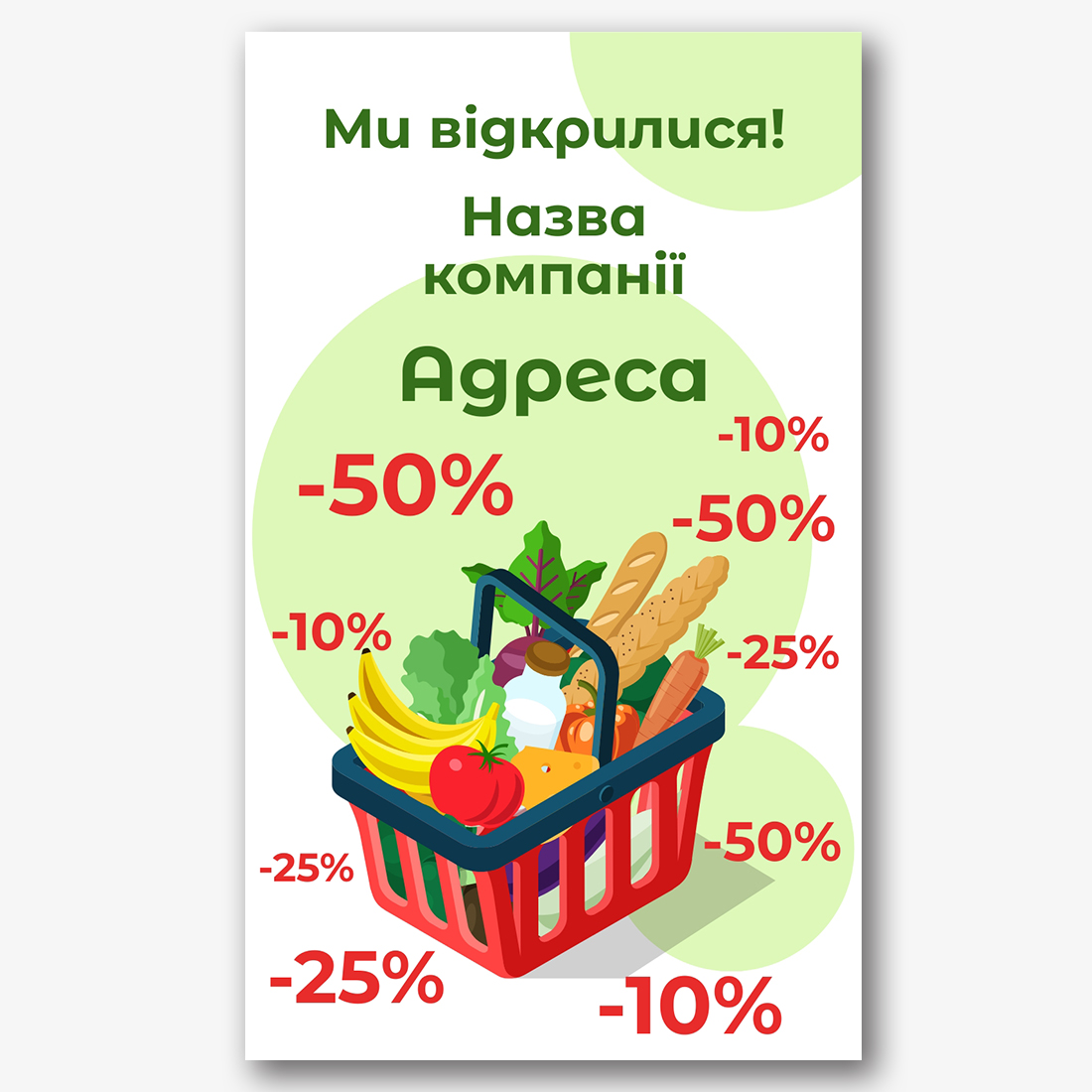 Безкоштовний шаблон банера онлайн для реклами знижок та акцій, компаній та послуг. Створіть макет банера своїми руками в онлайн-конструкторі банерів.