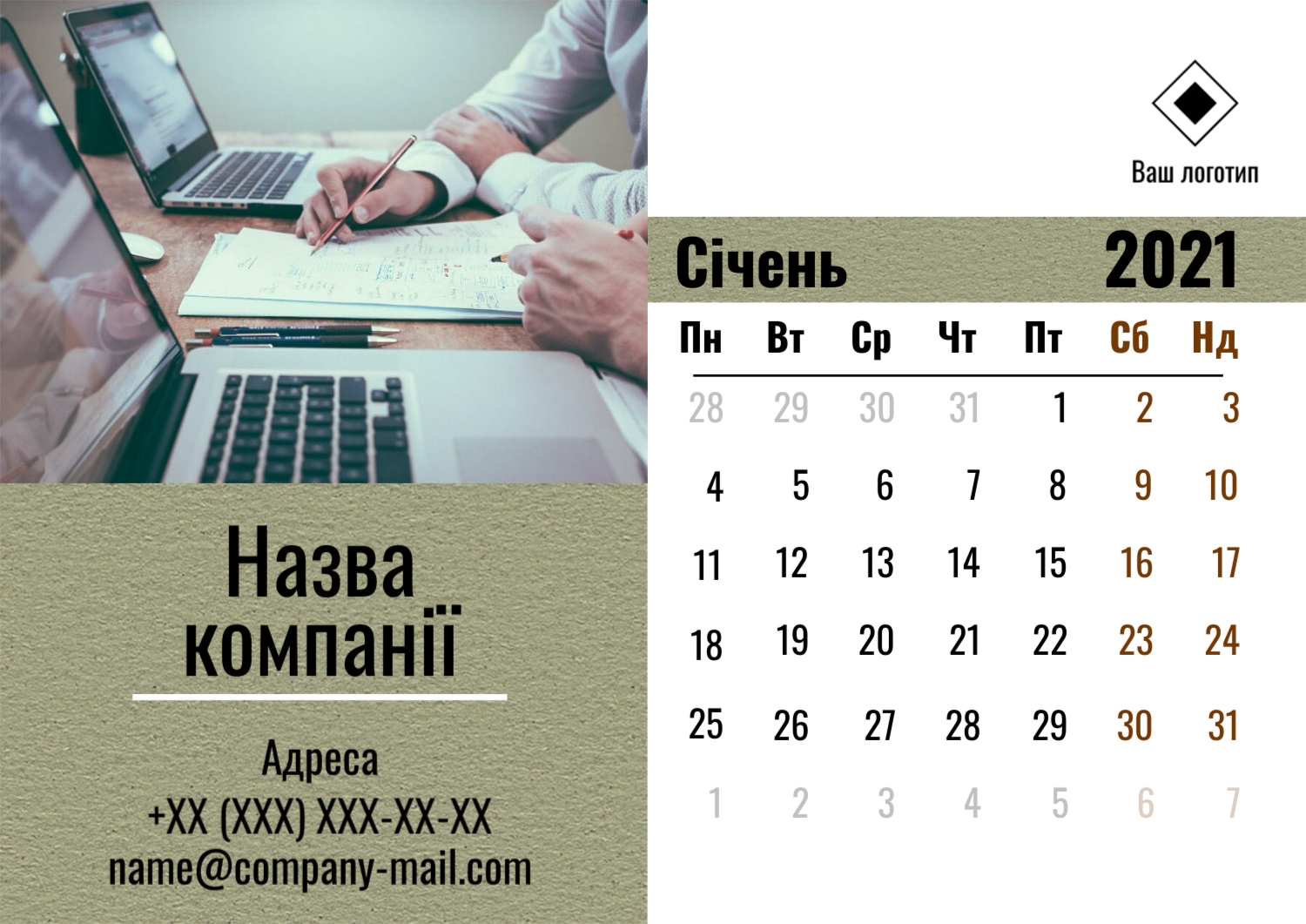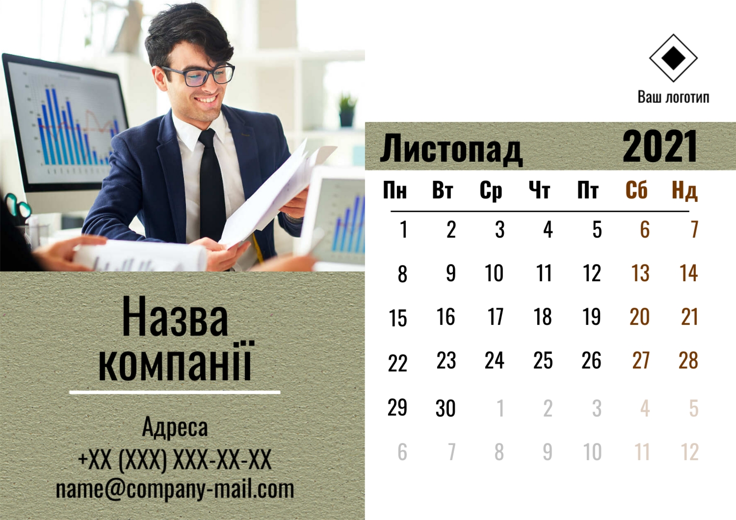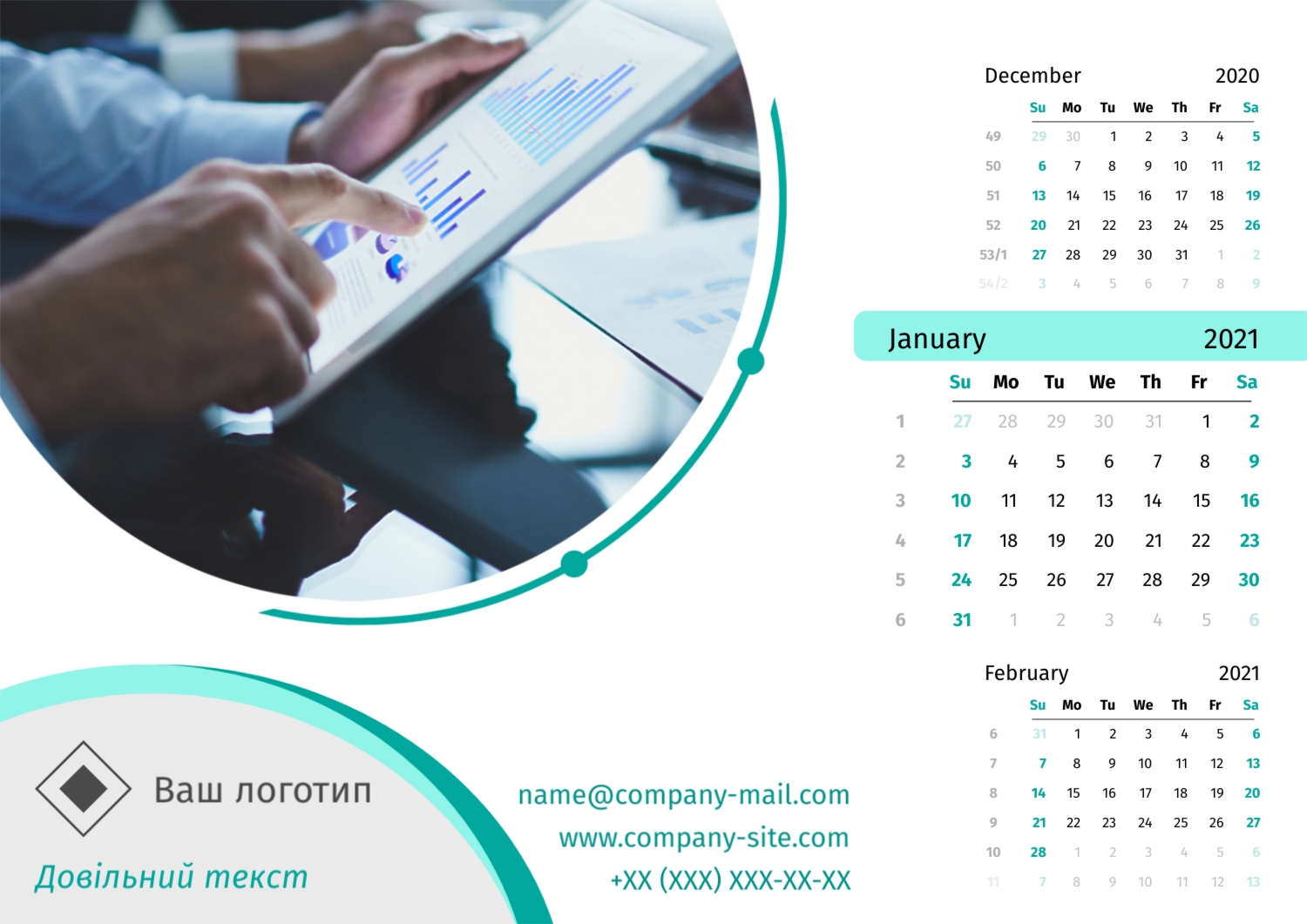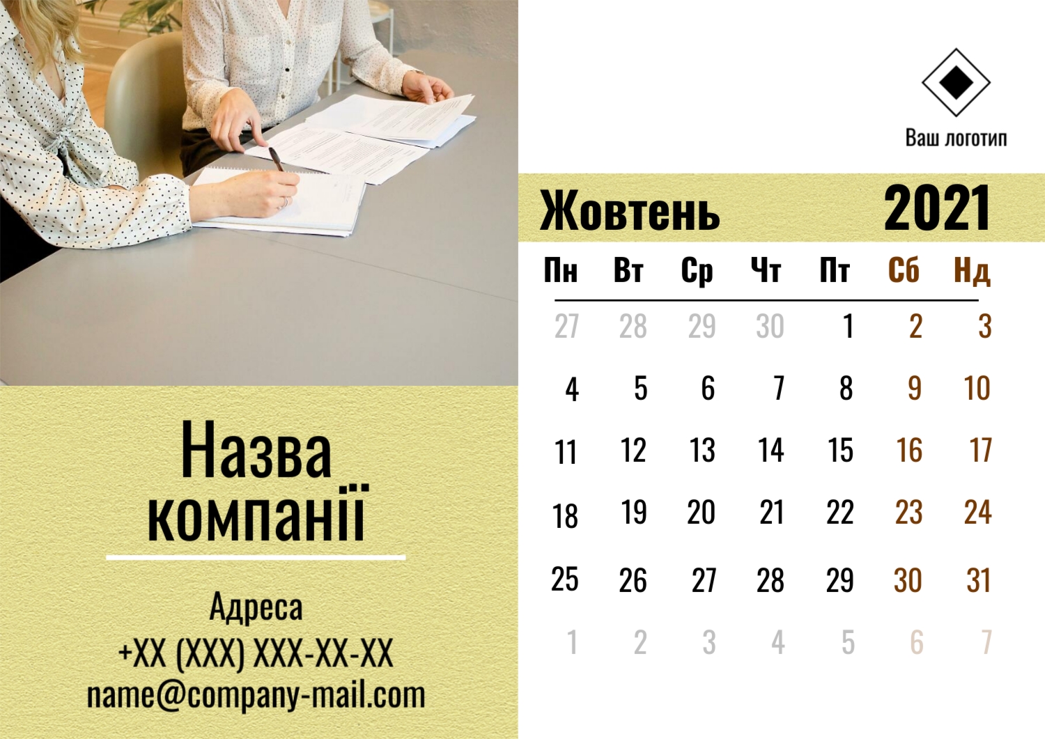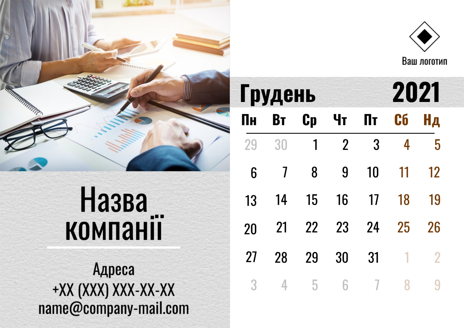 Безкоштовний шаблон настінного бізнес календаря для реклами вашої компанії, товарів або послуг, з можливістю редагування його в конструкторі календарів.