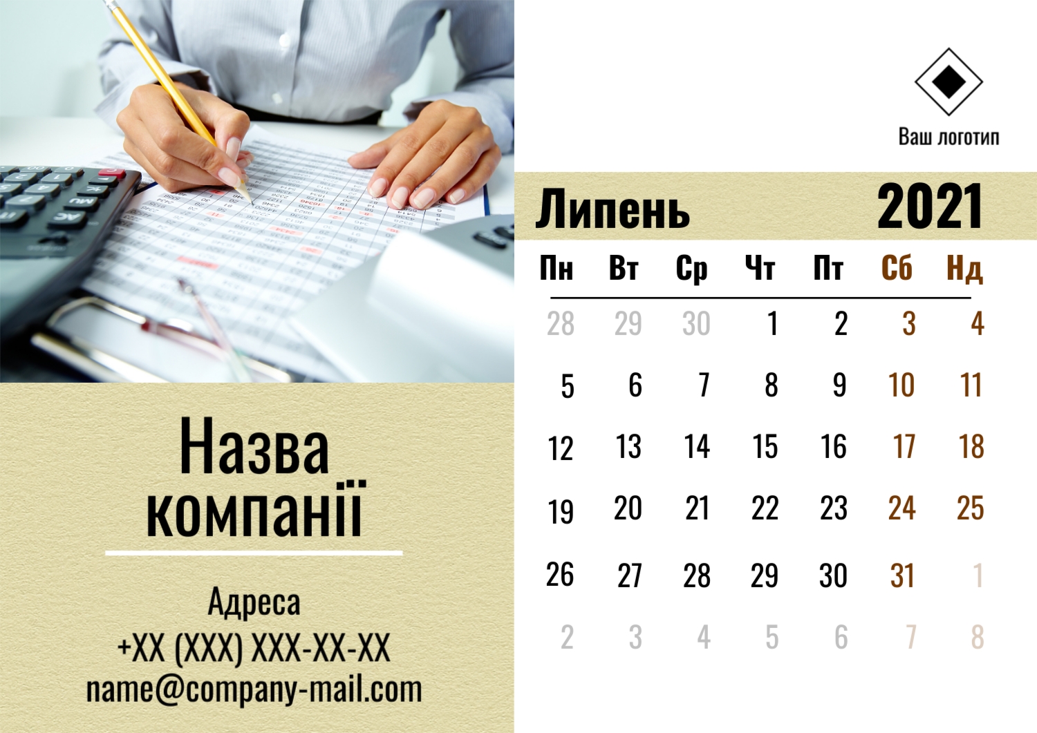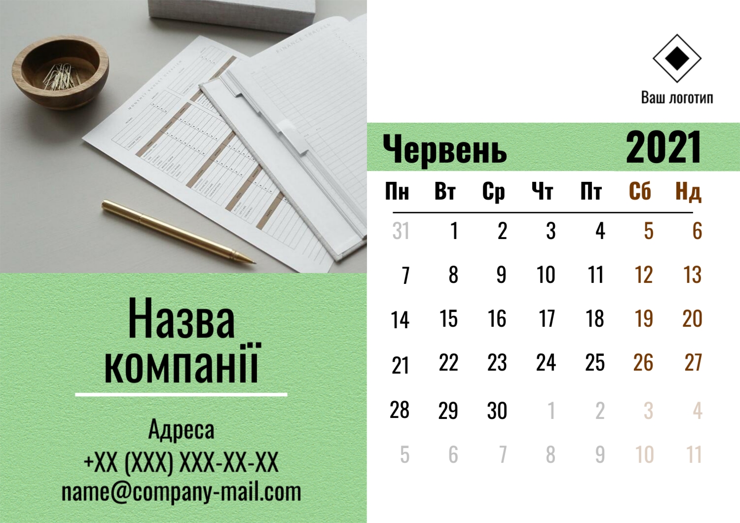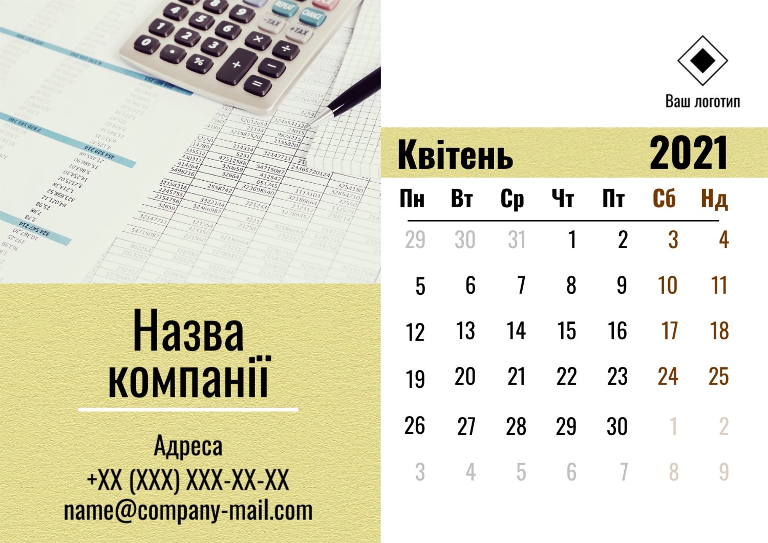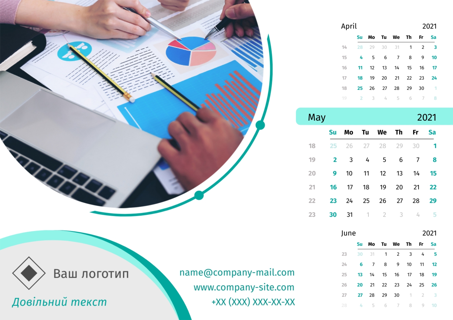 Безкоштовний шаблон настінного бізнес календаря для реклами вашої компанії, товарів або послуг, з можливістю редагування його в конструкторі календарів.