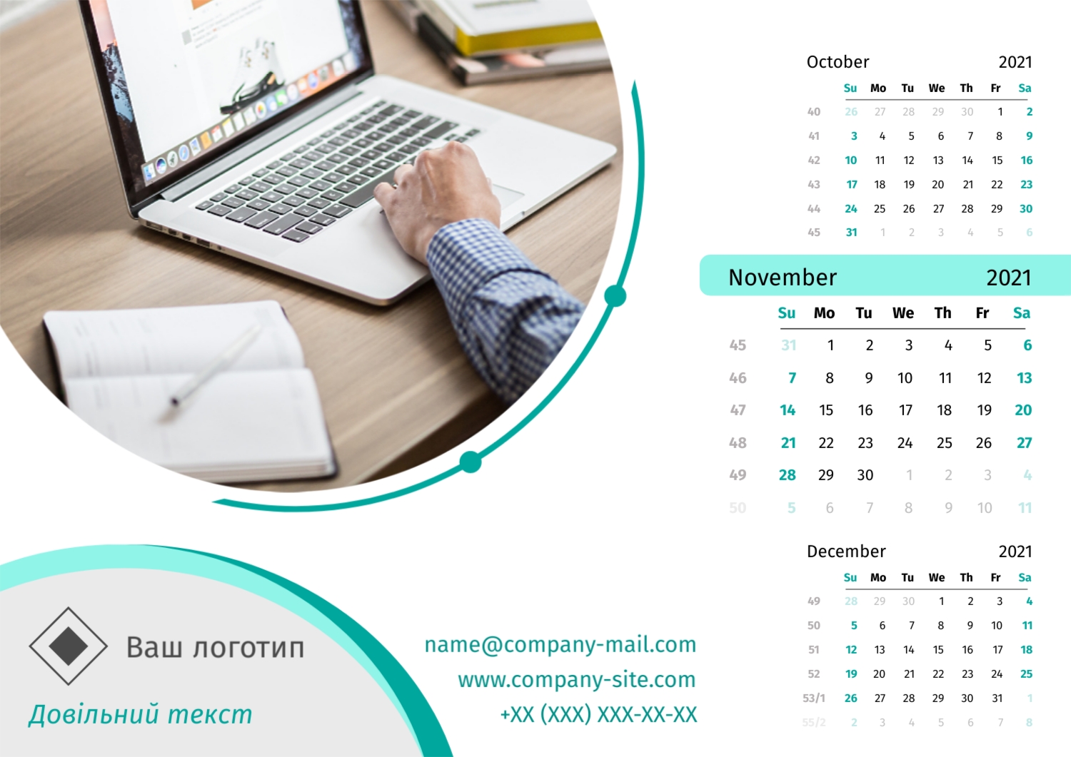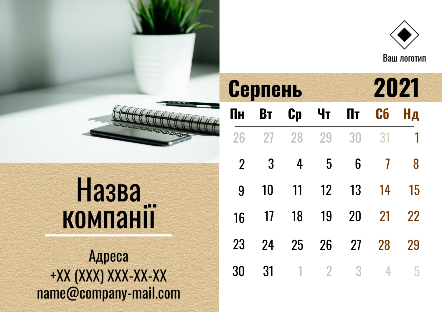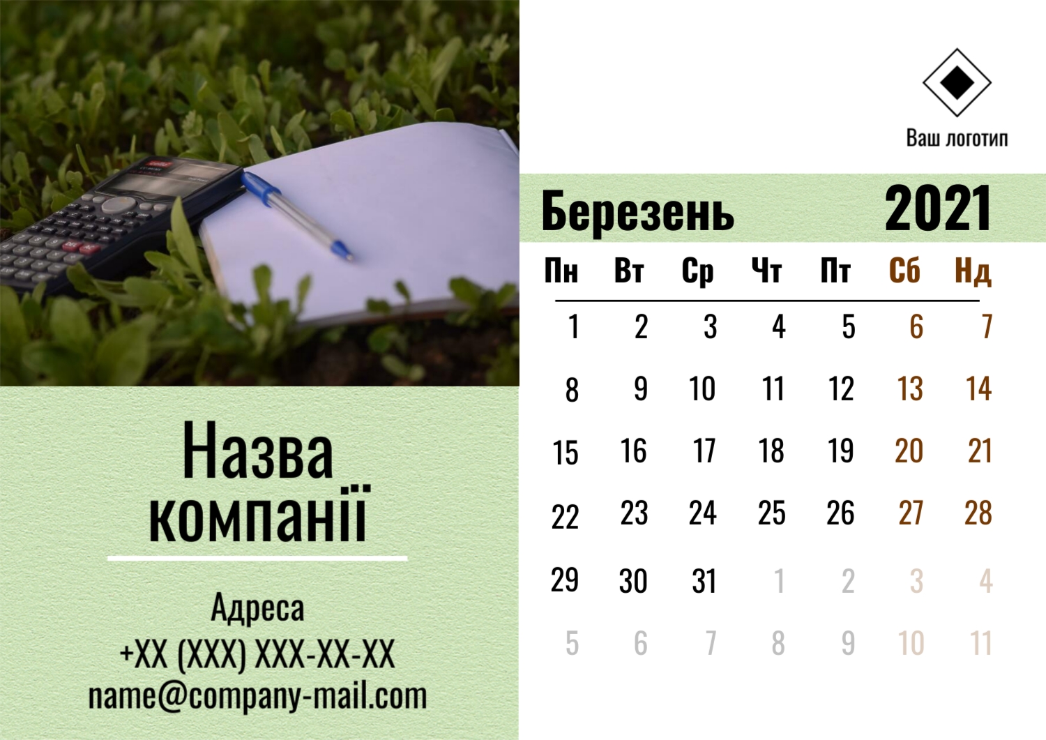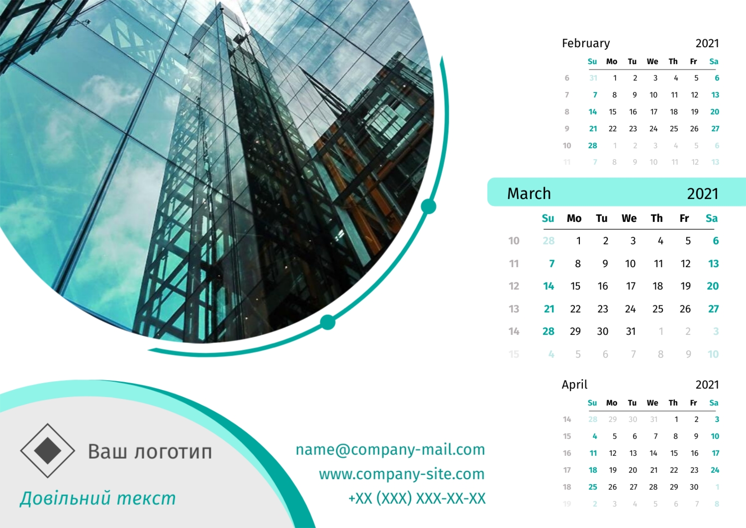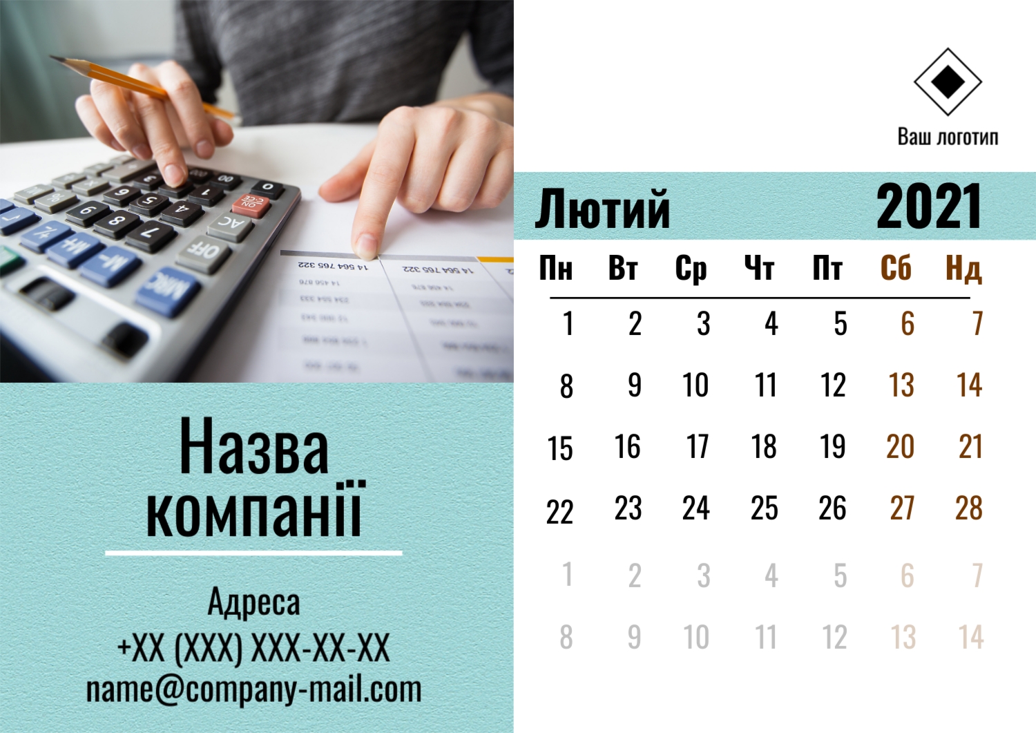 Безкоштовний шаблон настінного бізнес календаря для реклами вашої компанії, товарів або послуг, з можливістю редагування його в конструкторі календарів.