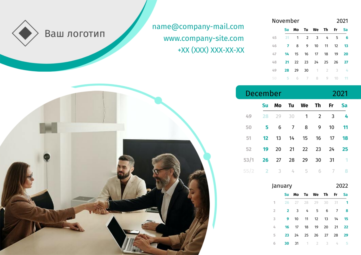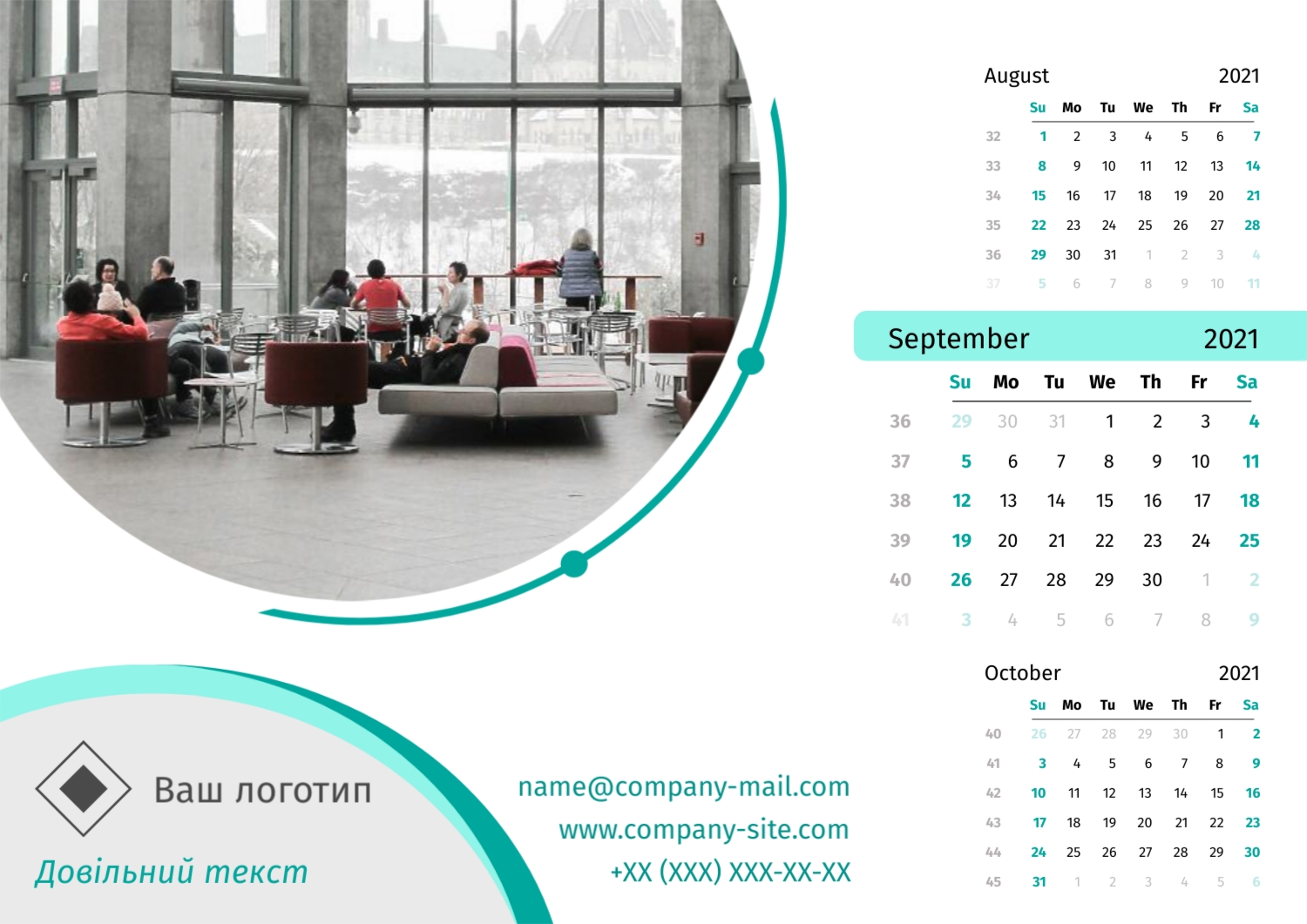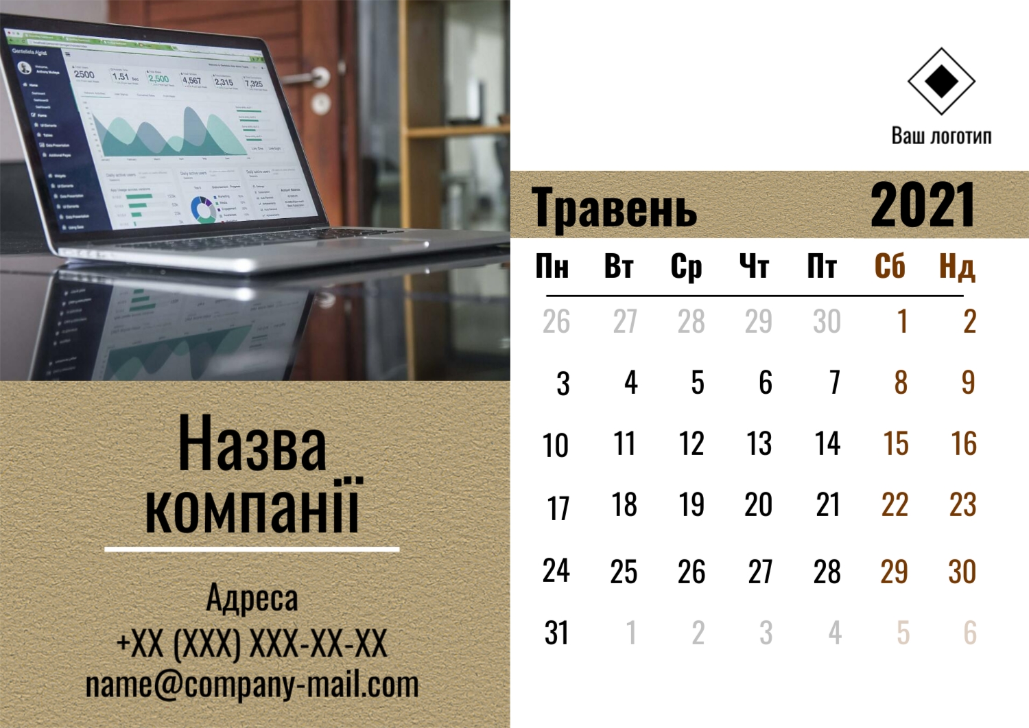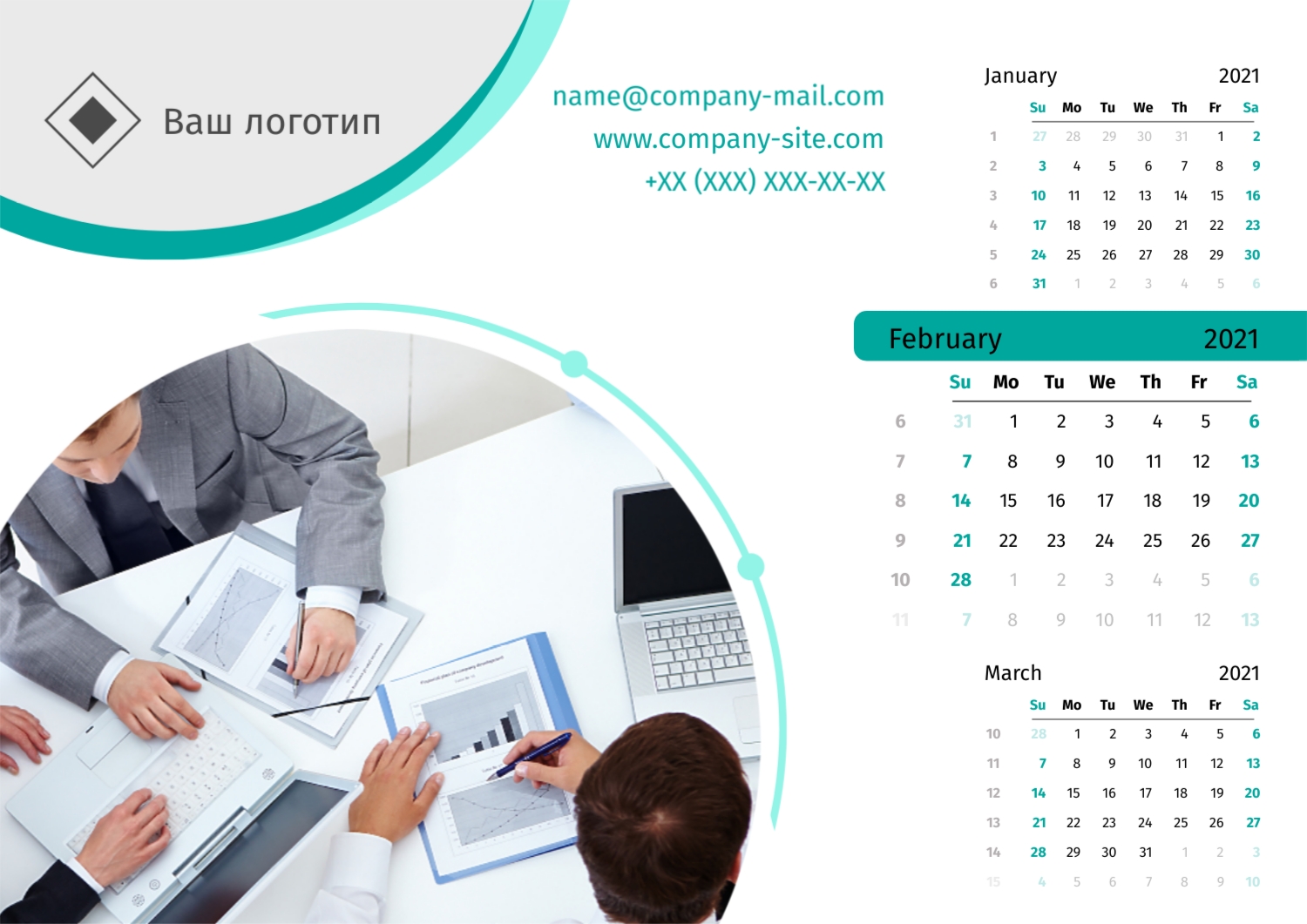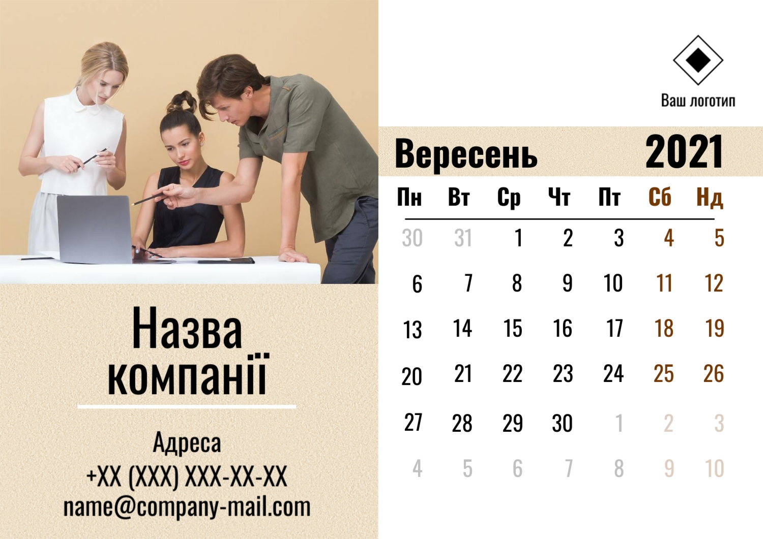 Безкоштовний шаблон настінного бізнес календаря для реклами вашої компанії, товарів або послуг, з можливістю редагування його в конструкторі календарів.