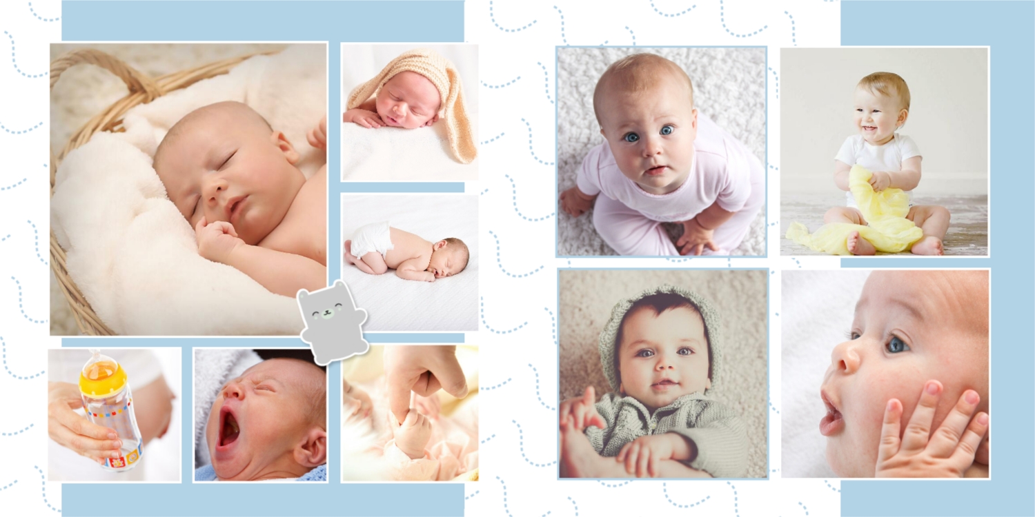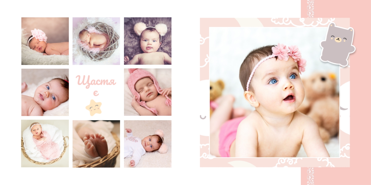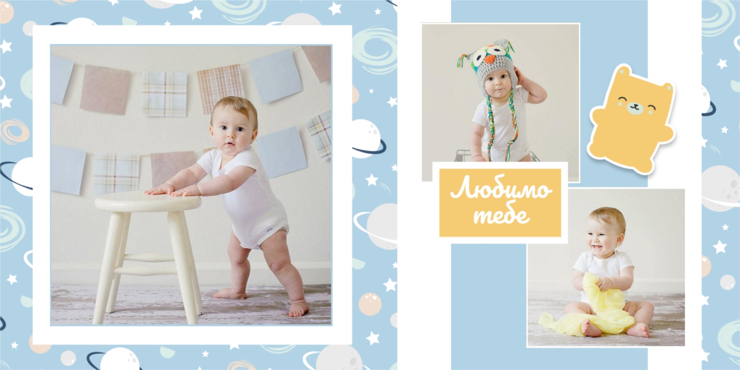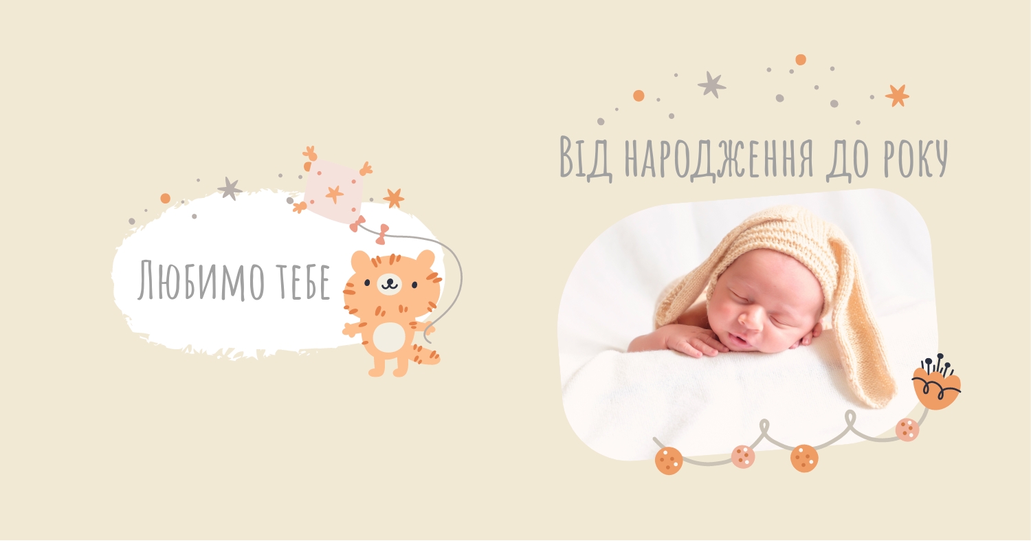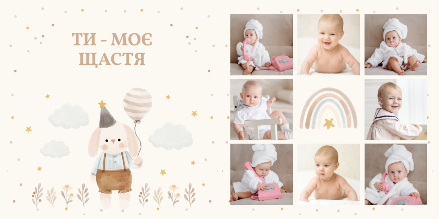 Безкоштовний шаблон дитячої фотокниги від народження до року. Створіть макет власноруч в онлайн-конструкторі фотокниг.