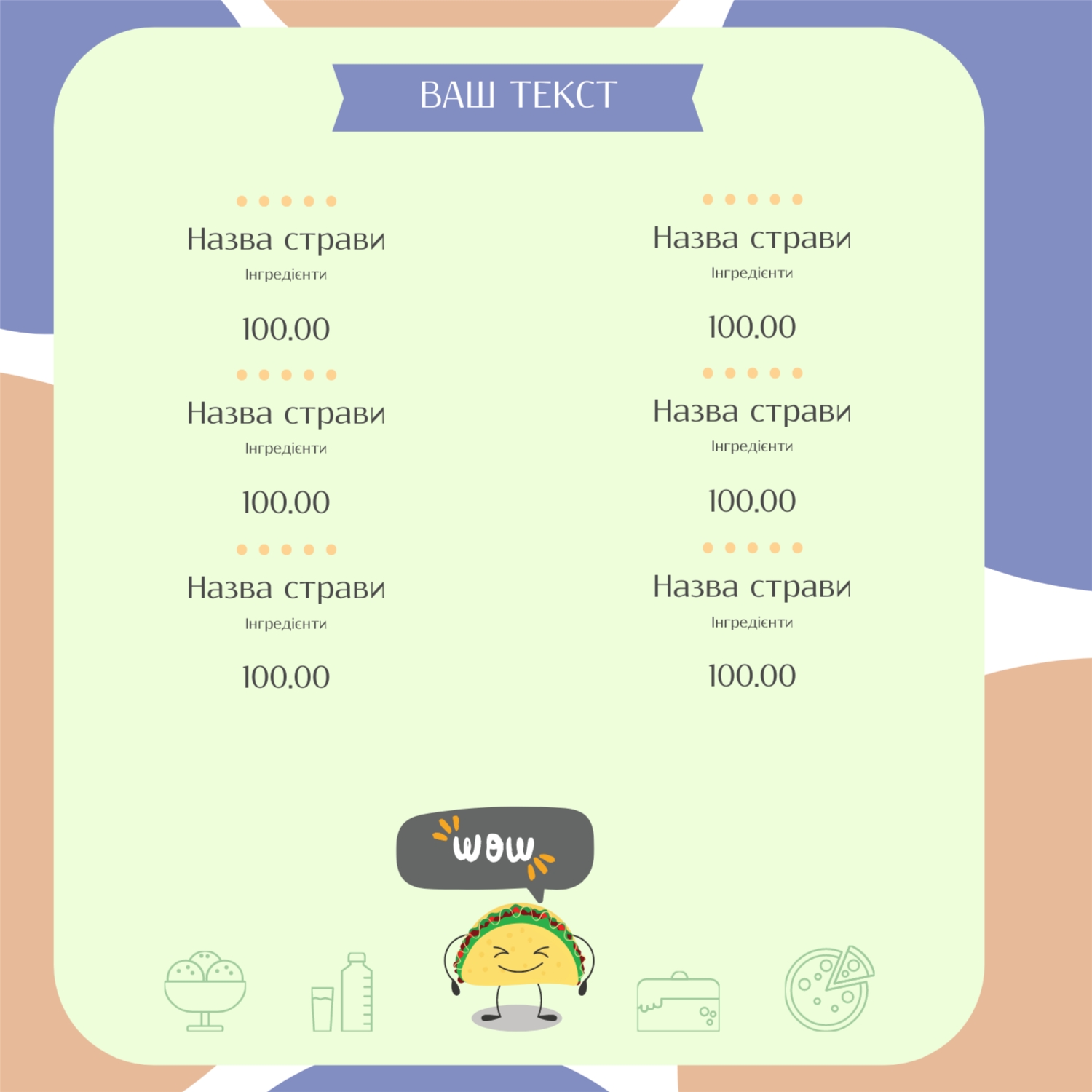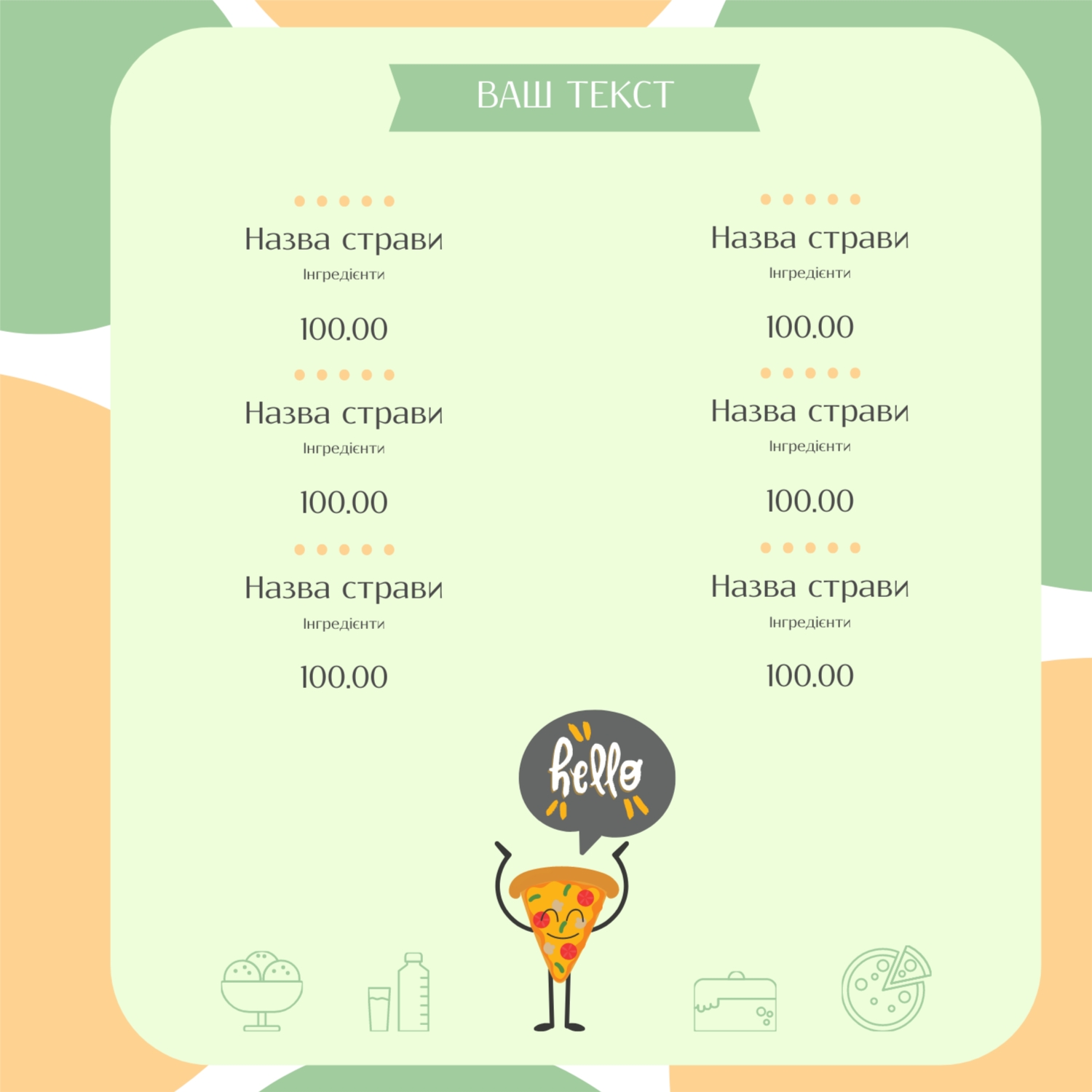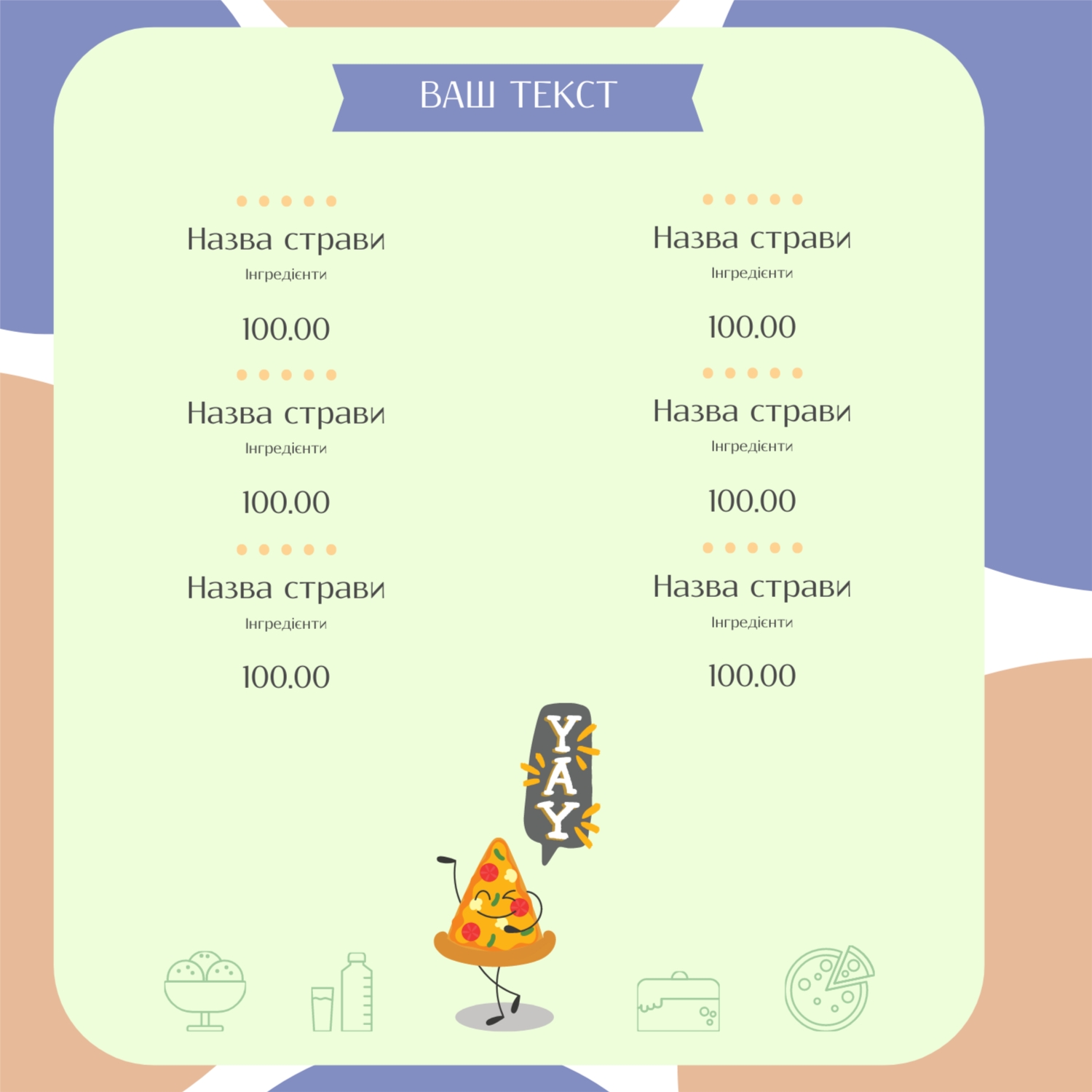 Безкоштовний шаблон меню для дитячого кафе, ресторану швидкого харчування. Створіть макет своїми руками в онлайн-конструкторі меню.