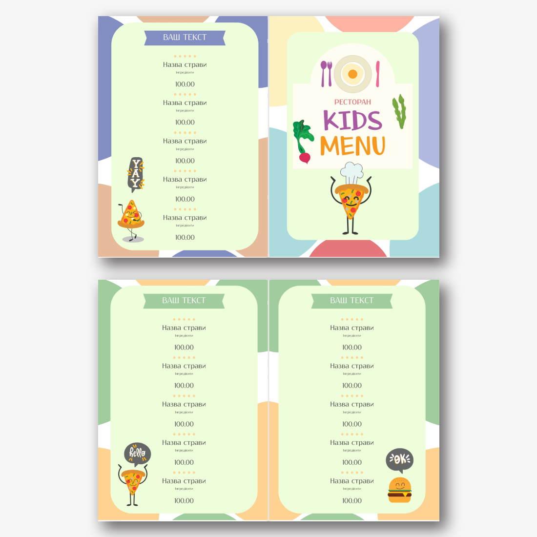 Безкоштовний шаблон меню для дитячого кафе, ресторану швидкого харчування. Створіть макет своїми руками в онлайн-конструкторі меню.