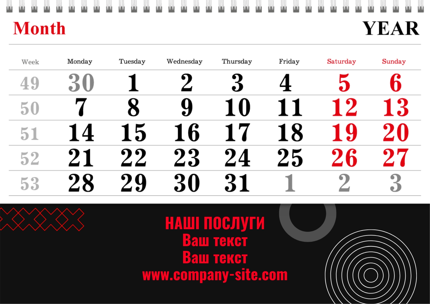 Безкоштовний шаблон квартального рекламного календаря для реклами спа салону. Створіть макет своїми руками в конструкторі календарів.