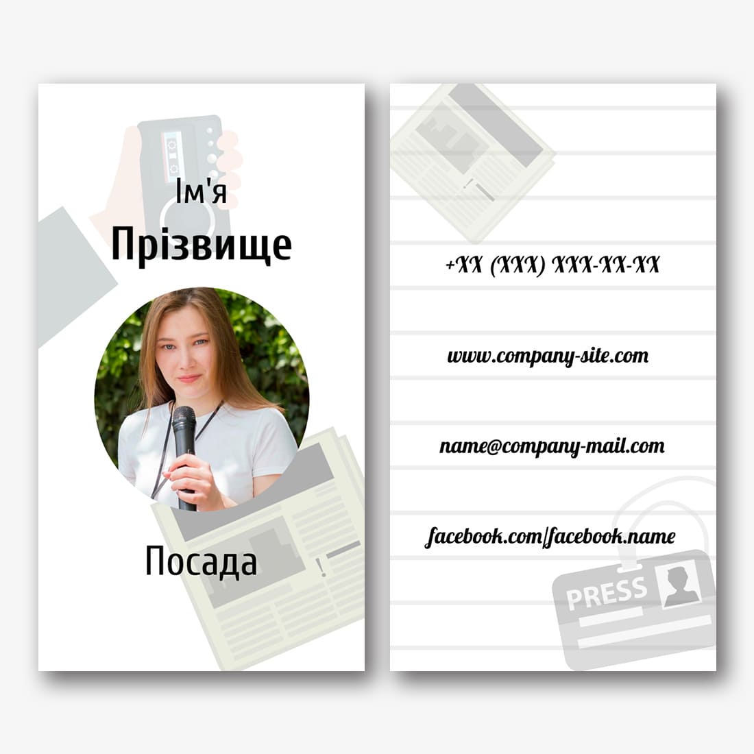Безкоштовний шаблон візитки журналіста, кореспондента, репортера, видавництв. Створіть макет своїми руками в конструкторі візиток.