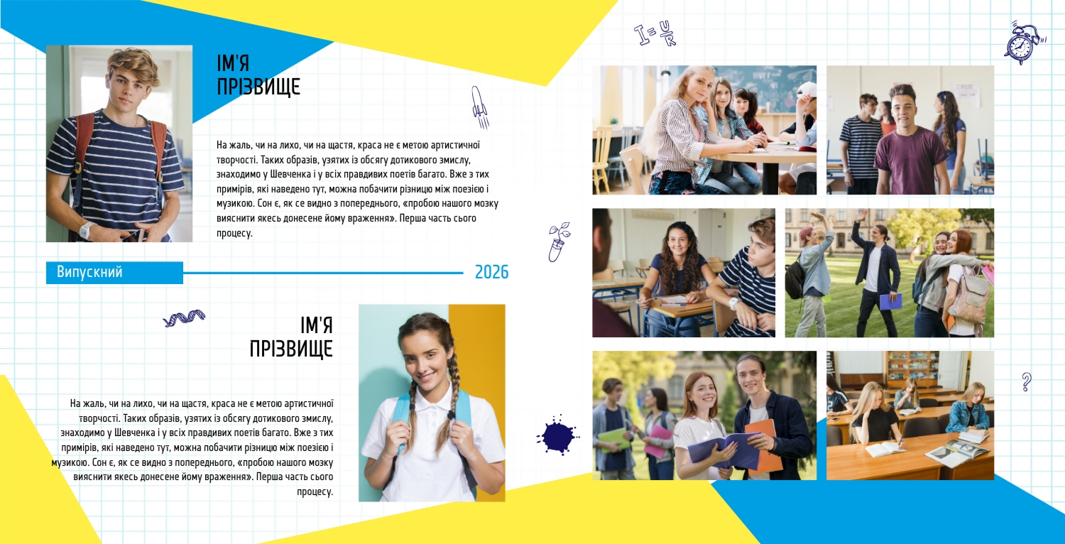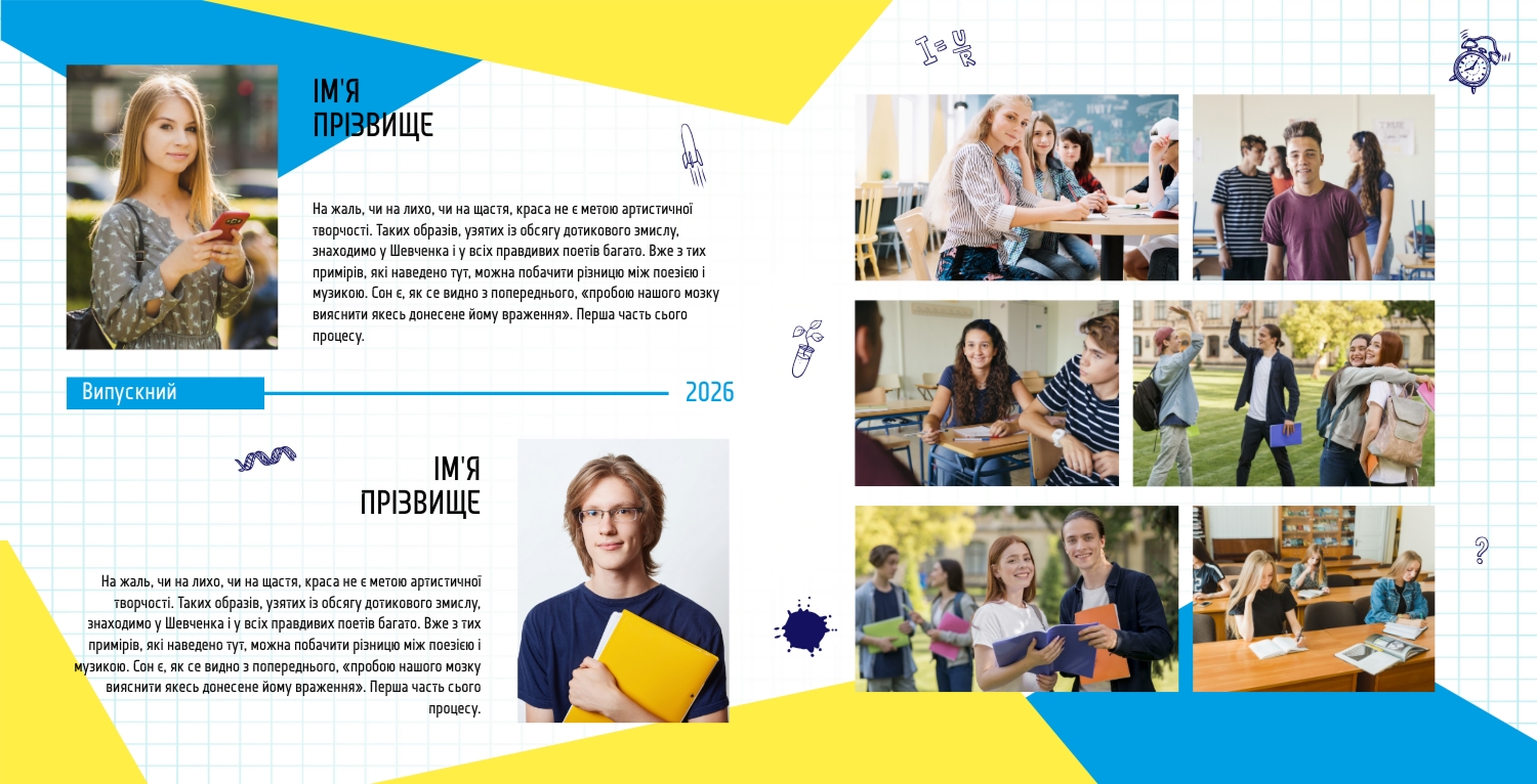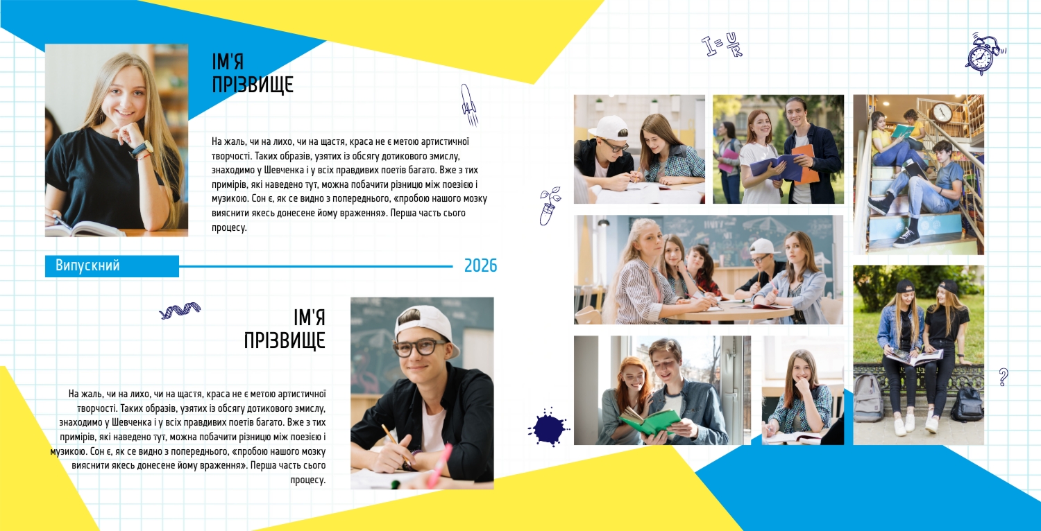 Процес нескладний: ви вибираєте розмір, стиль, кількість сторінок — і ми починаємо друк фотокниг з урахуванням всіх ваших побажань. Наш онлайн-конструктор дозволяє створити макет самостійно або скористатися послугою дизайну. Також доступна персоналізація: в кожній книзі можна виділити одну або кілька сторінок для конкретного випускника.